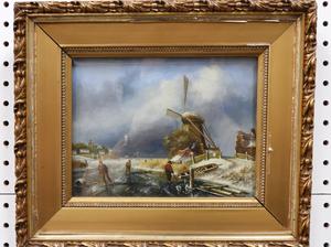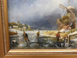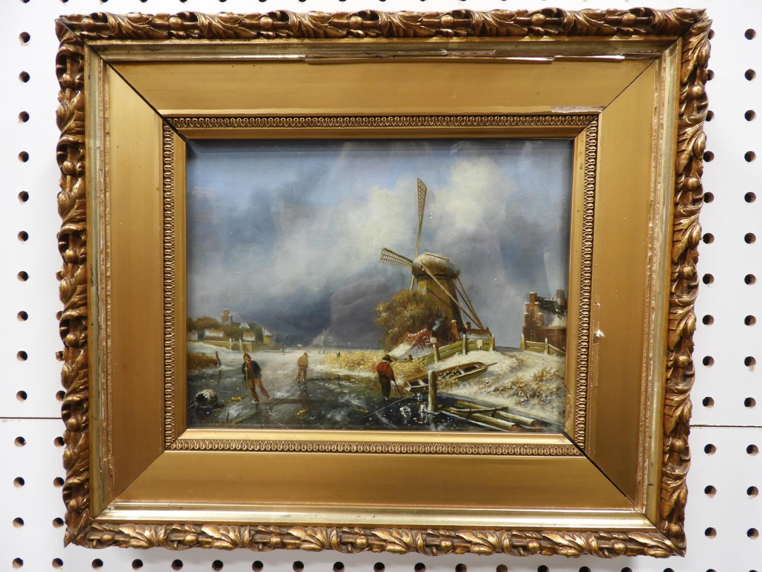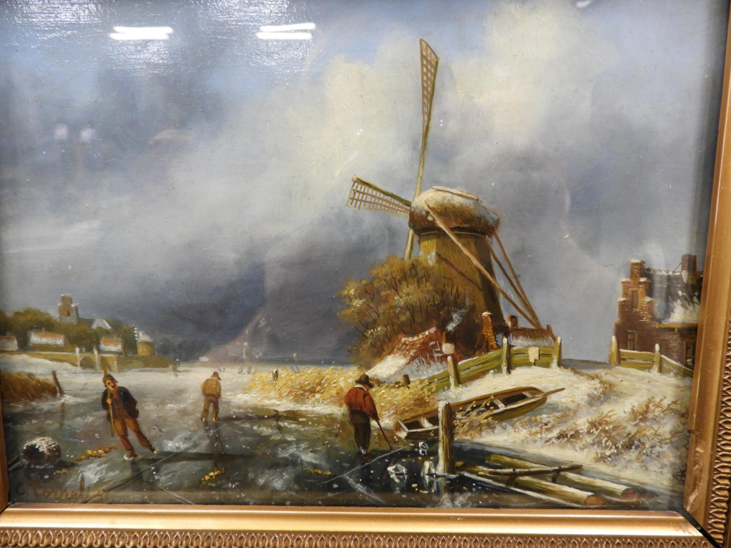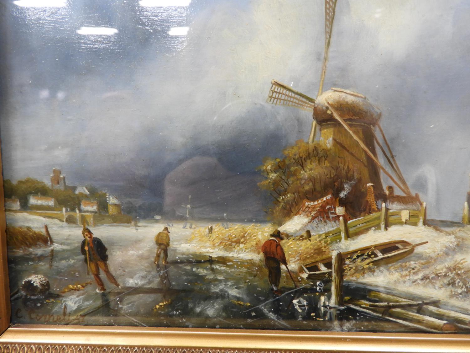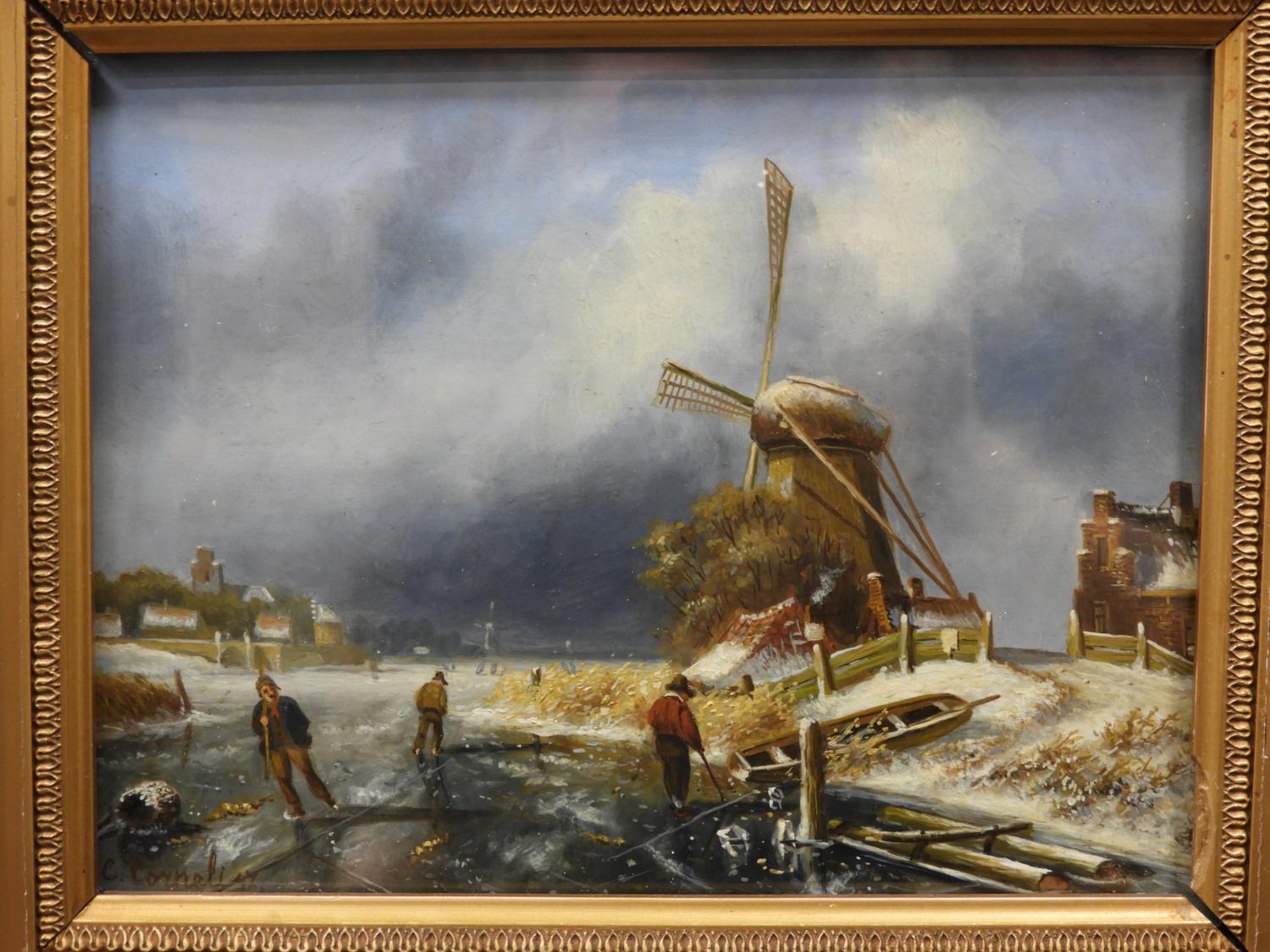 c. cornelisz, 1949. oil on panel, 8" x 10", "dutch winter scene with ice skaters".