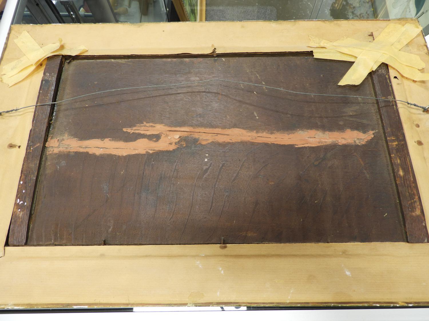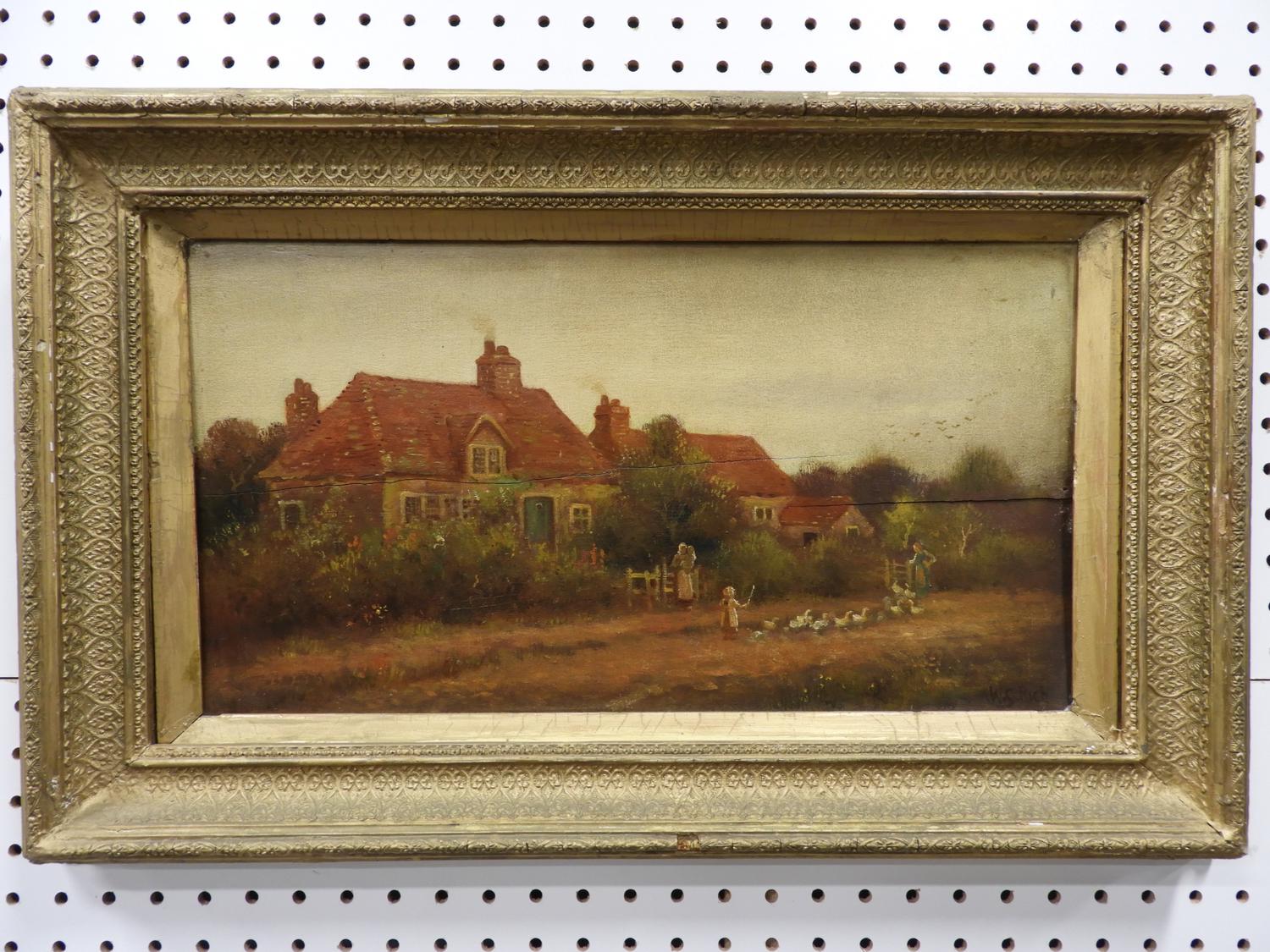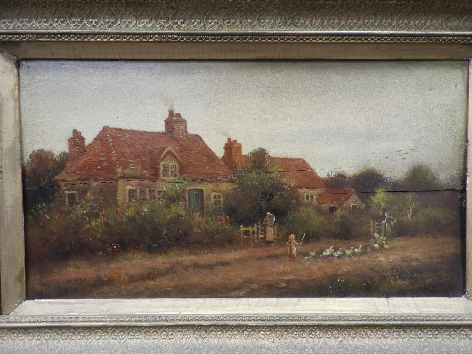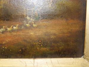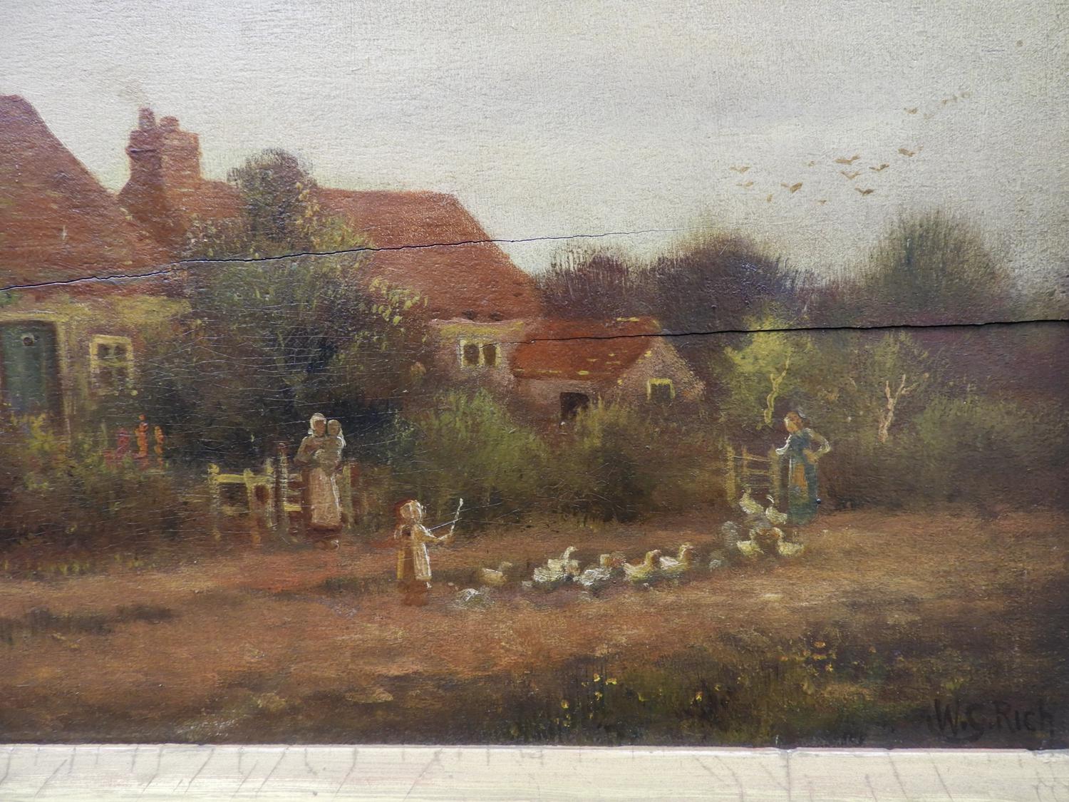 william george rich, oil on panel, 10" x 18", "farm house with figures leading ducks".