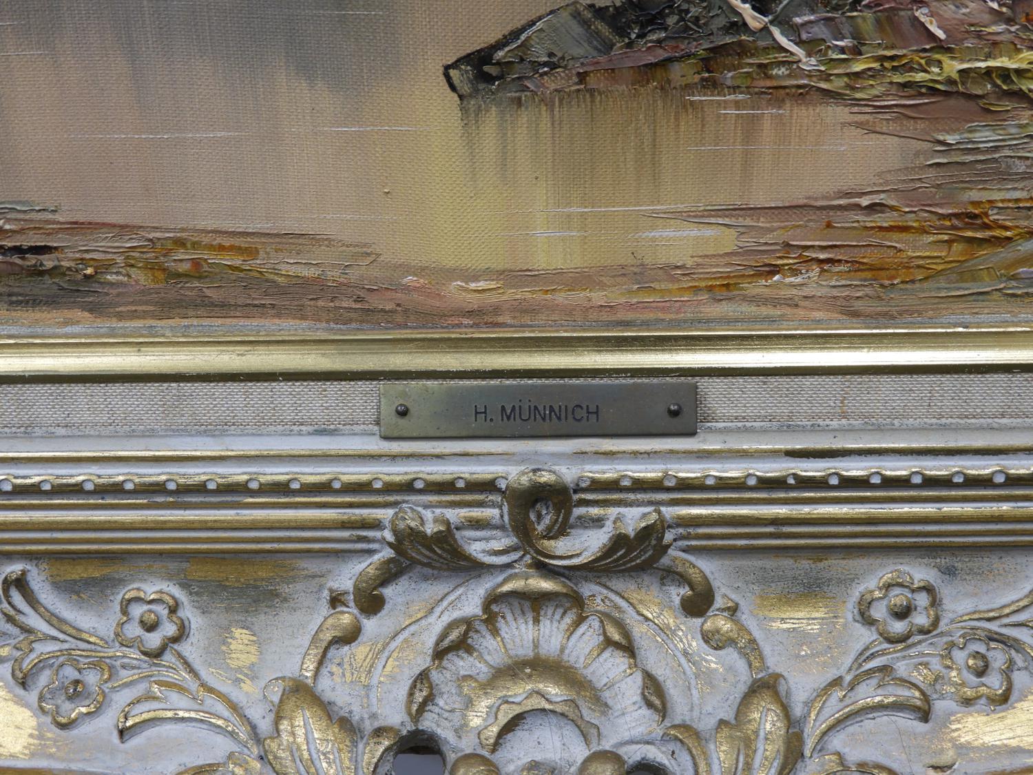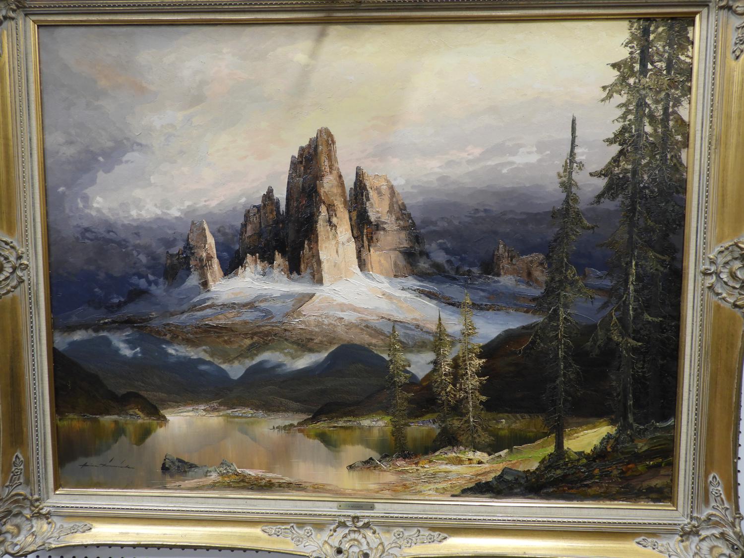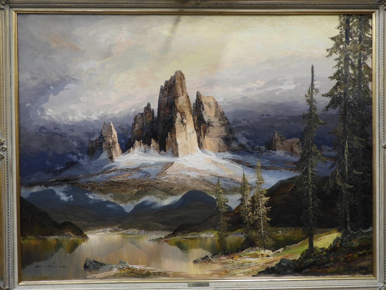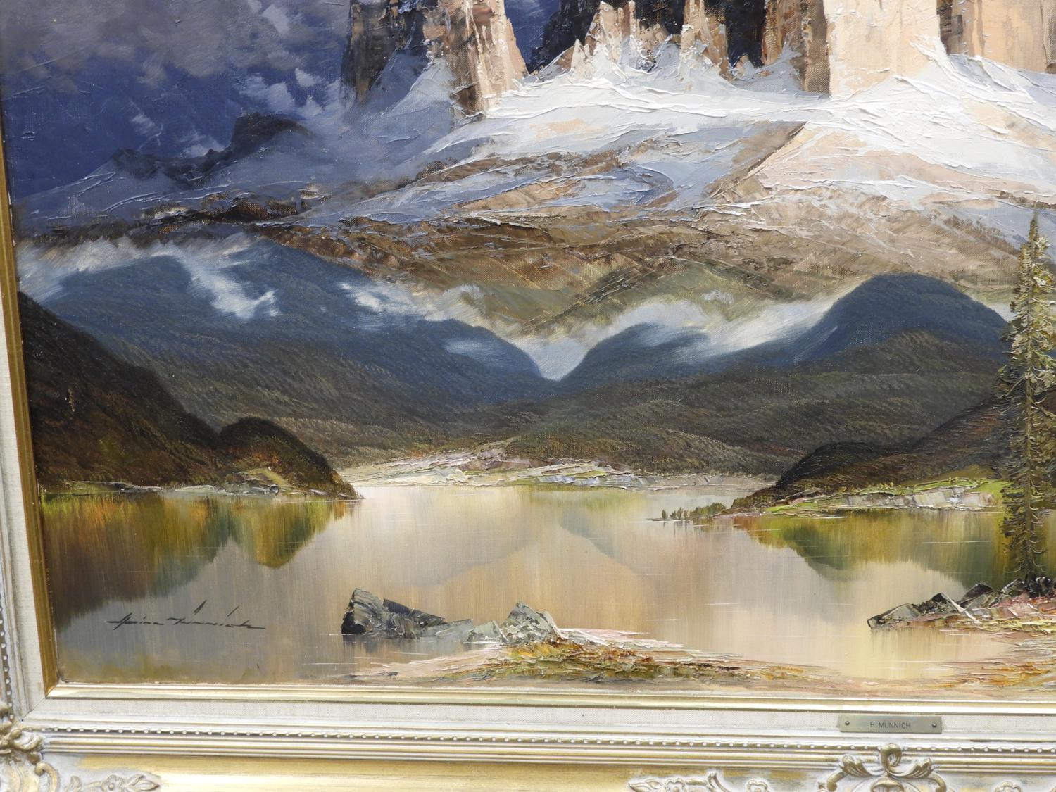 h. munnich, oil on canvas, 40" x 60", "mountain landscape".