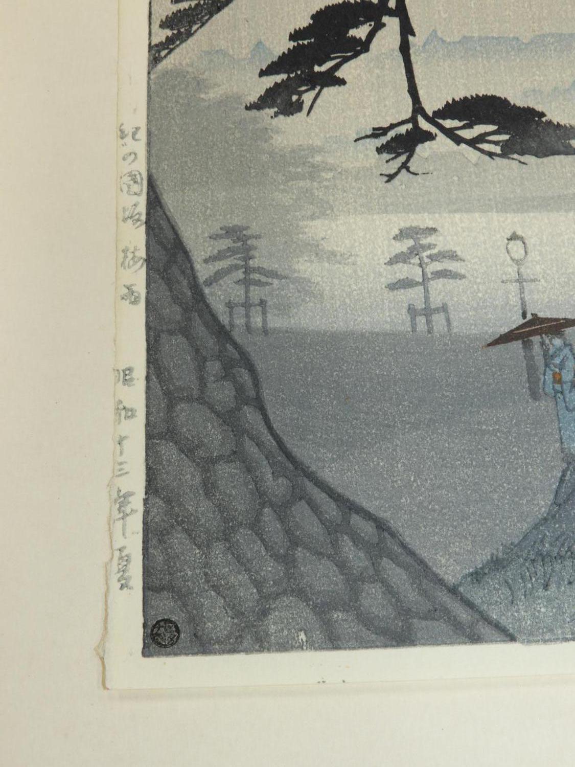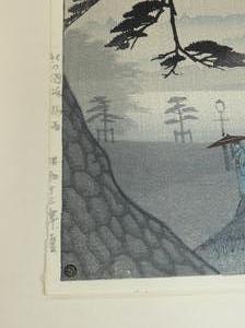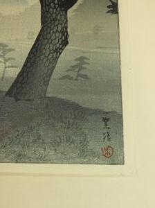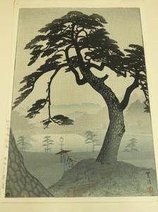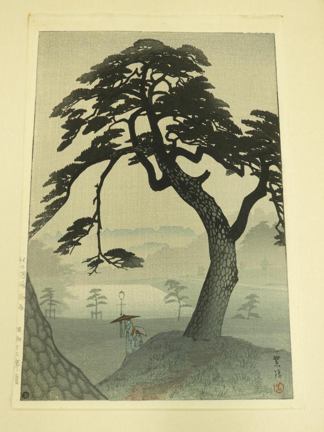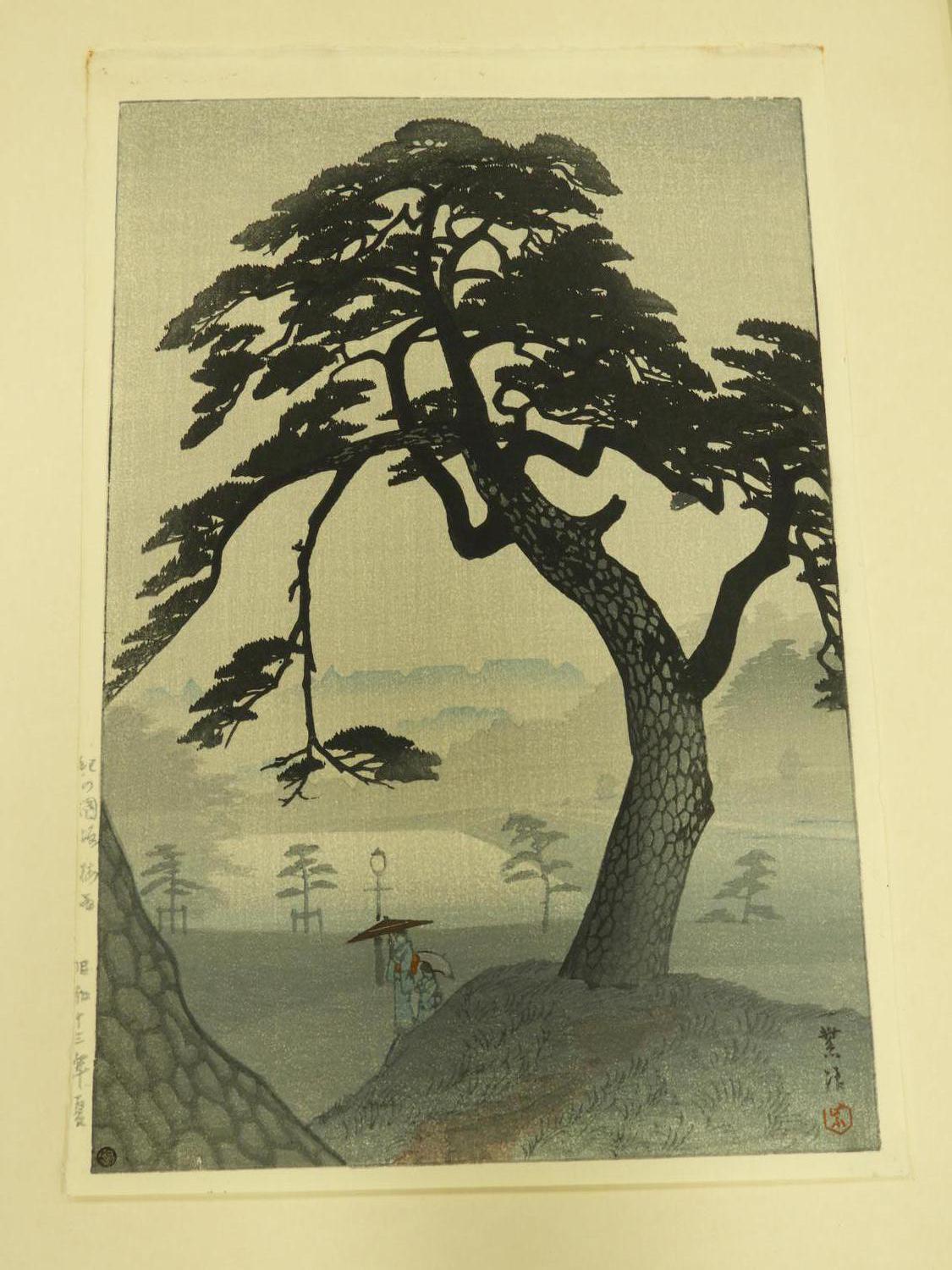 japanese woodblock print signed with chop block, early 20th century, 14" x 9 1/2", "landscape with tree and figures"
