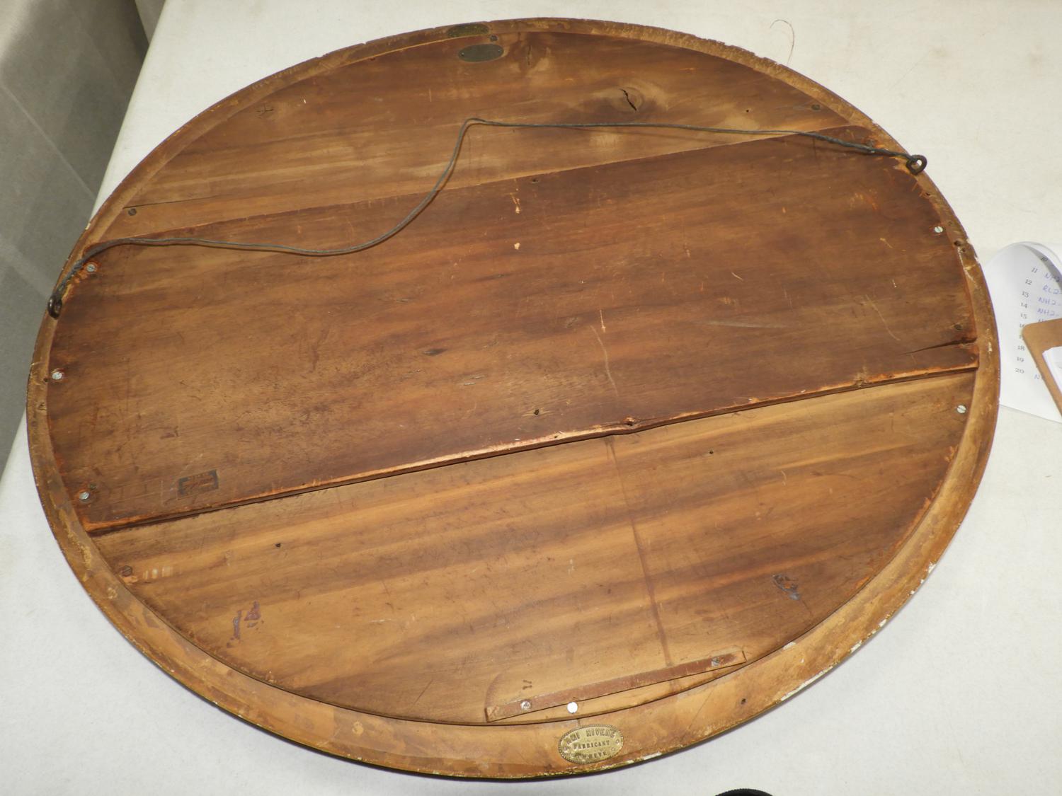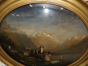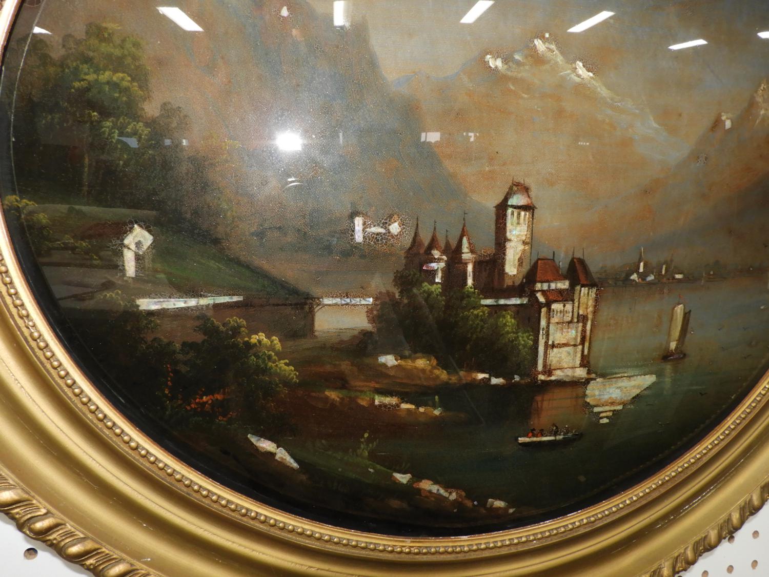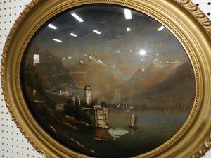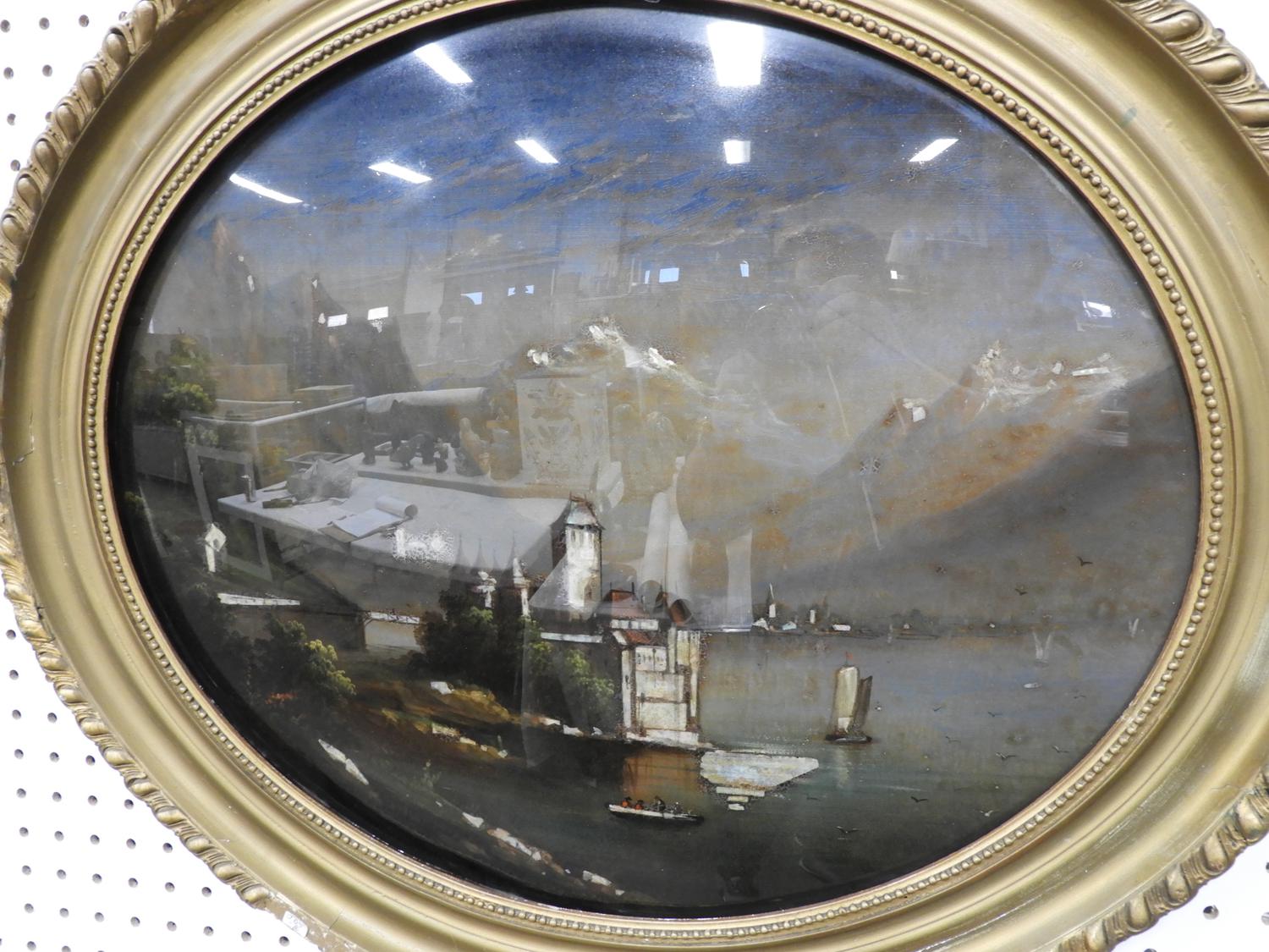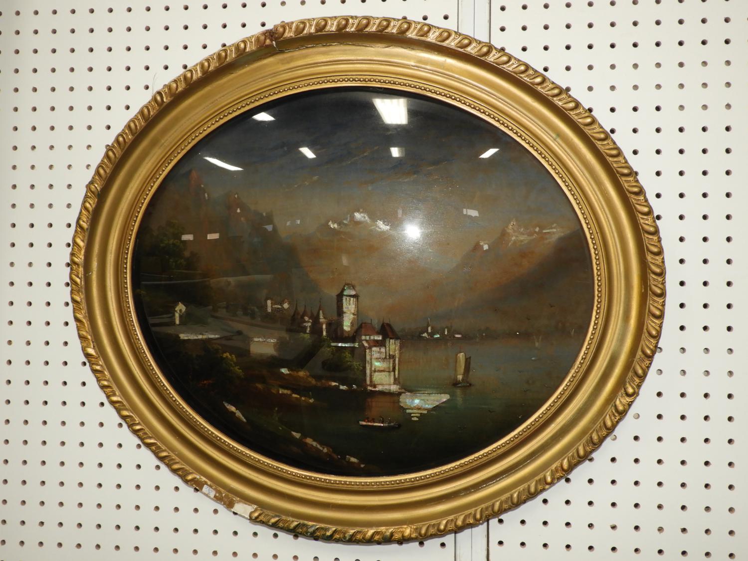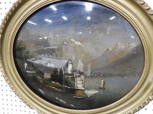 gilt framed oval reverse painting on glass with m.o.p. inlays, 18" x 20", "coastal scene with boats".