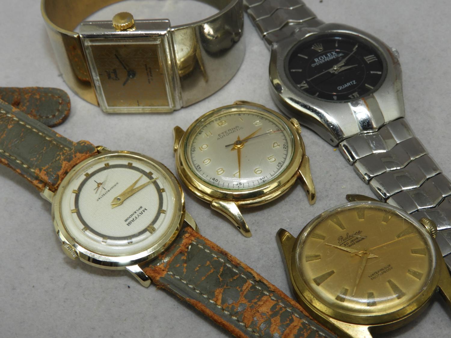 lot of five gents watches including vintage gf eterna automatic and faux rolex