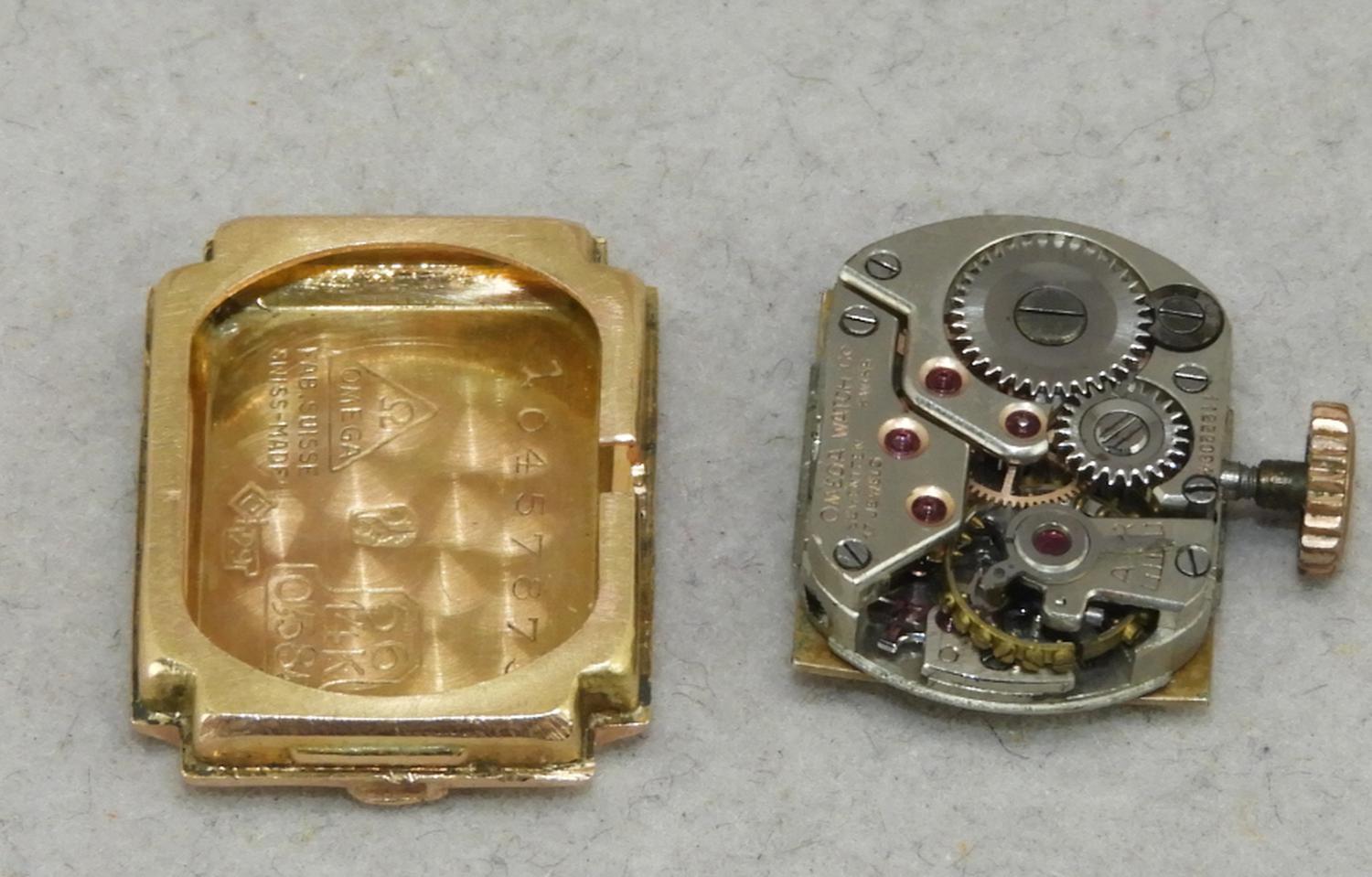 ladies 14k pink gold omega watch, case # 0457873, 17jewel movement signed #1122094