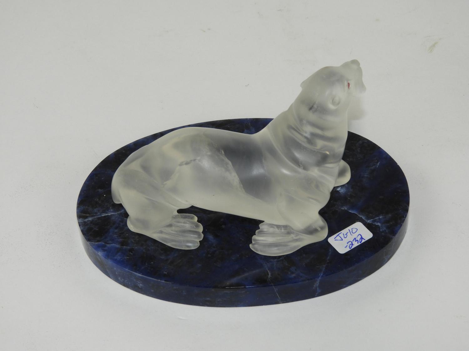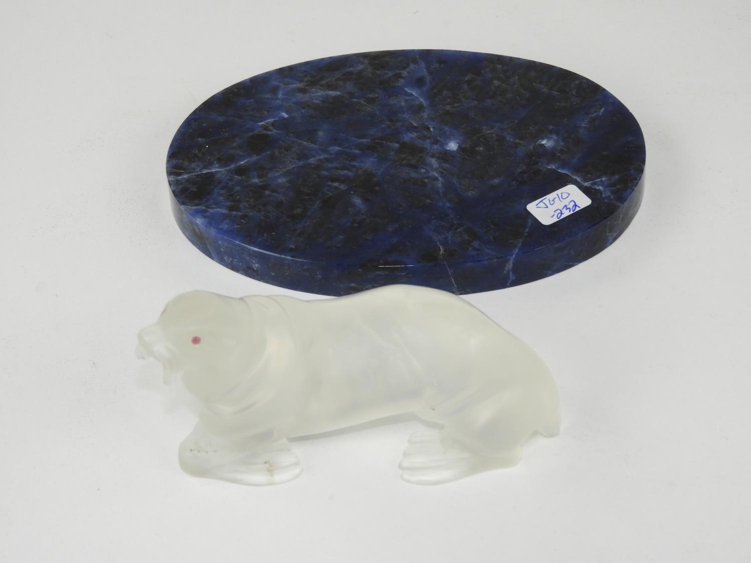 chinese carved rock crystal seal with ruby eyes on sodalite stand, 3" x 5 1/2"