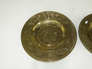 two chinese heavy brass chargers, signed, dia 11" and smaller