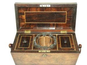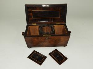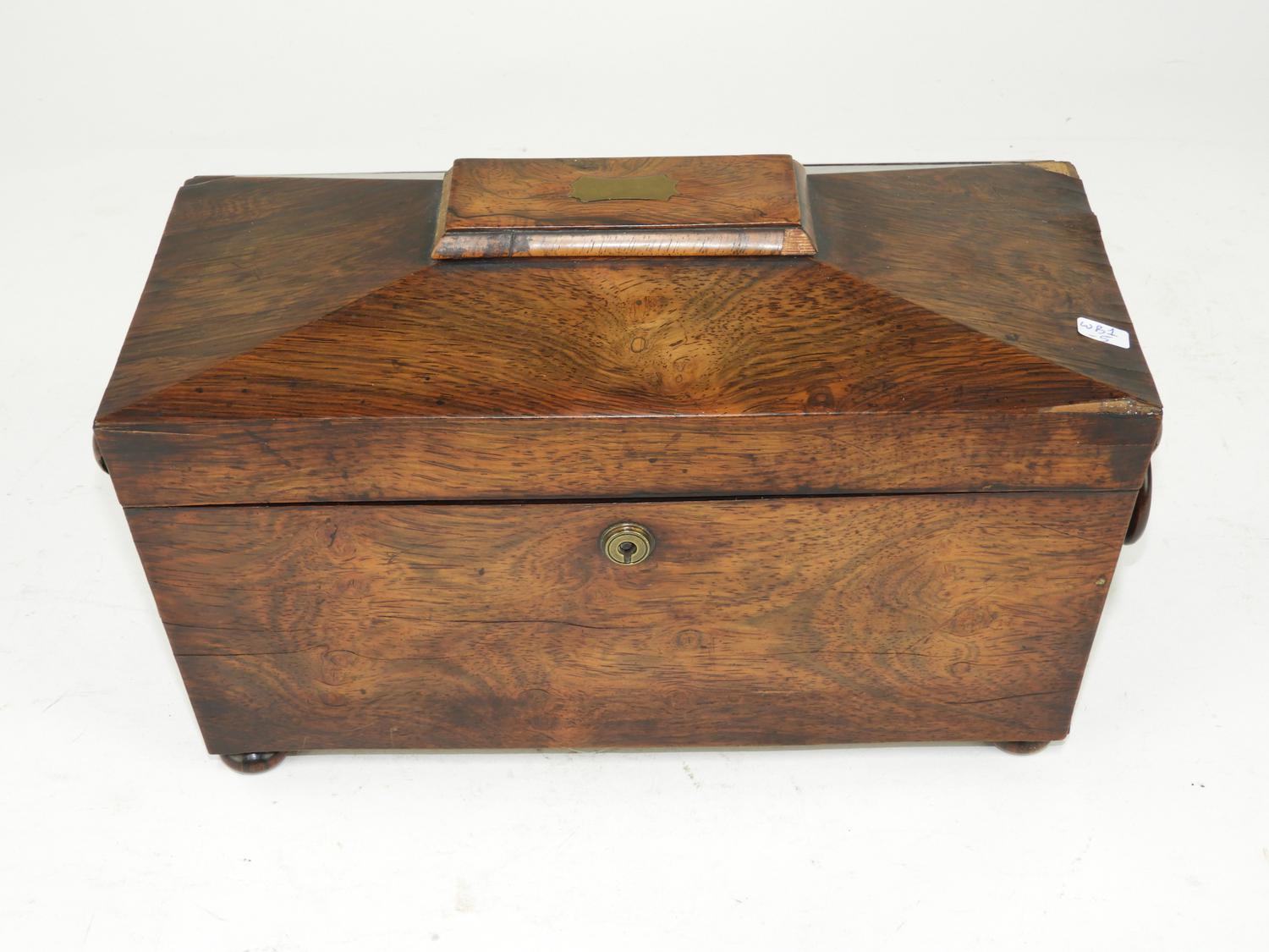 19th century rosewood tea caddy with fitted interior, 7" x 13" x 6"