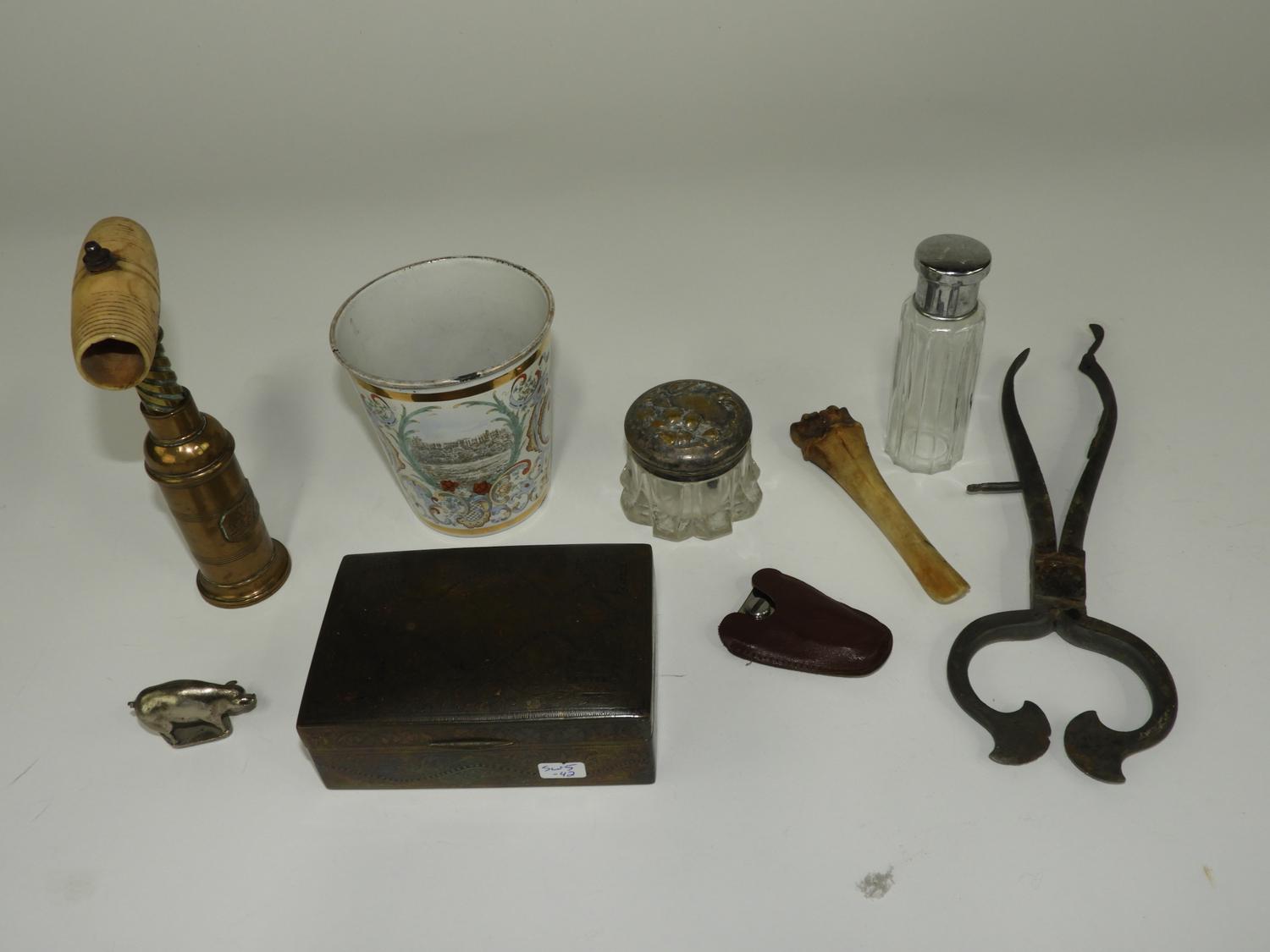 lot: cork screw, carved bone, enamel cup, eastern metalwork box, etc.