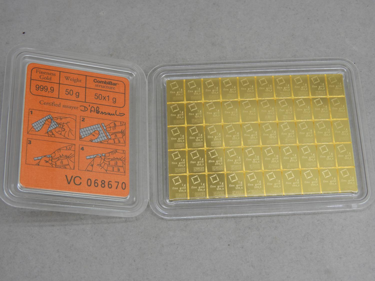 valcambi suisse comibar 50 gram 999.9 fine gold wafter bar