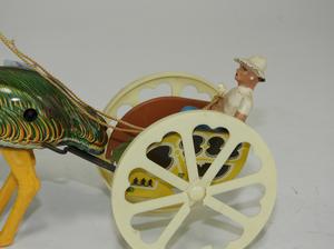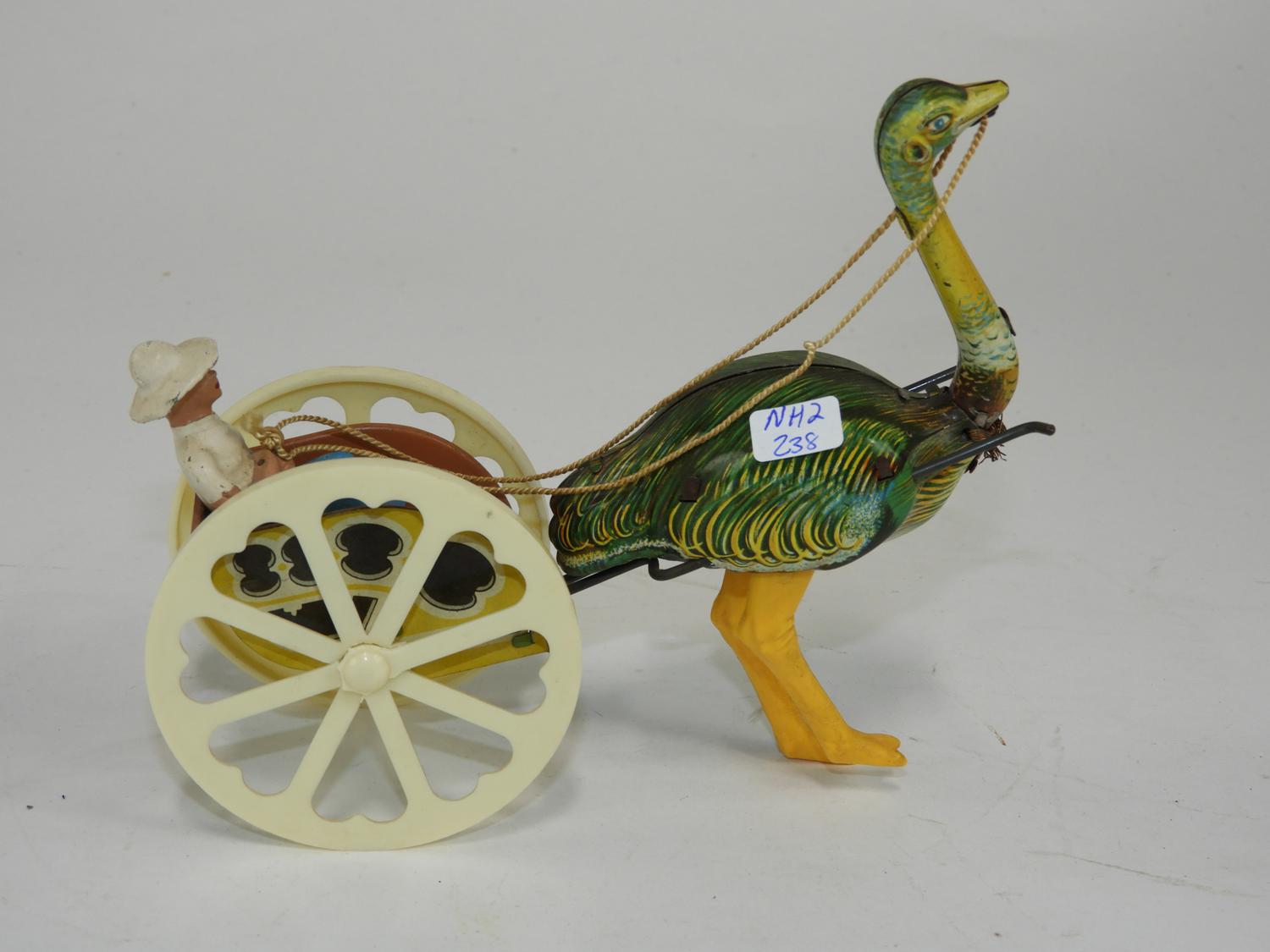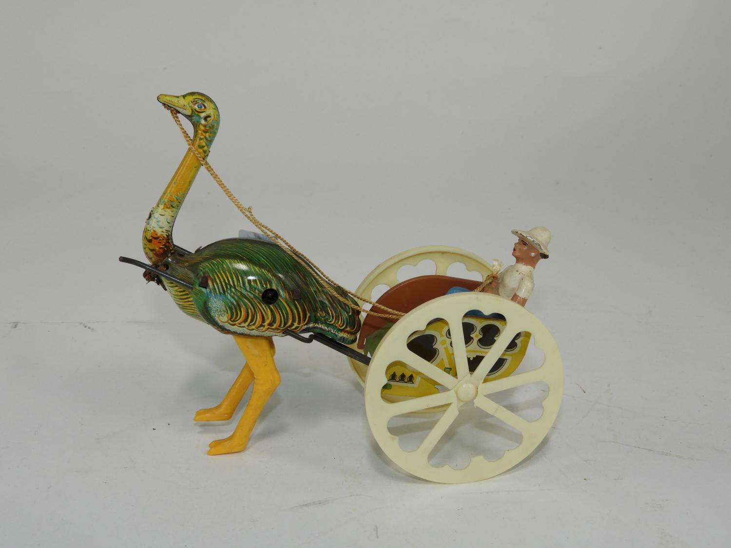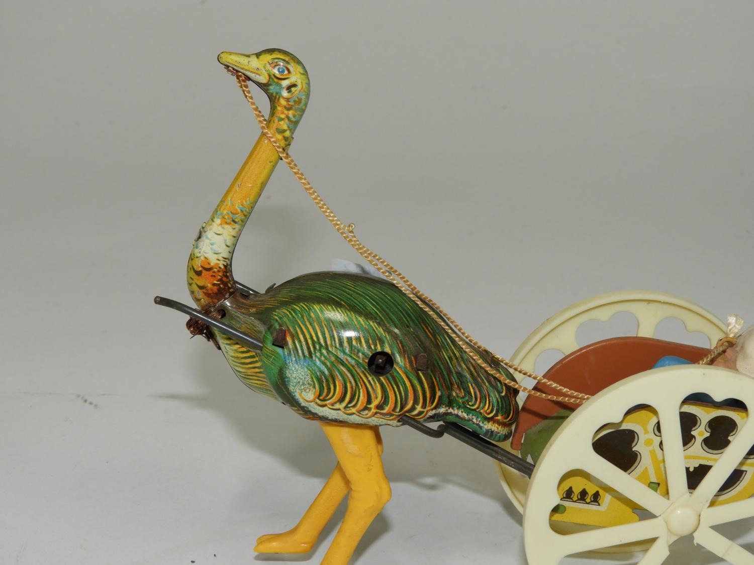 ostrich and wagon, germany(gnk) vintage mechanical tin toy