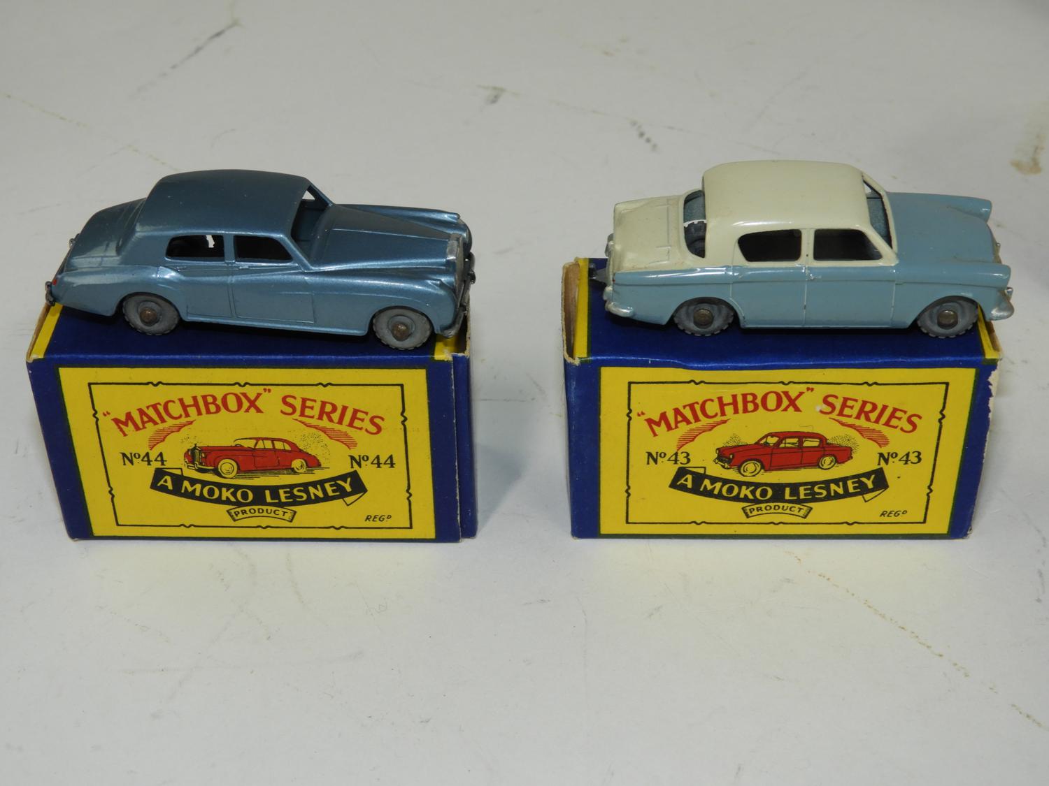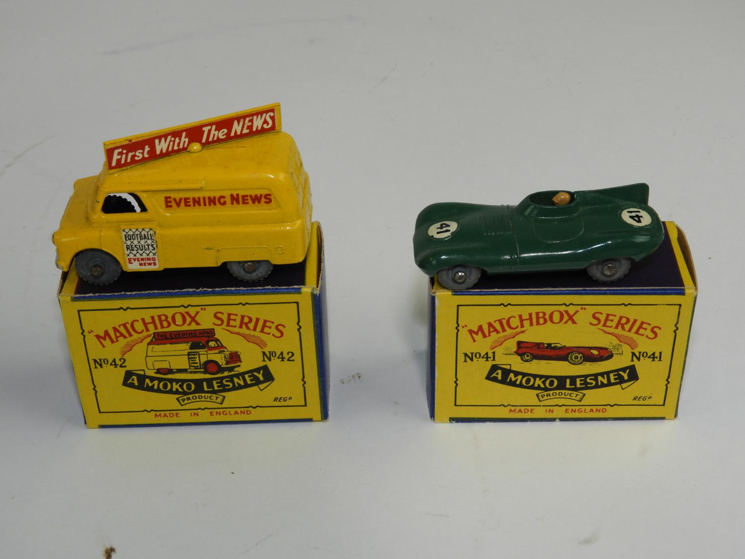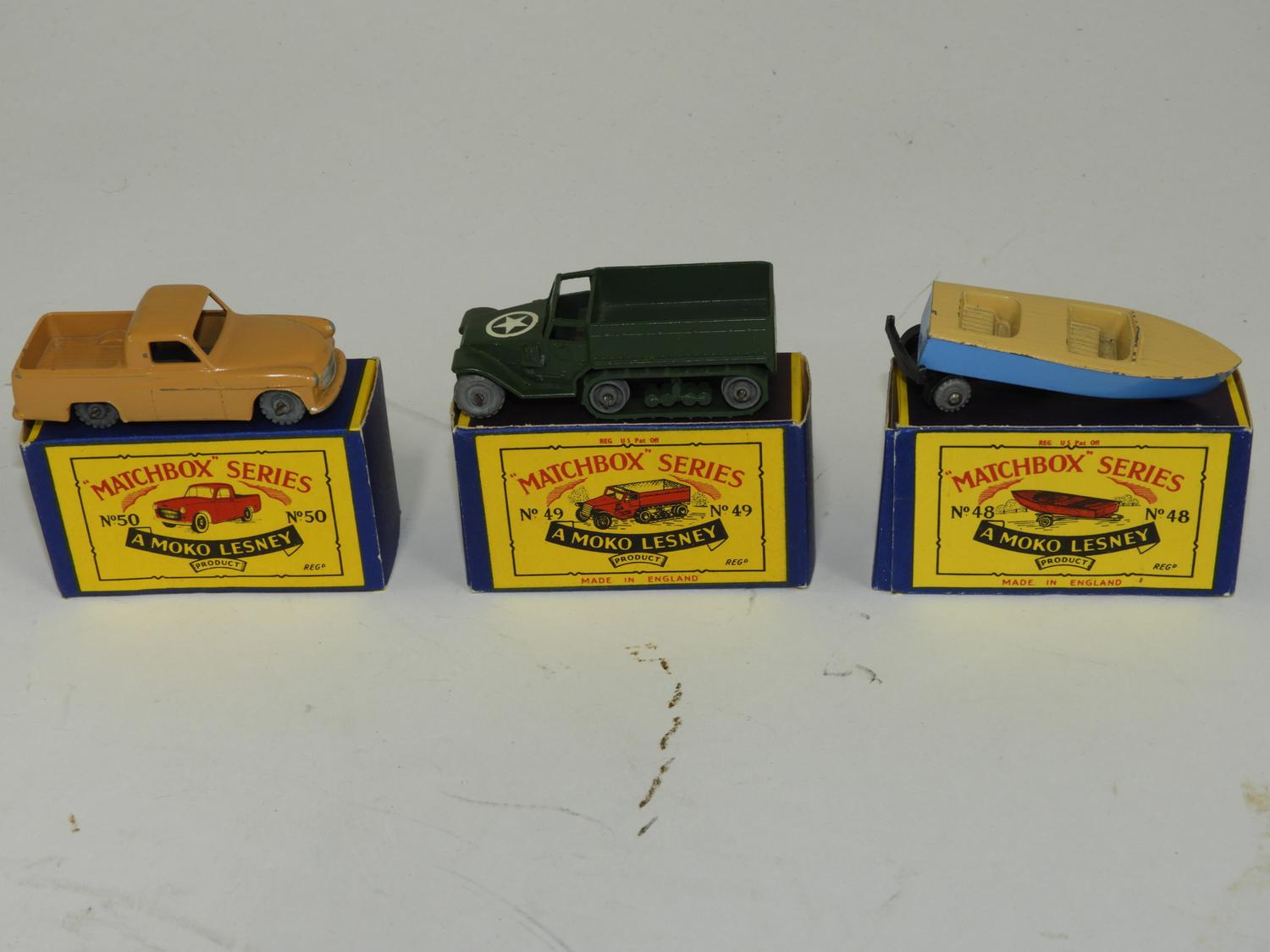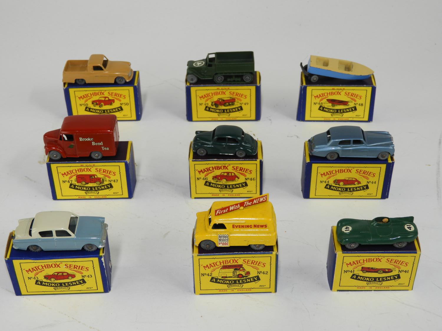 9 lesney matchbox cars in boxes, 41, 42, 43, 44, 46, 47, 48, 49, 50