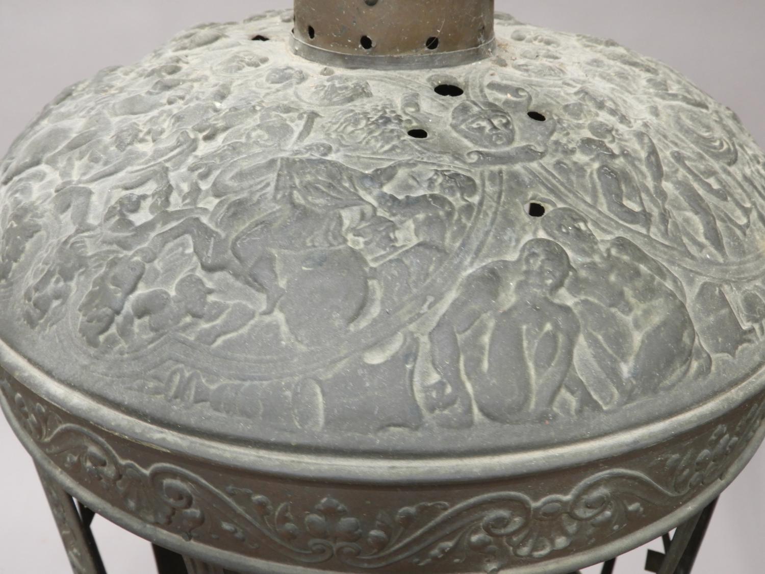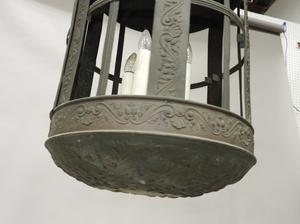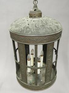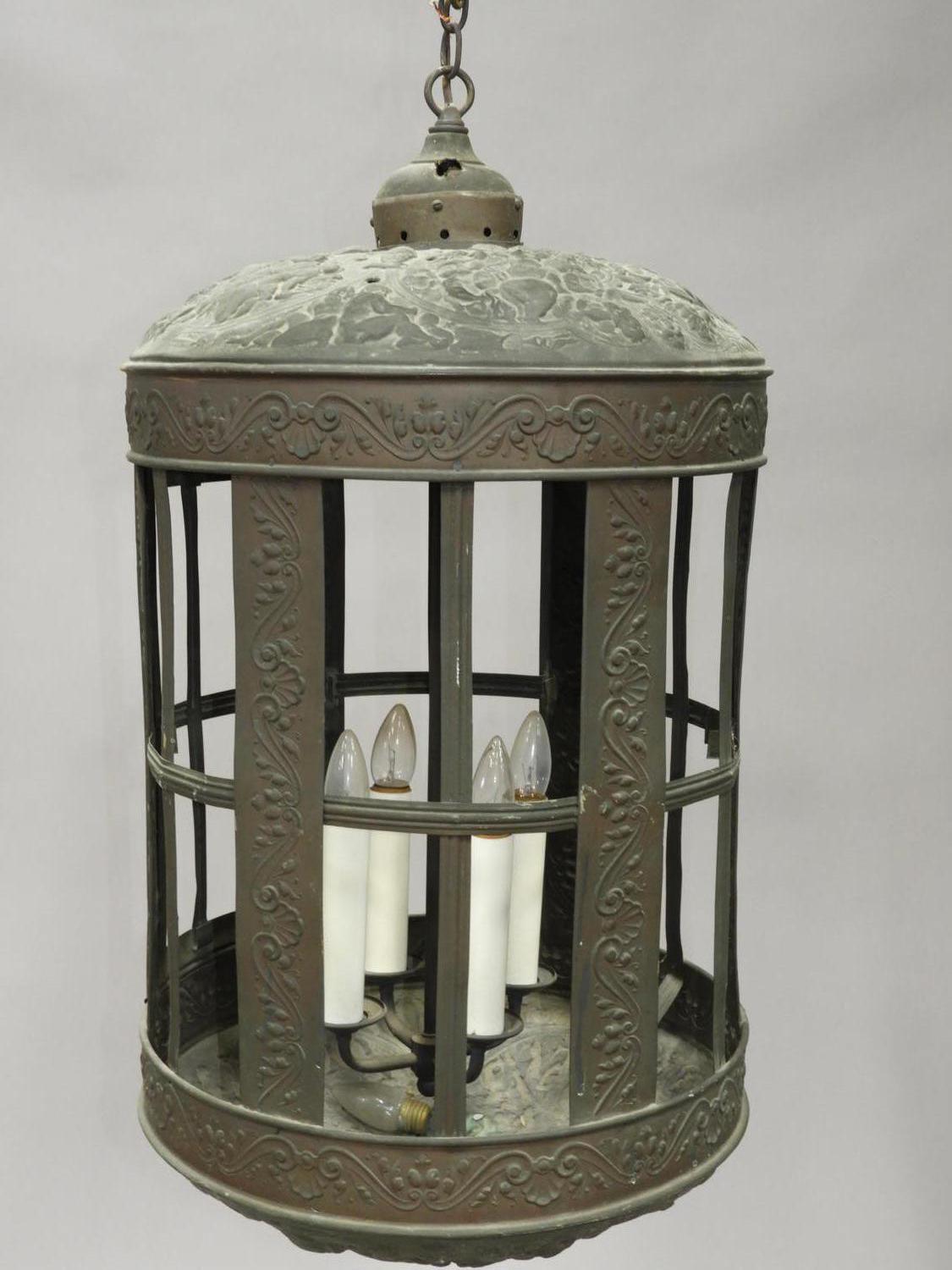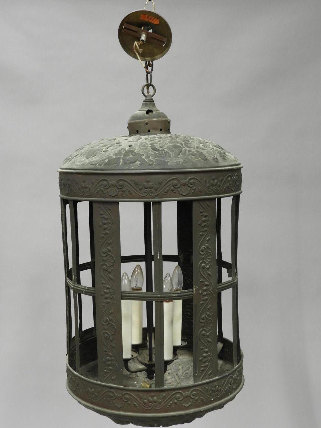 large pressed metal lantern form hanging light fixture, 40" x 19"