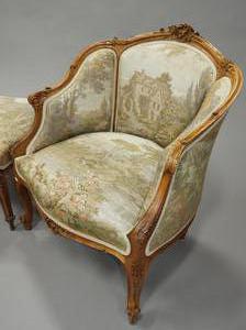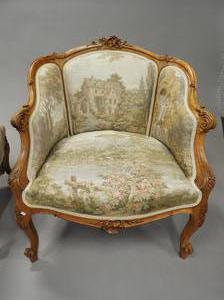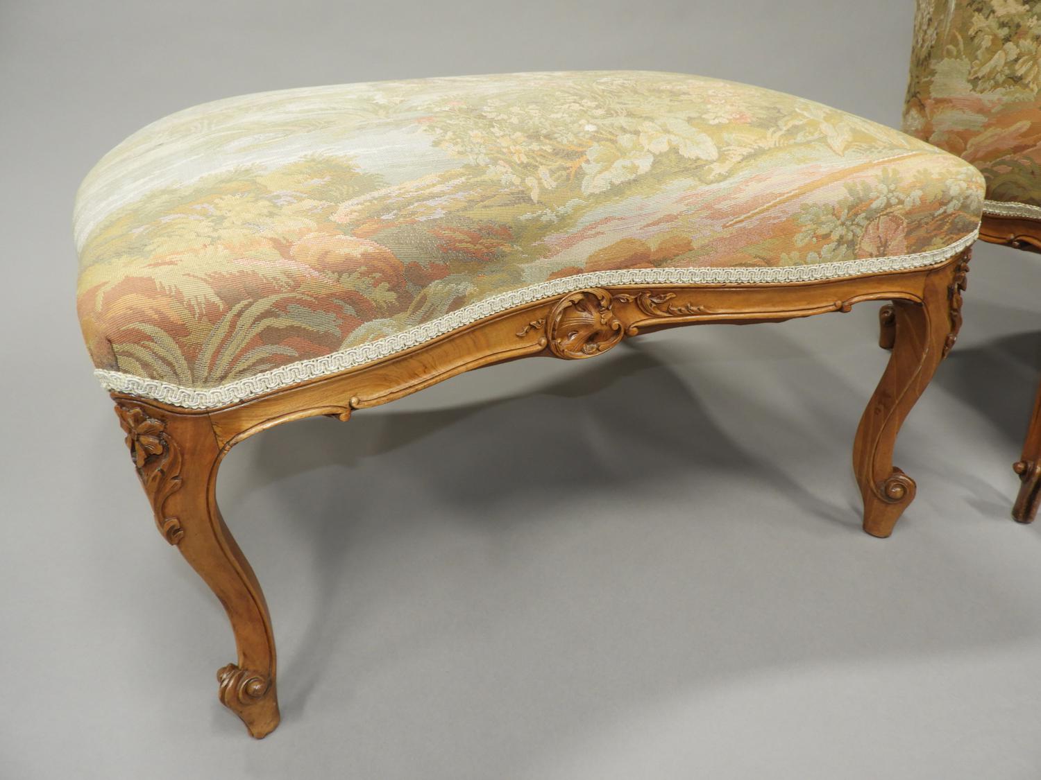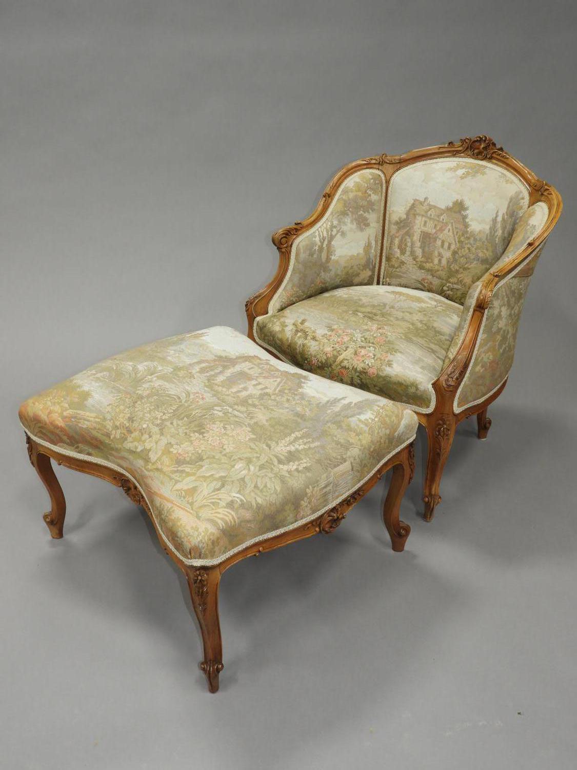 louis xv-style carved beechwood armchair and ottoman with tapestry style upholstry