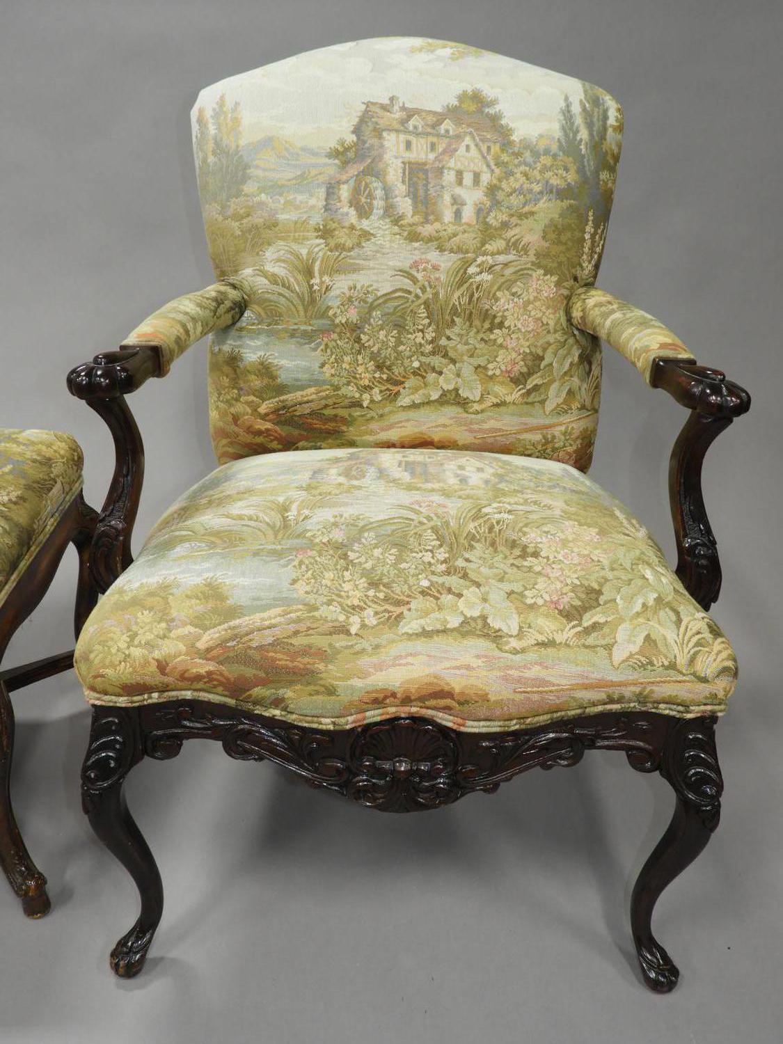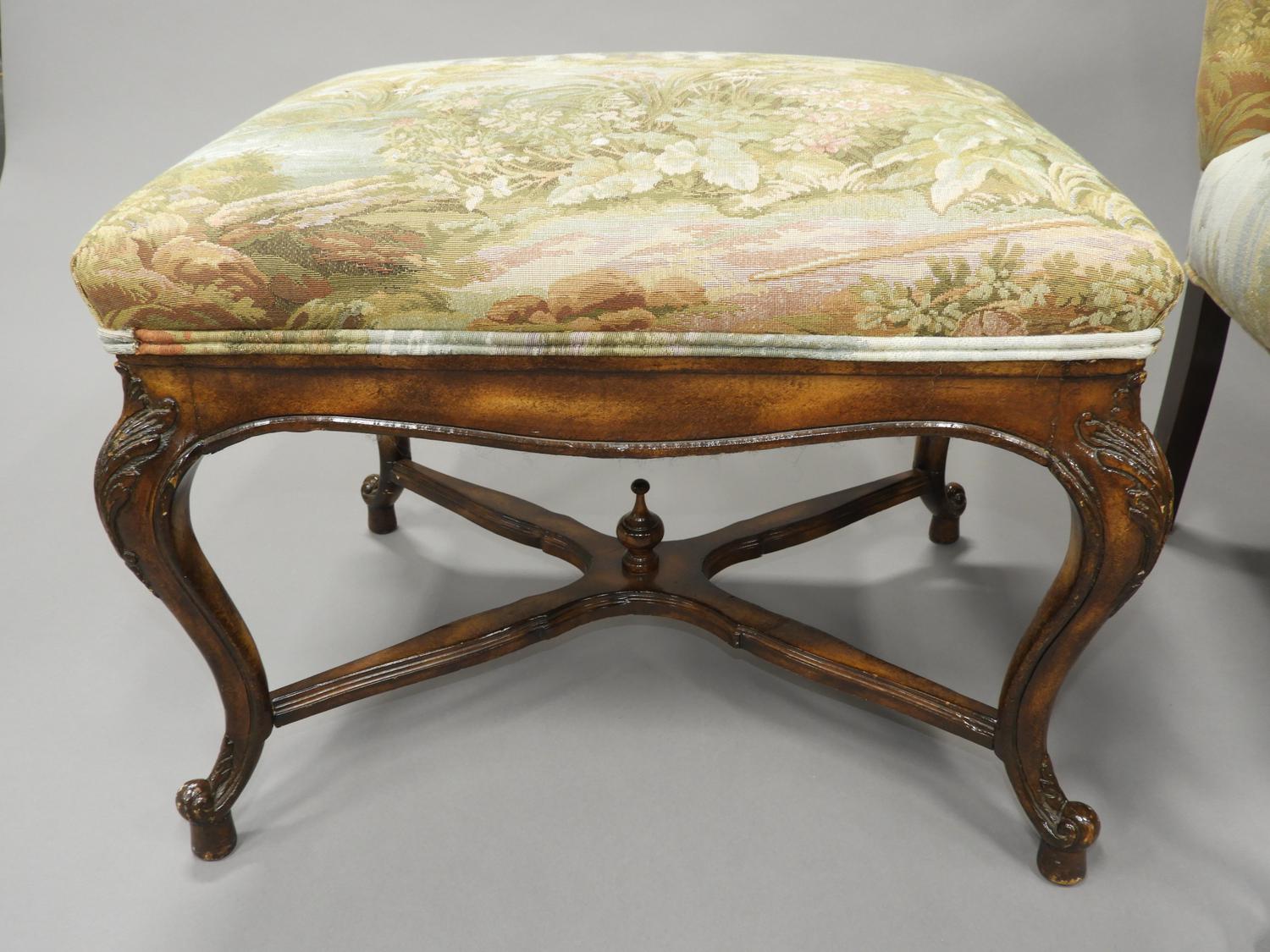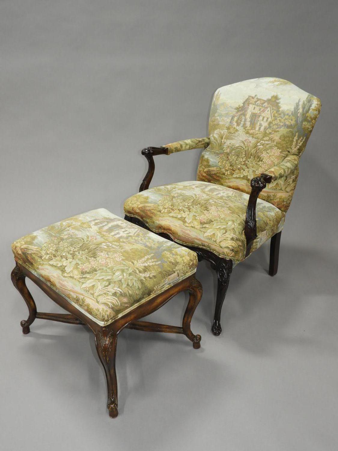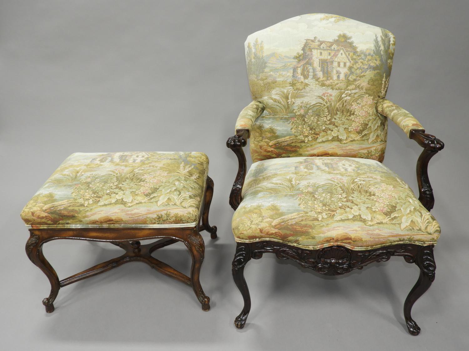 louis xv-style armchair and ottoman with tapestry style upholstery.