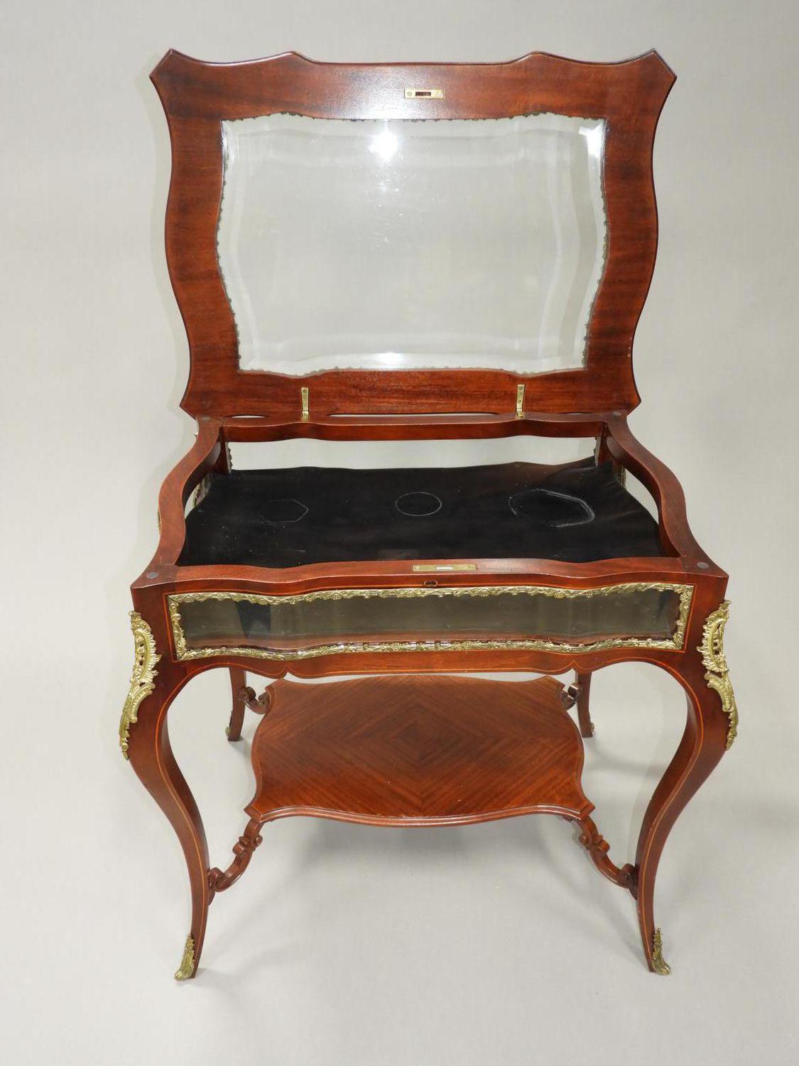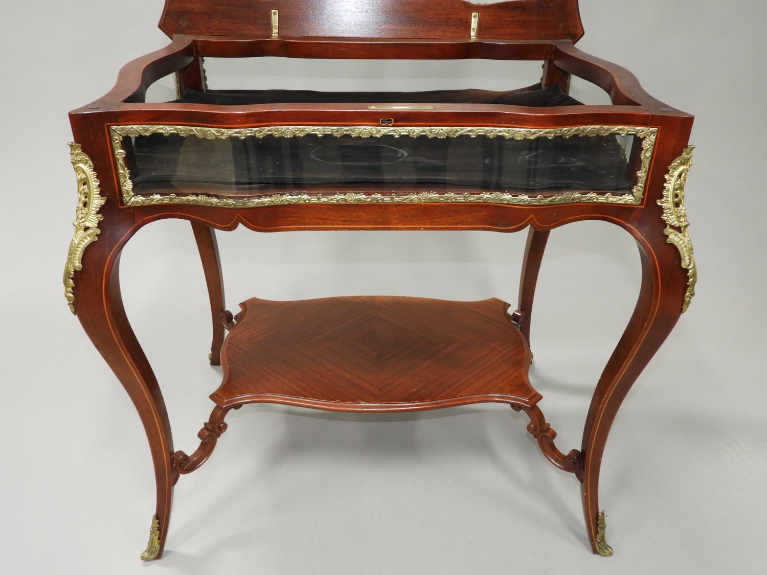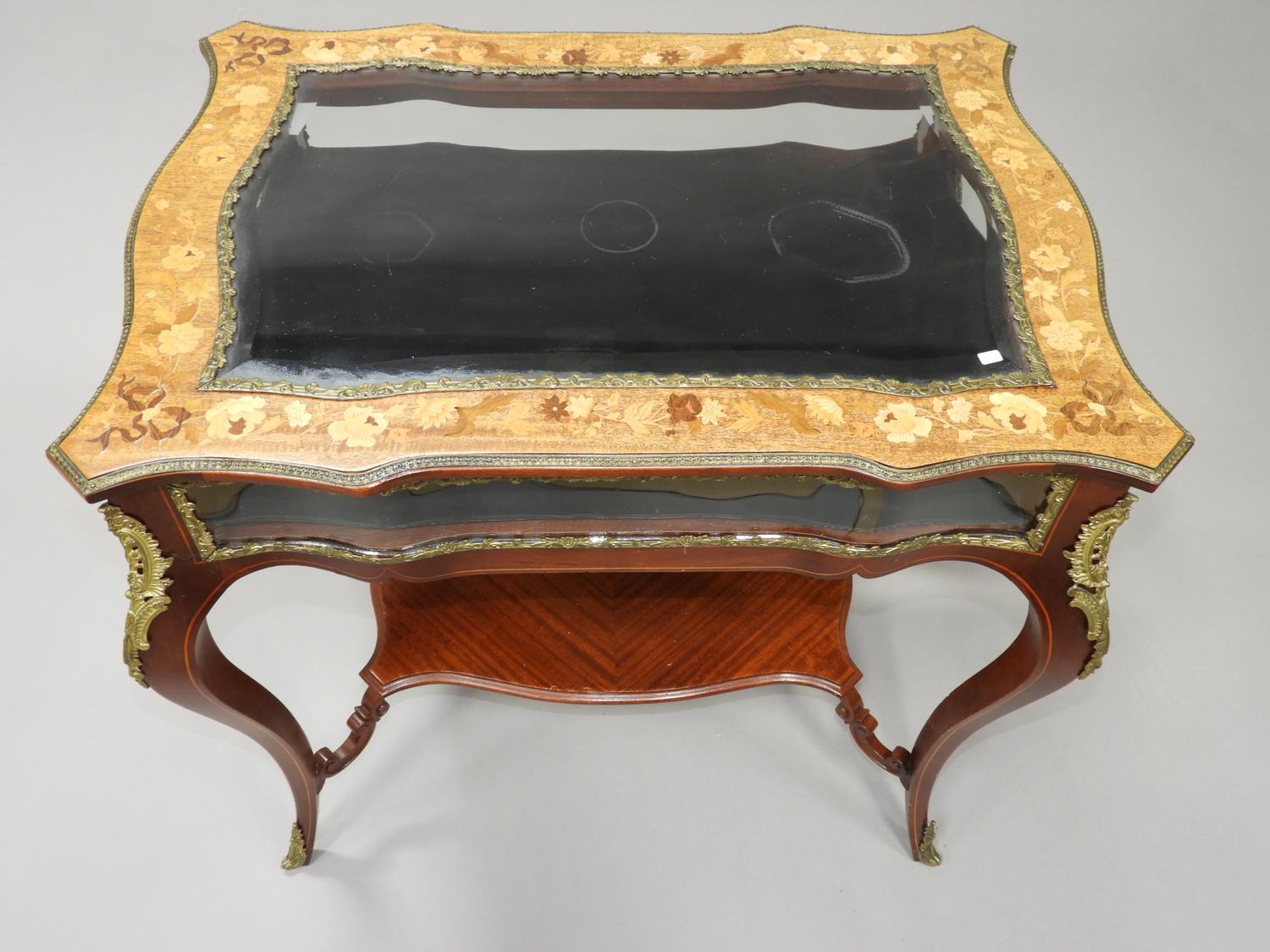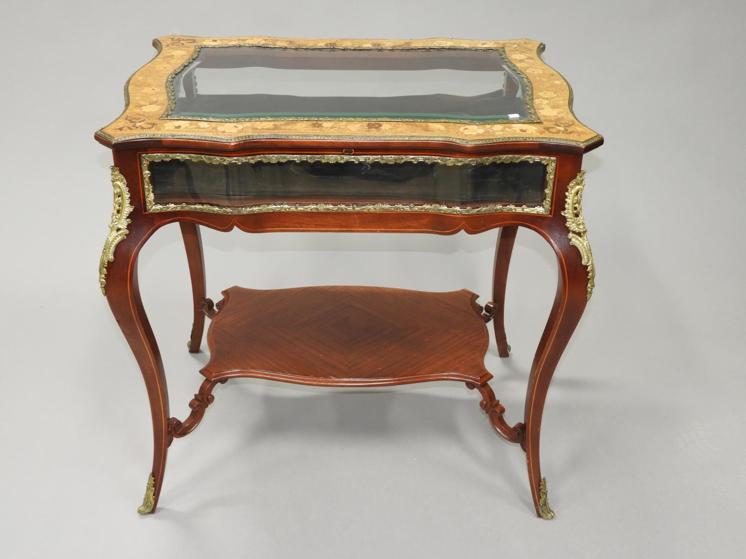 marquetry inlaid mahogany vitrine table, 30" x 30" x 22"