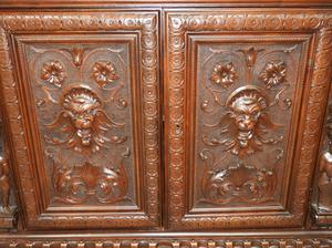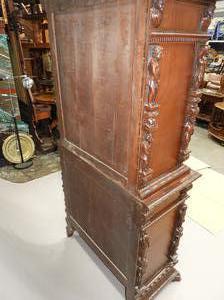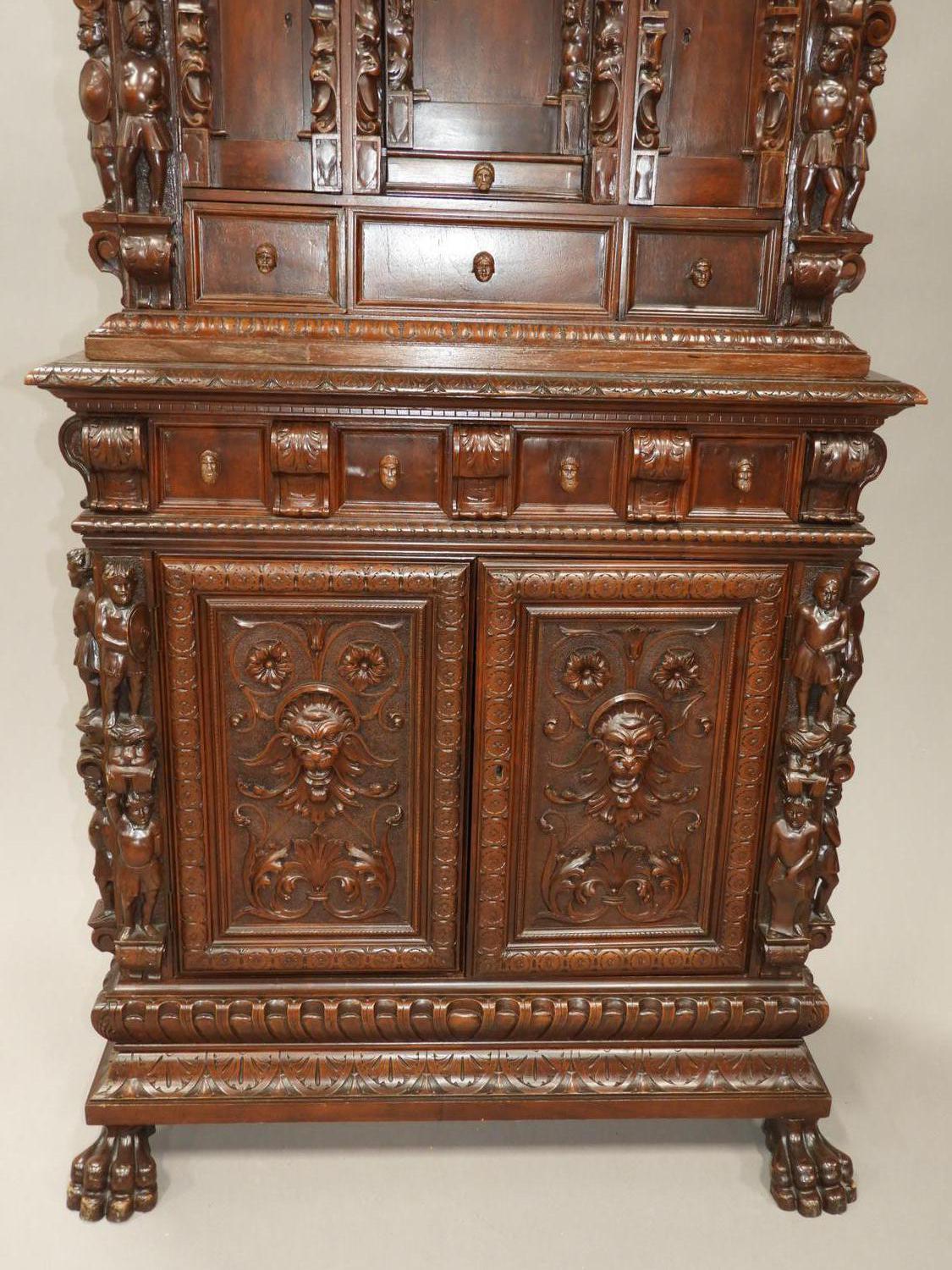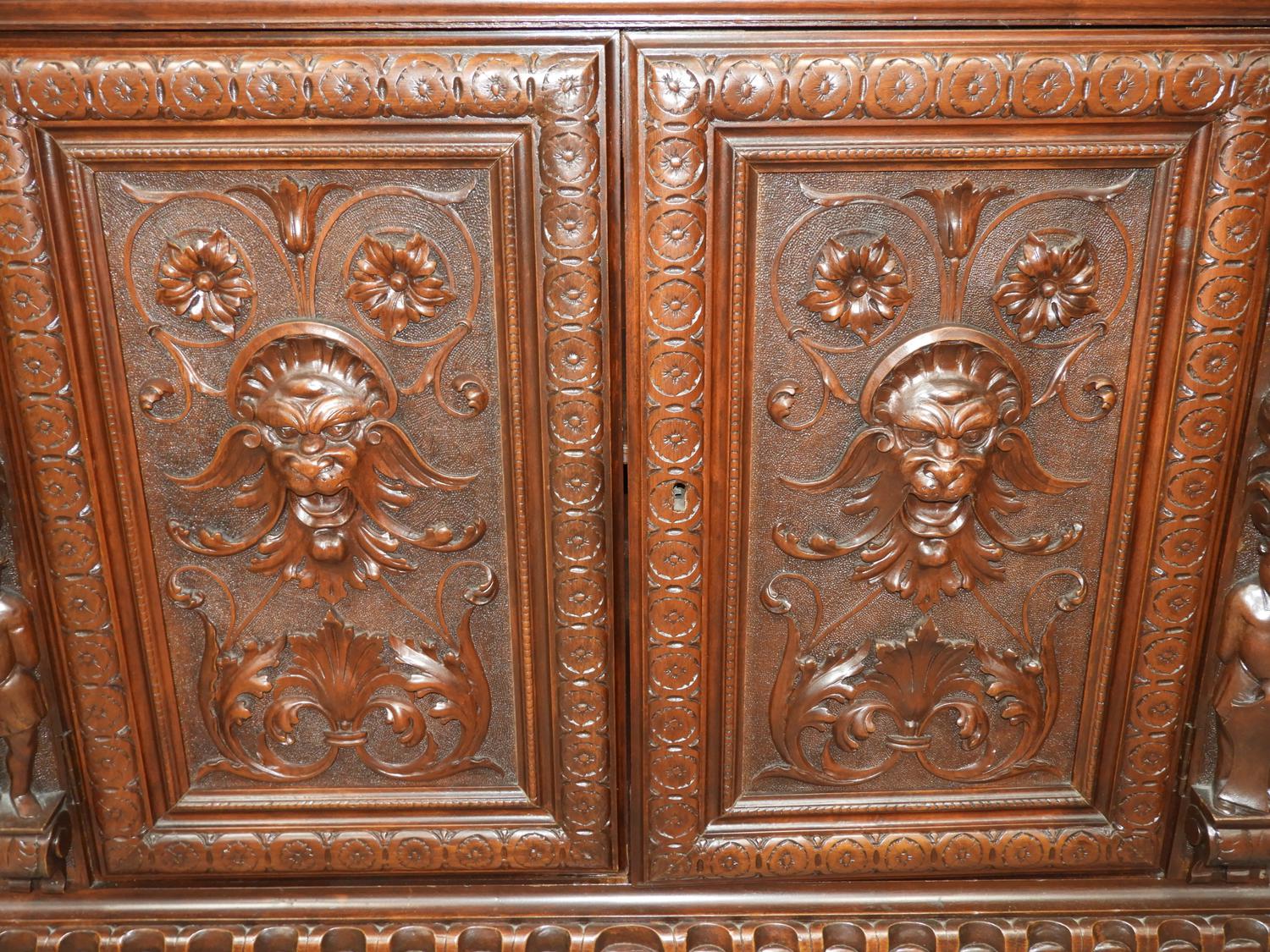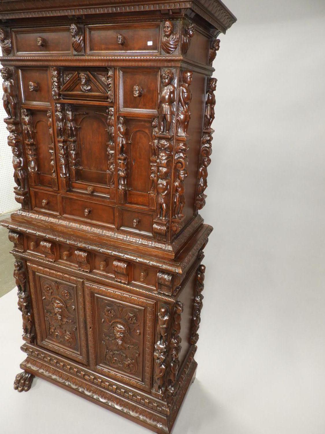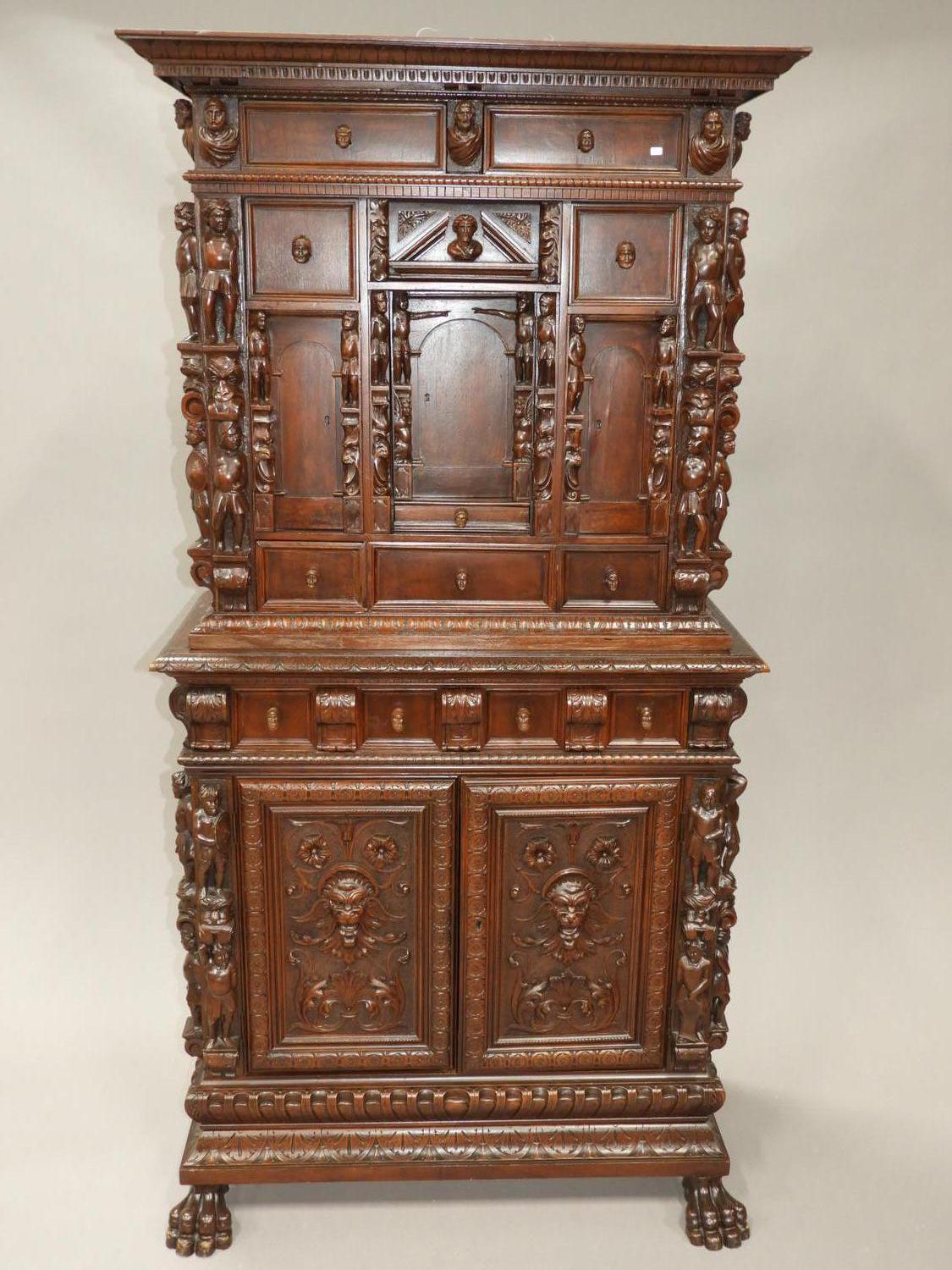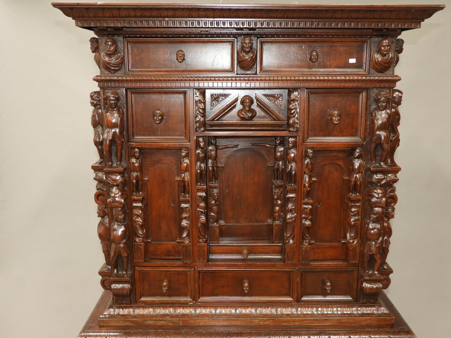 carved walnut finish court cupboard in the 17th century manner, 73" x 37" x 18"