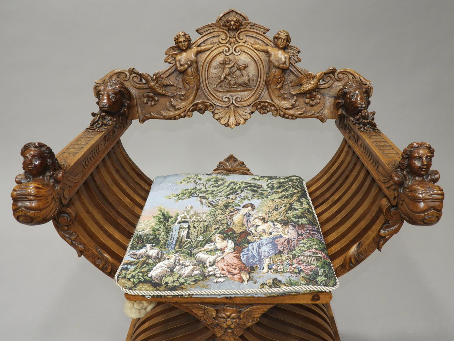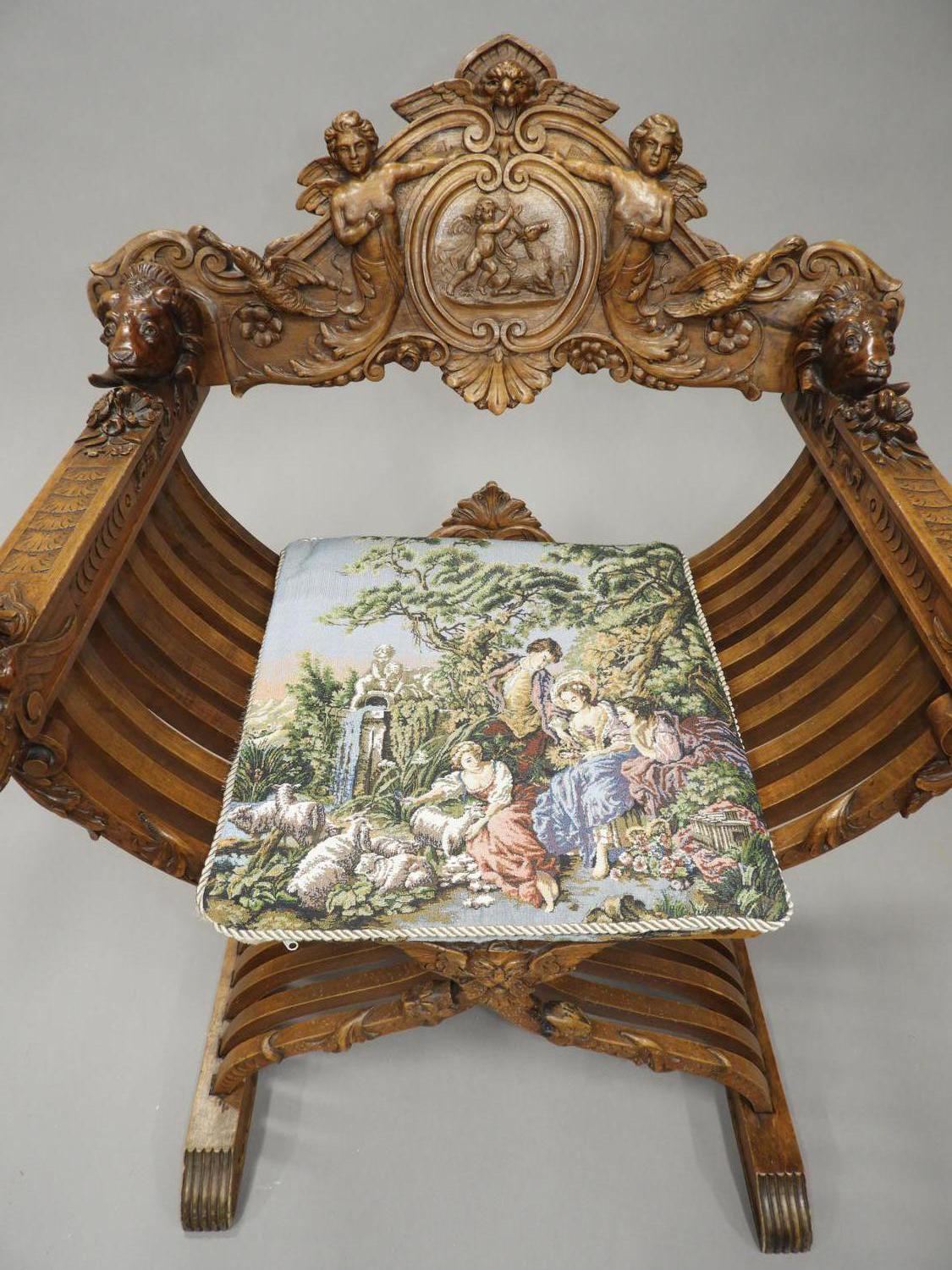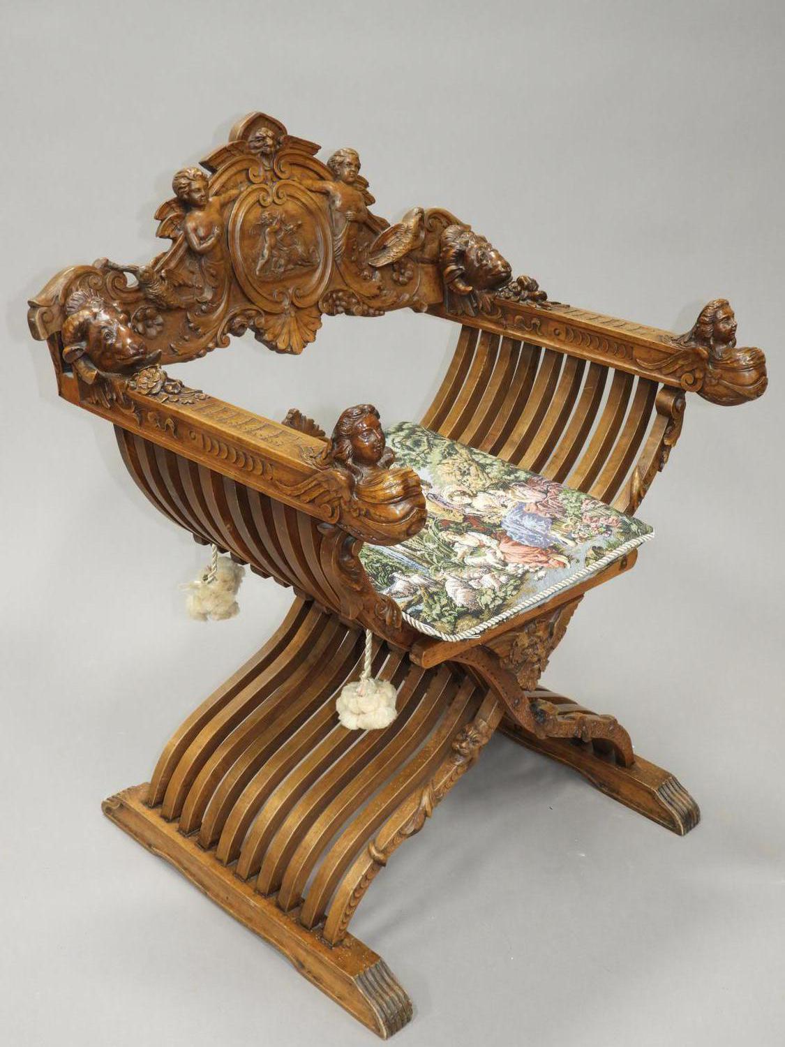 heavily carved walnut savonarola armchair with tapestry style loose cushion with tassels