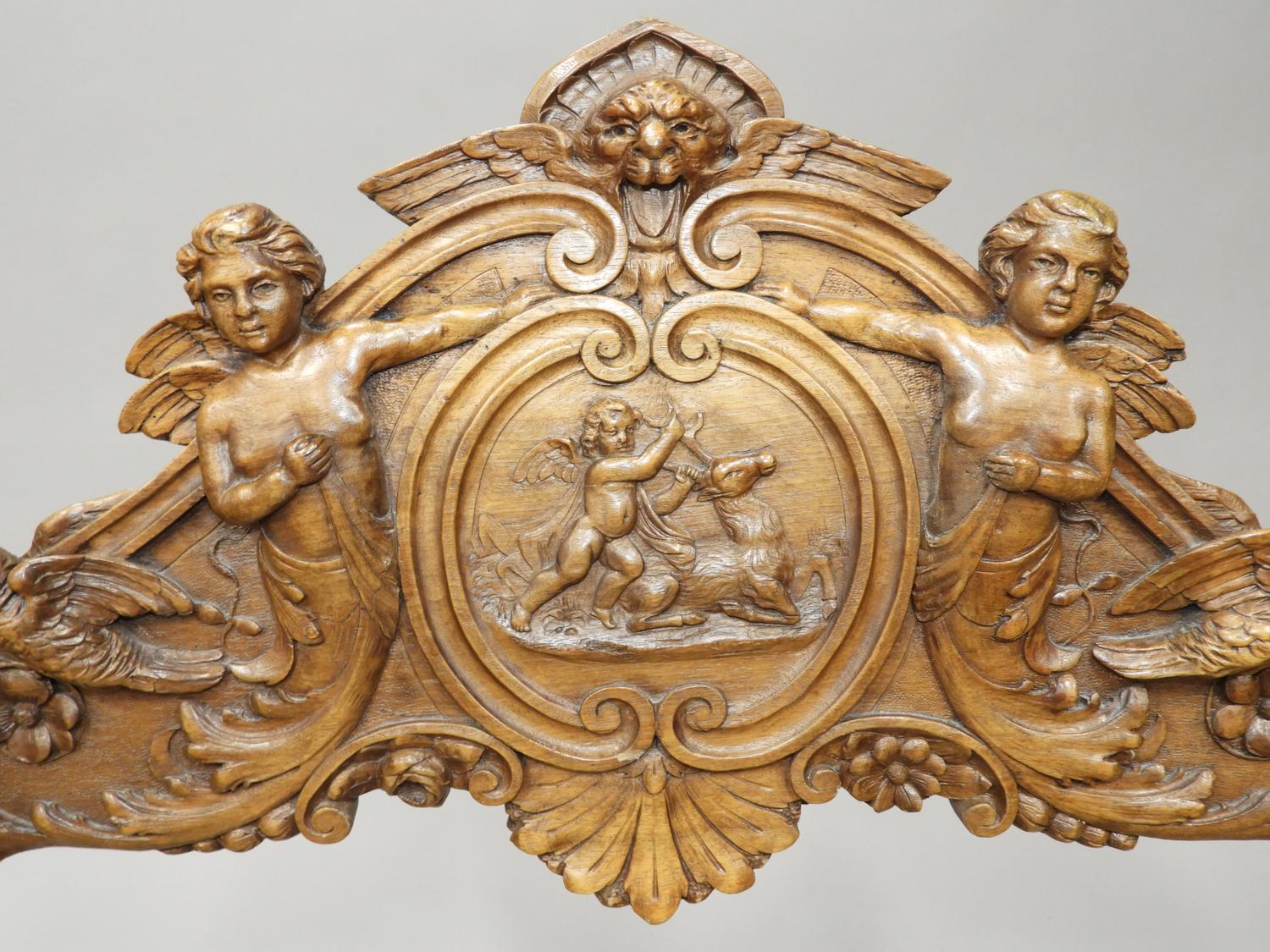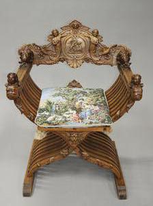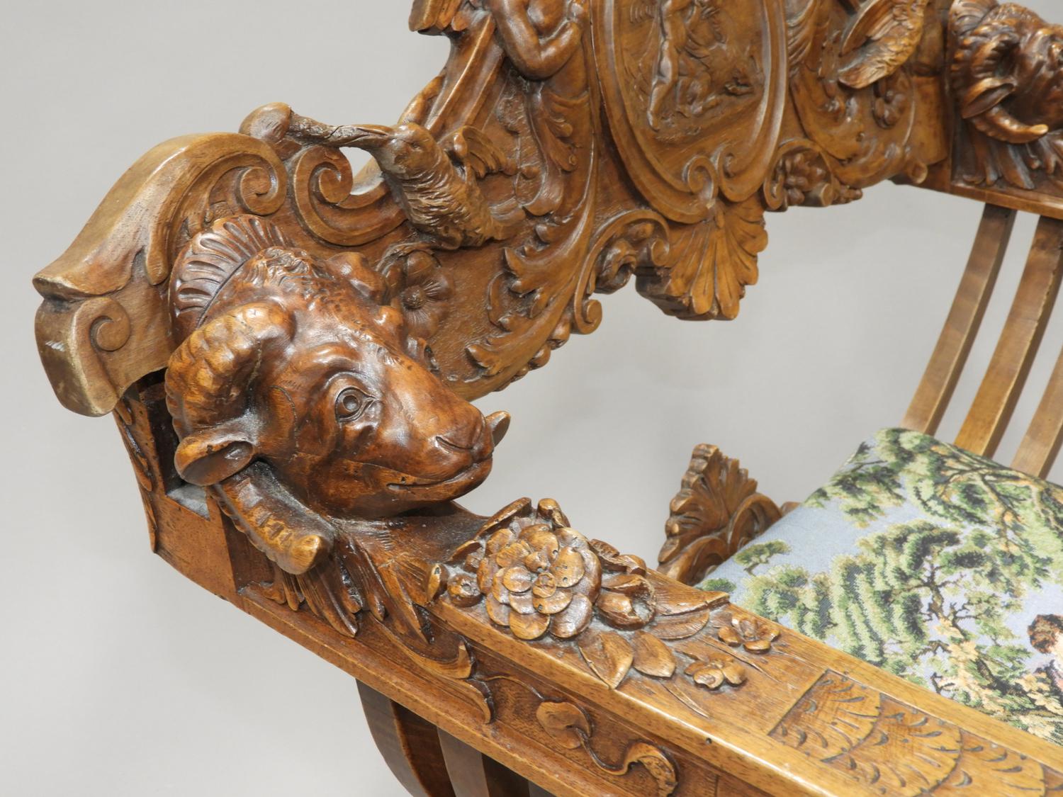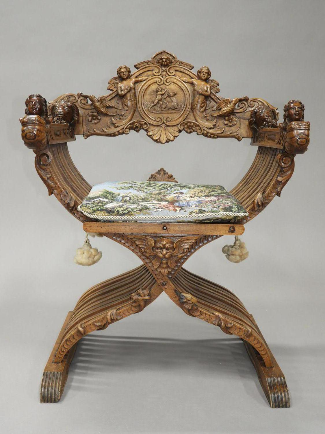 heavily carved walnut savonarola armchair with tapestry style loose cushion with tassels