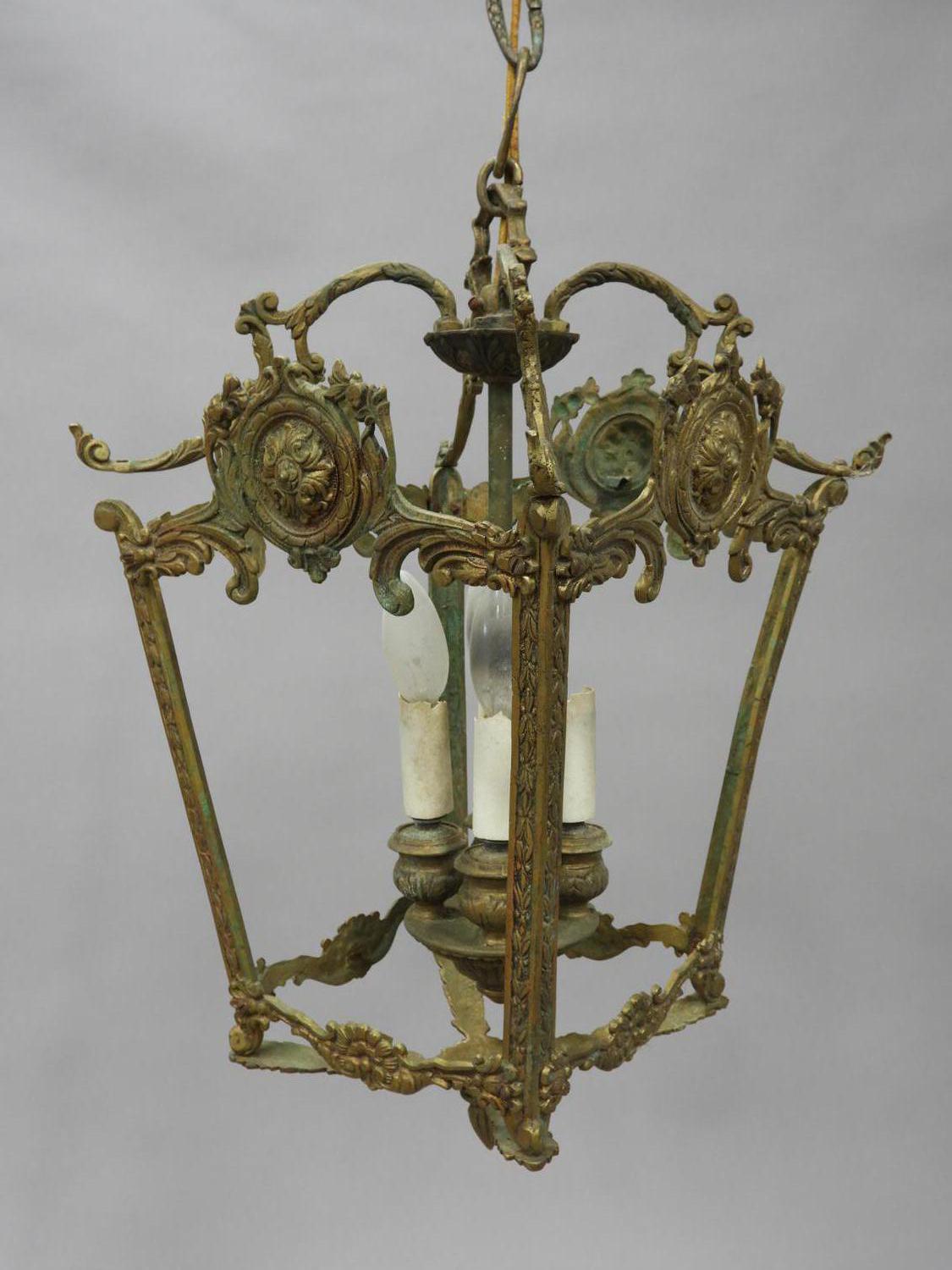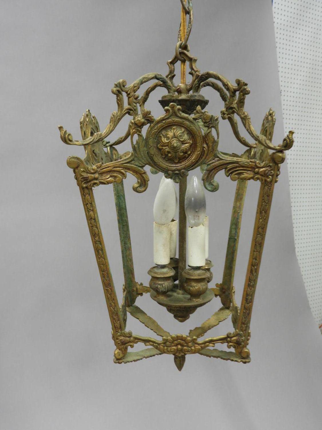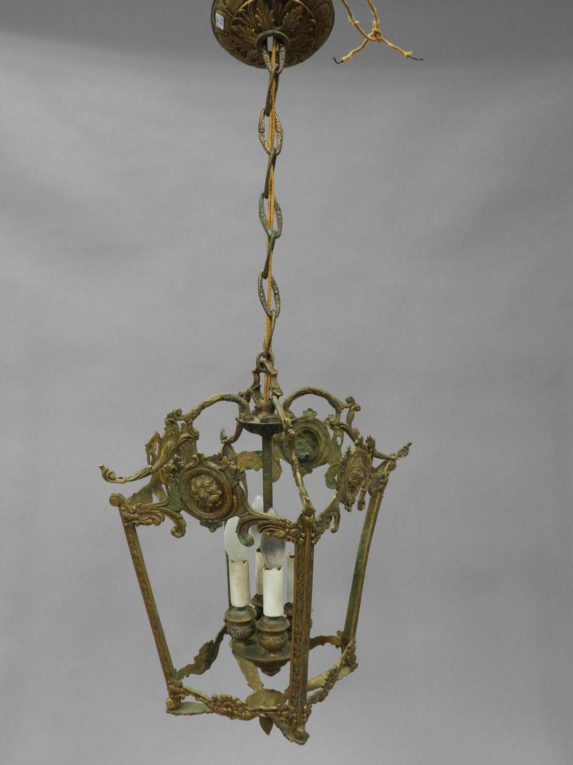 gilt metal hanging light fixture, 30" x 9" x 9"