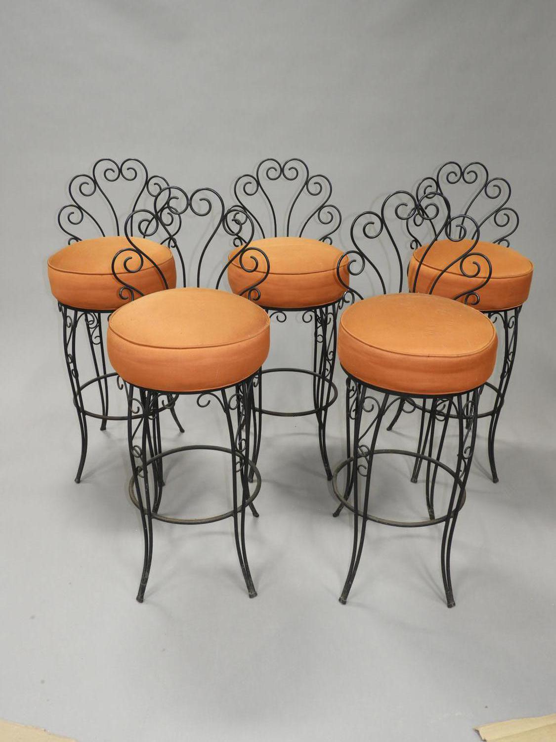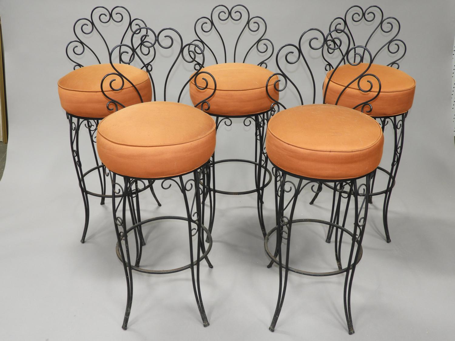 set of five mid 20th century wrought iron bar stools with upholstered seats