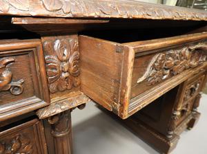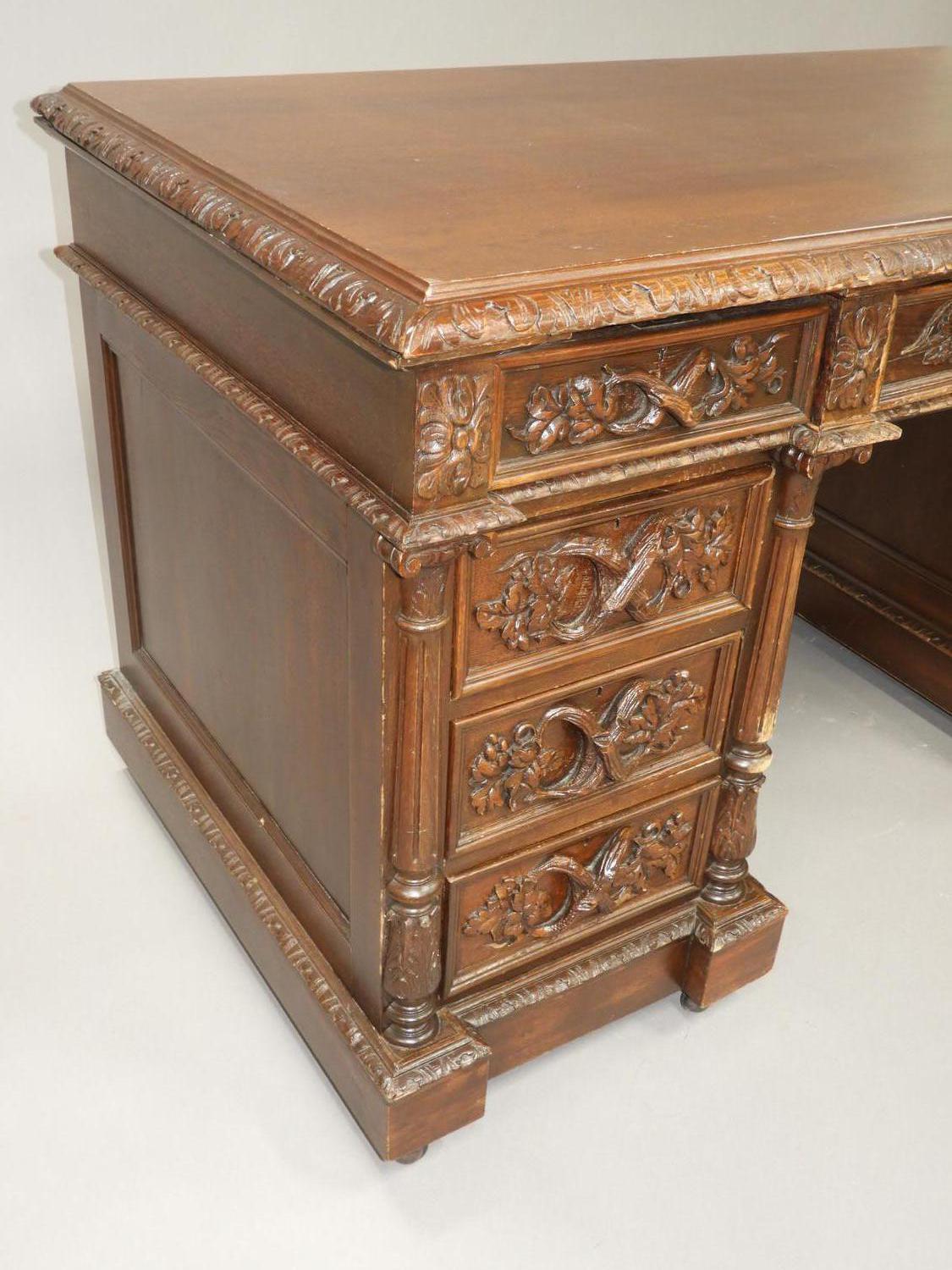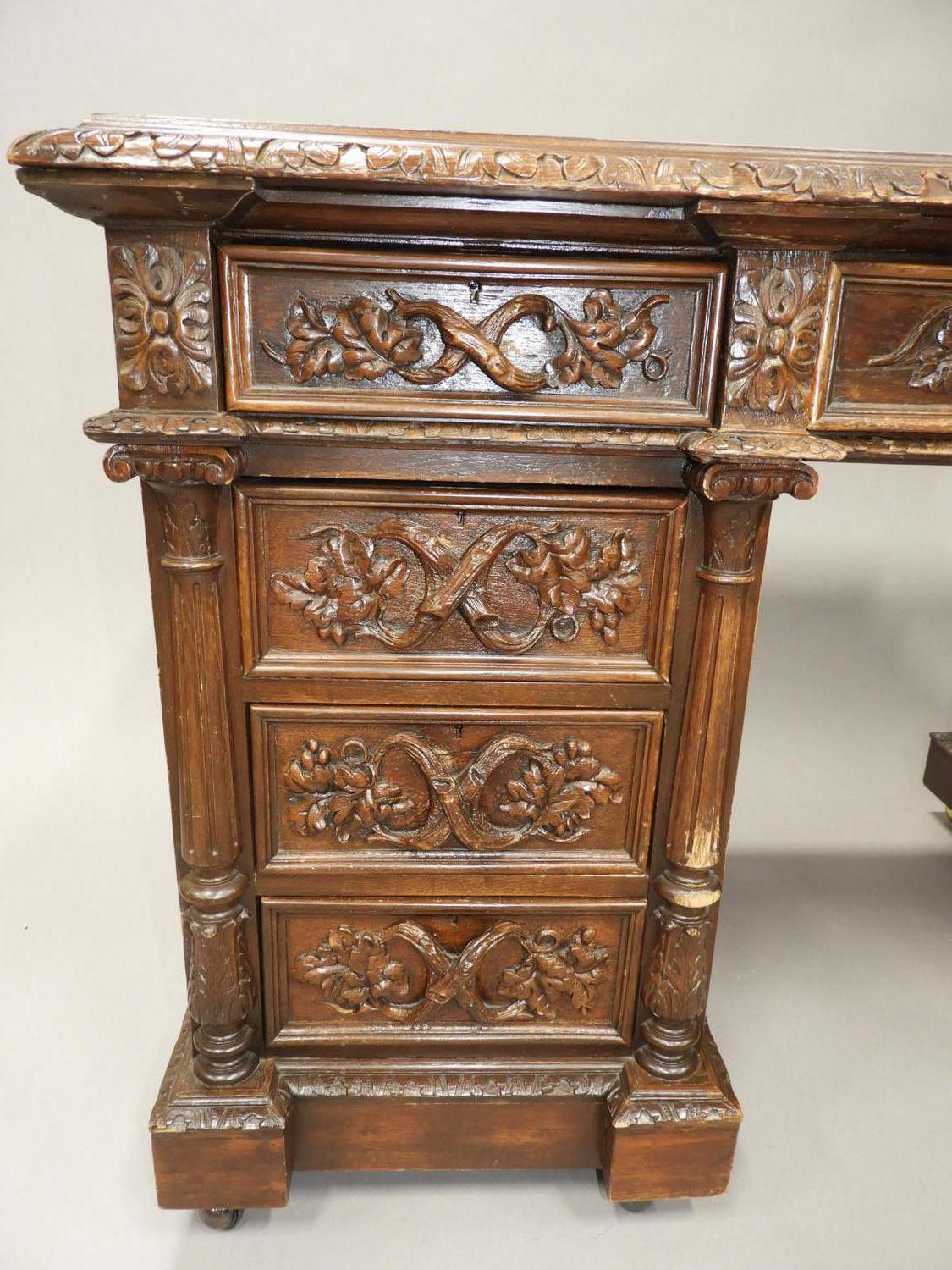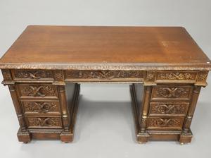 carved oak double pedestal desk, 32" x 57" x 30"
