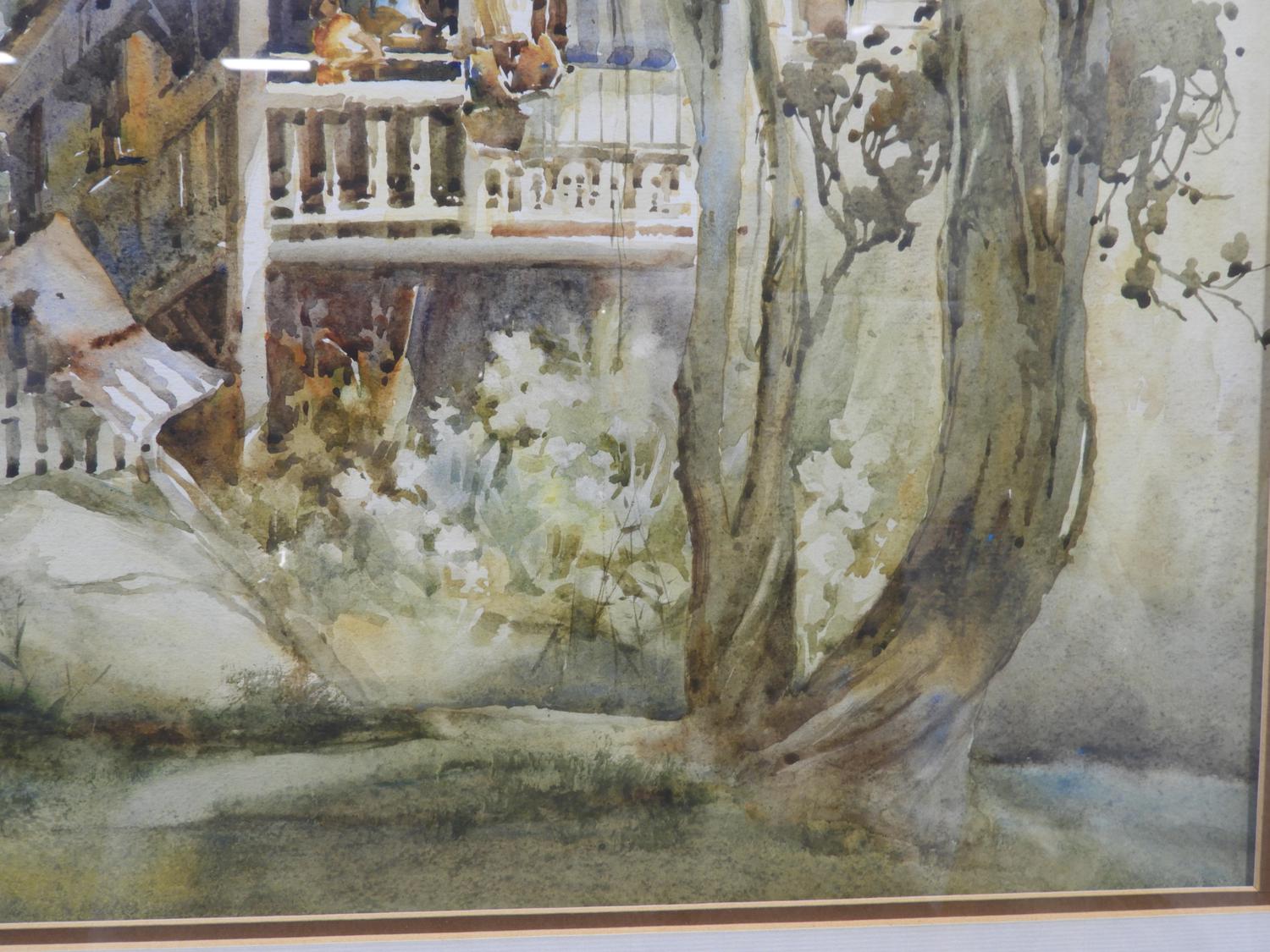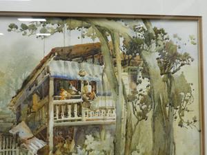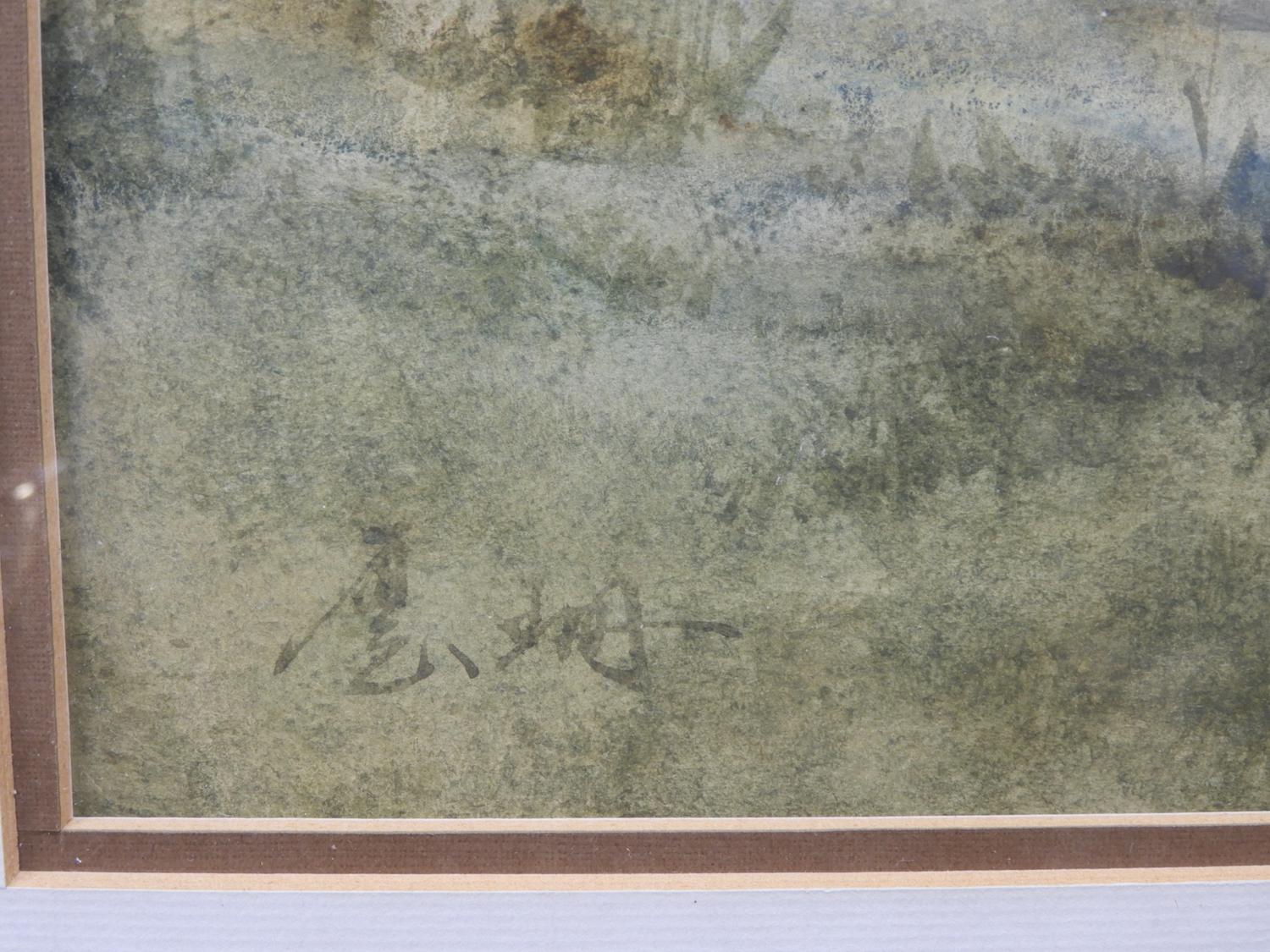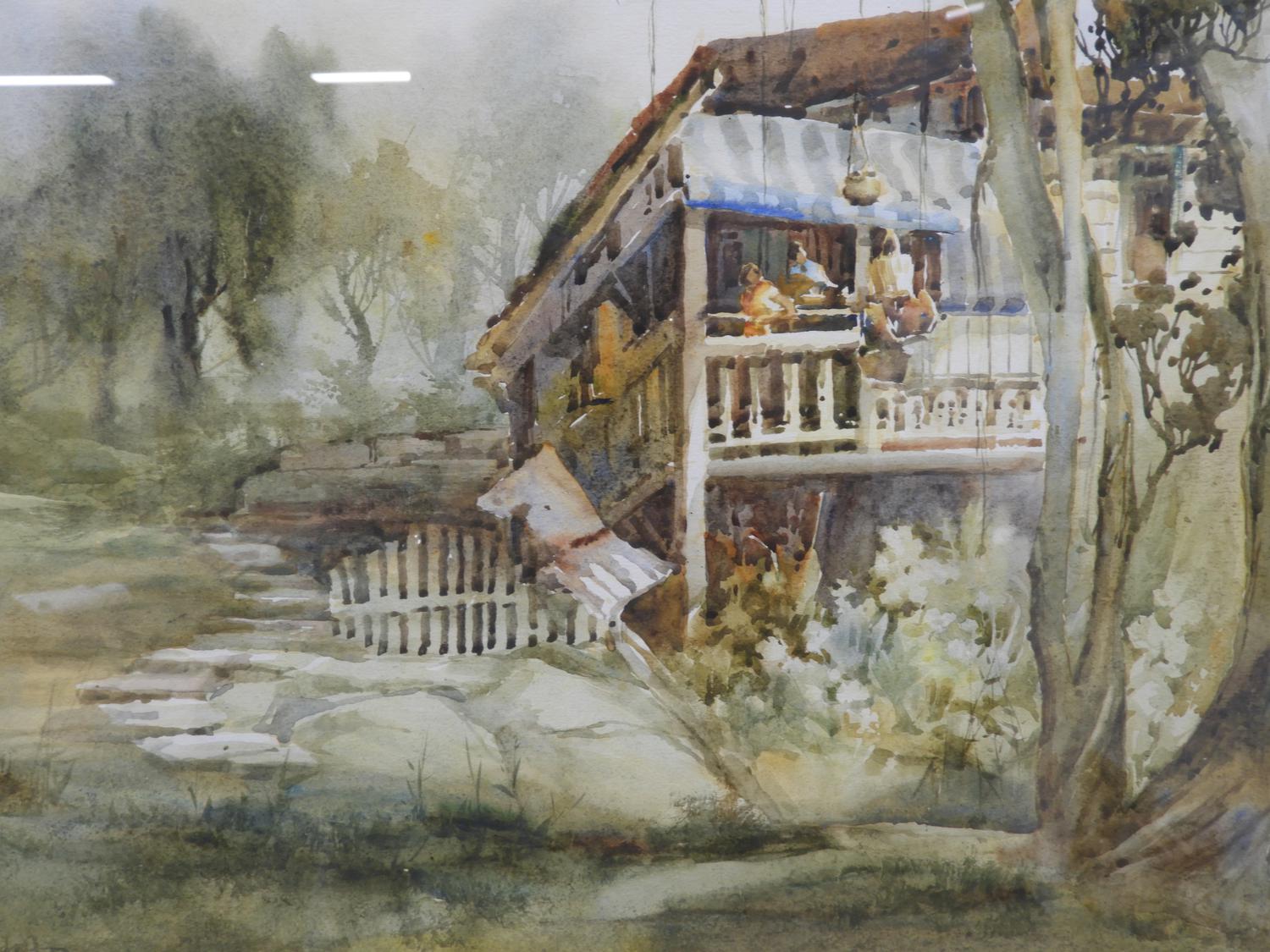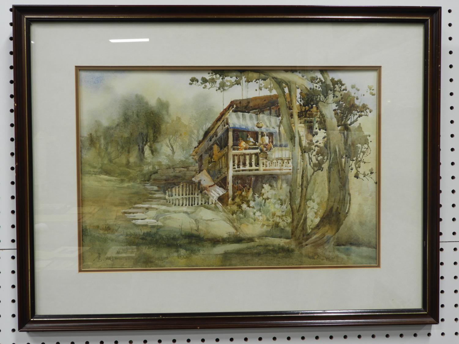 20th century asian school watercolour, signed lower left, 14" x 20", "landscape with house and figures"
