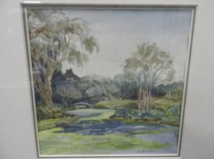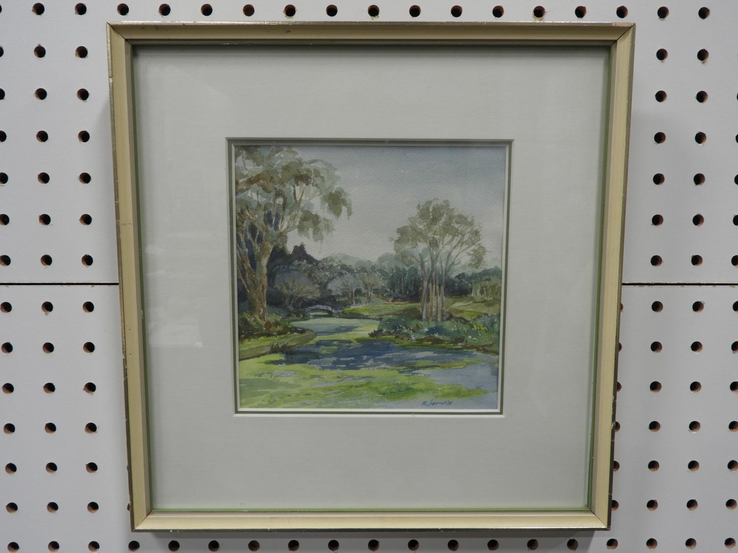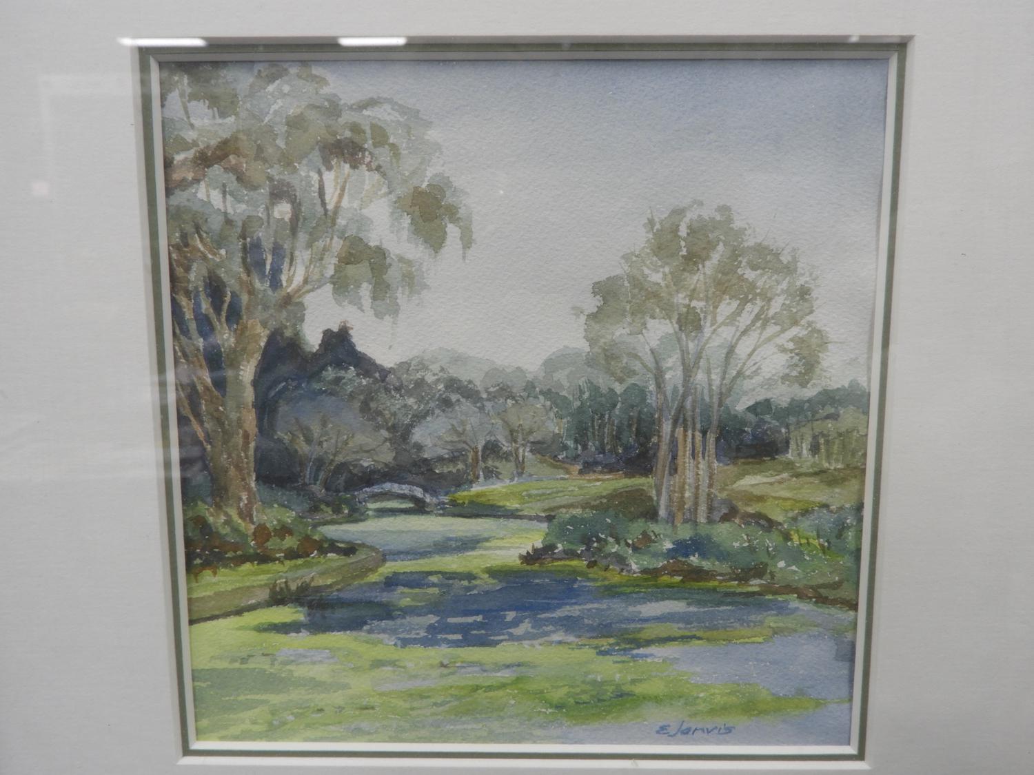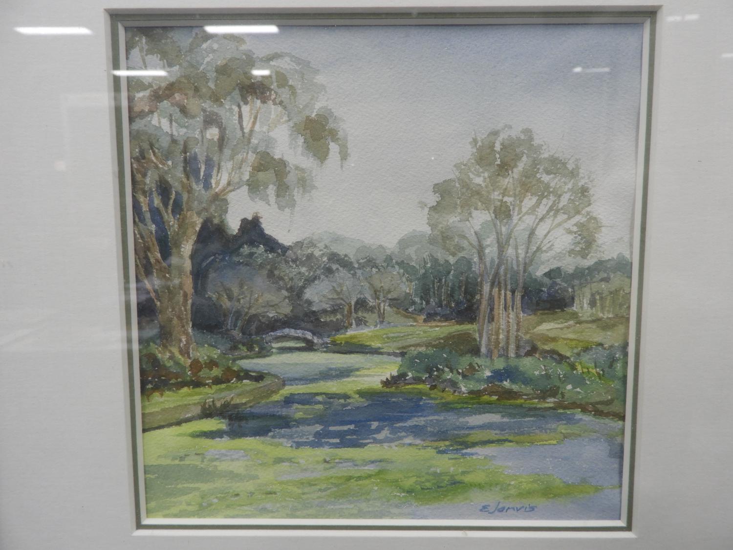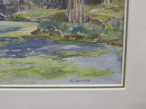 e. jarvis, watercolor, 6 1/4" x 6 1/4", "landscape with stone bridge"