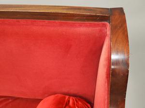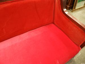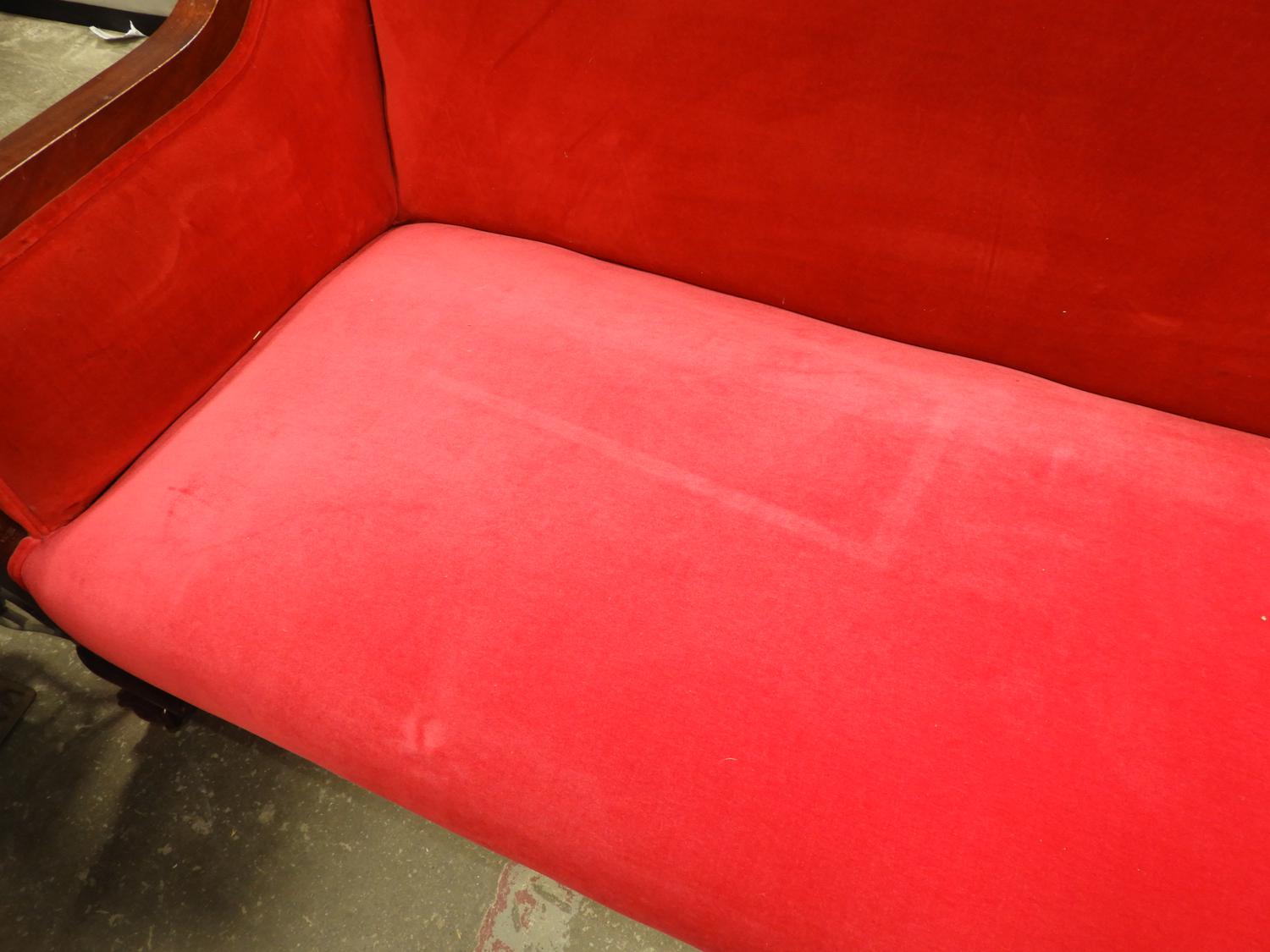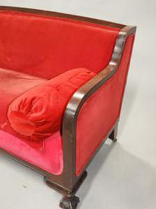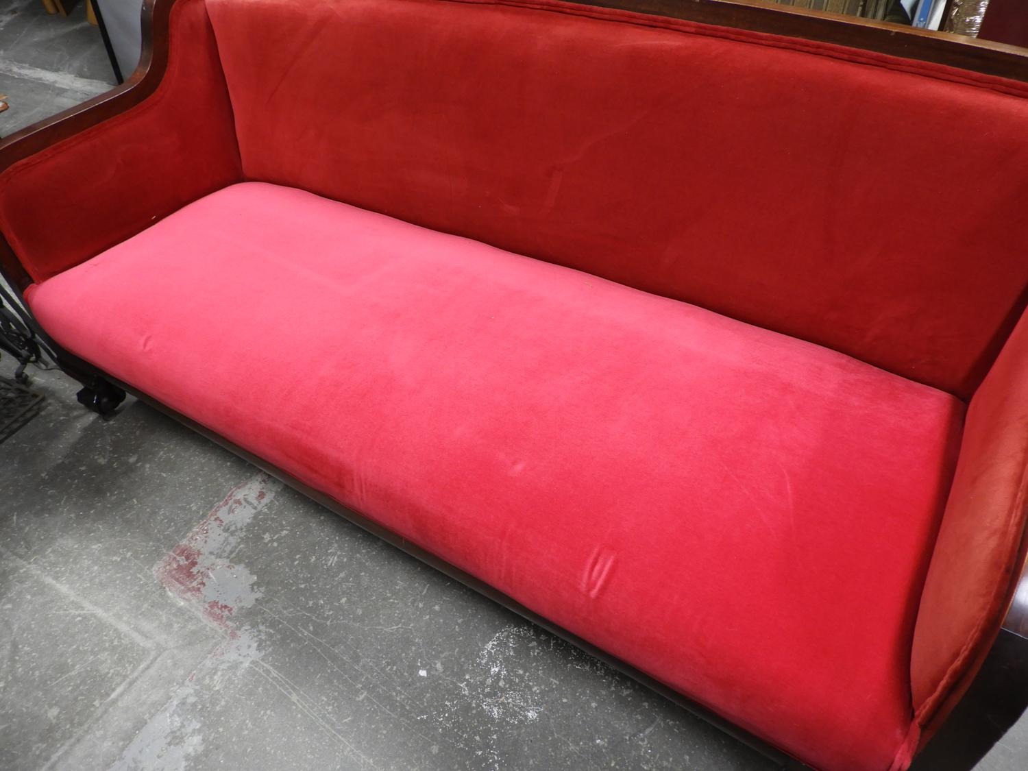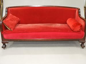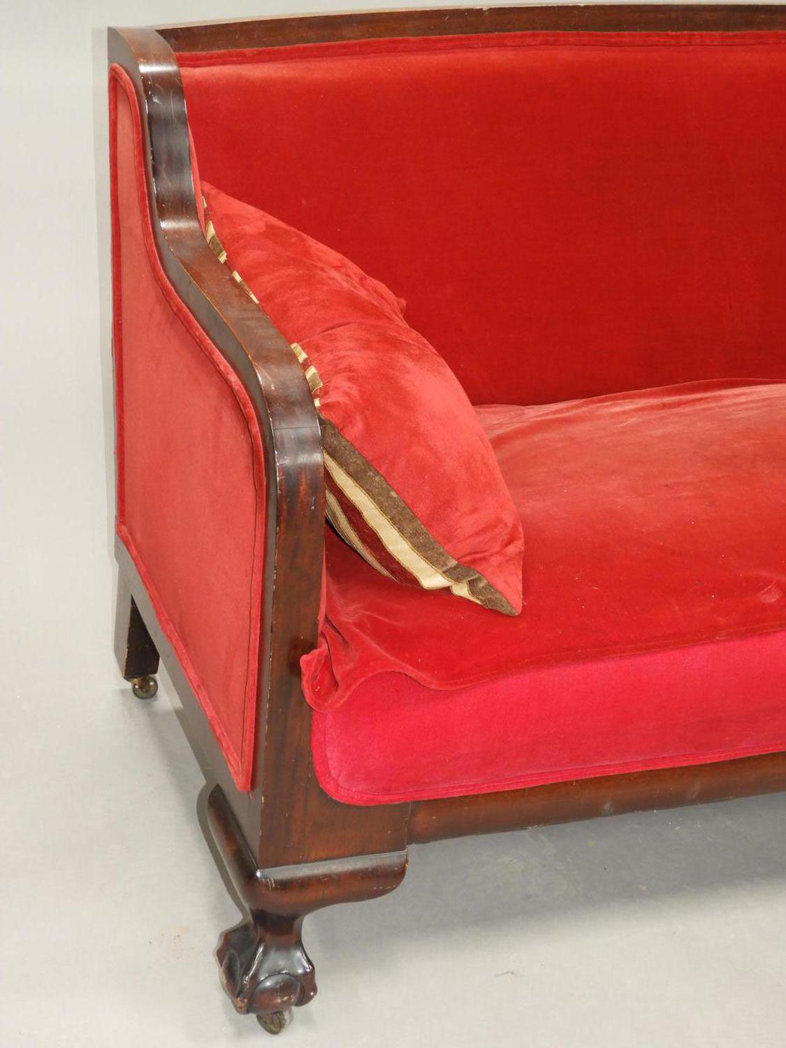 mahogany upholstered sofa with claw and ball feet, c.1900, 35" x 75" x 30"