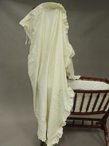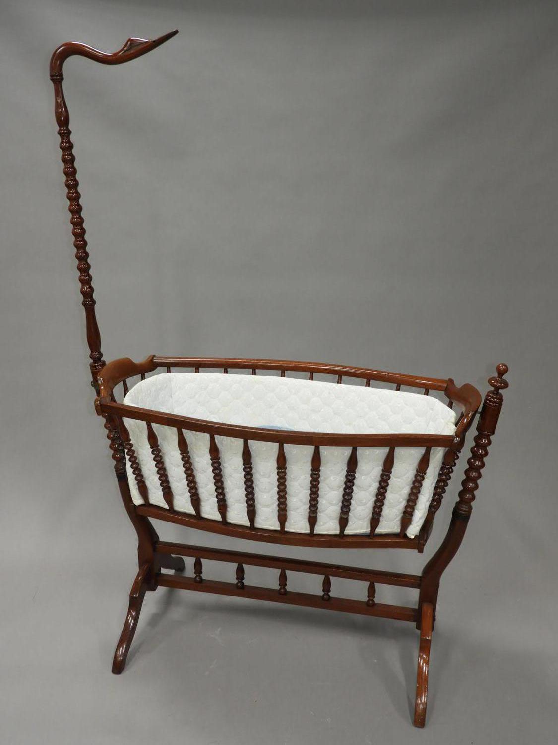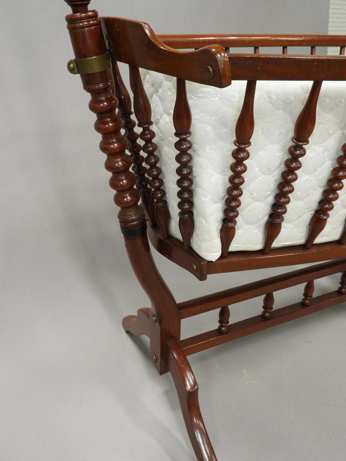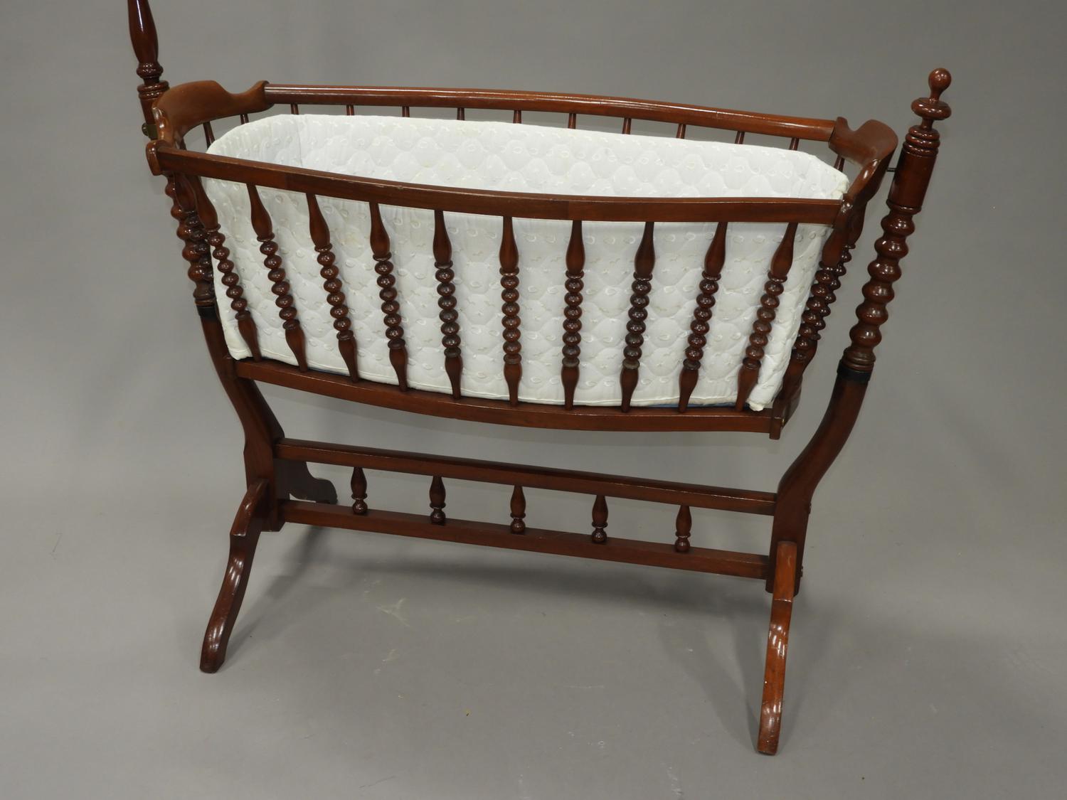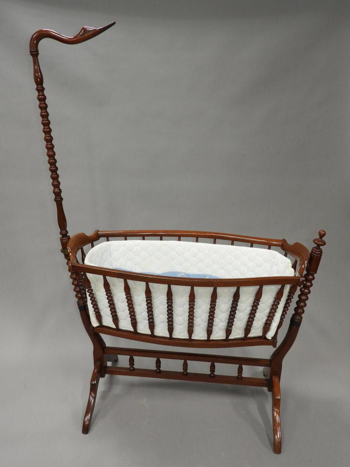 mahogany finish cradle on stand, with turned supports, curtain, 69" x 49" 24"