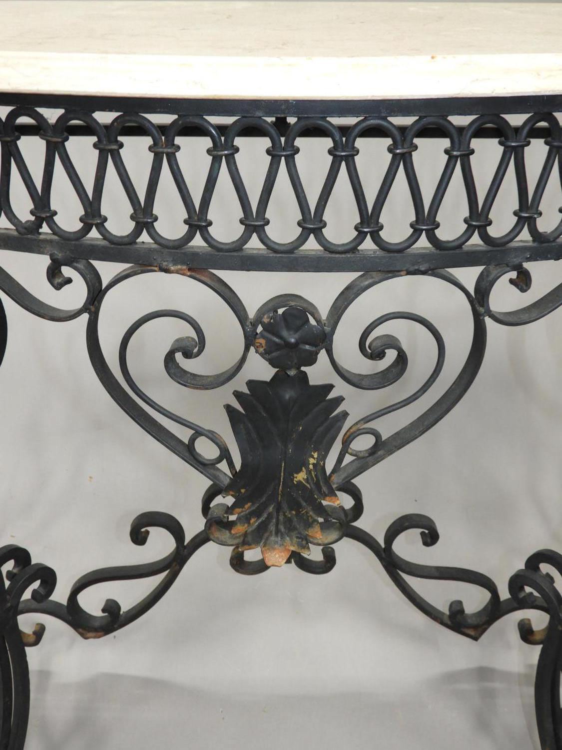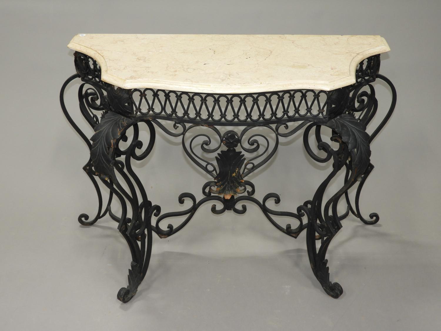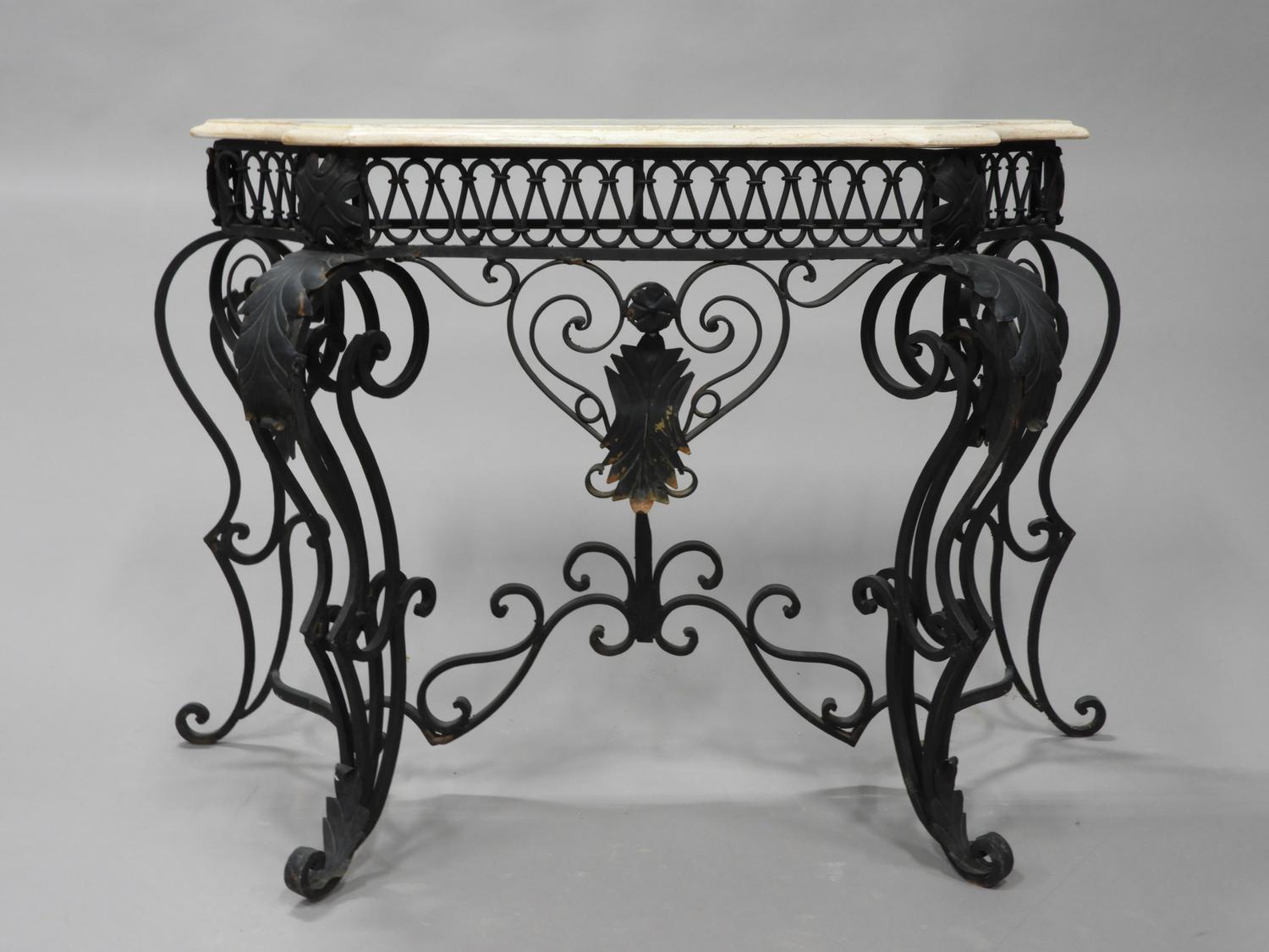 marble top wrought iron console table, mid 20th century, 31" x 46" x 19"