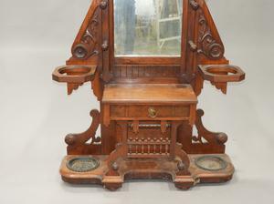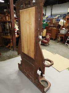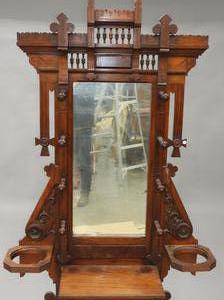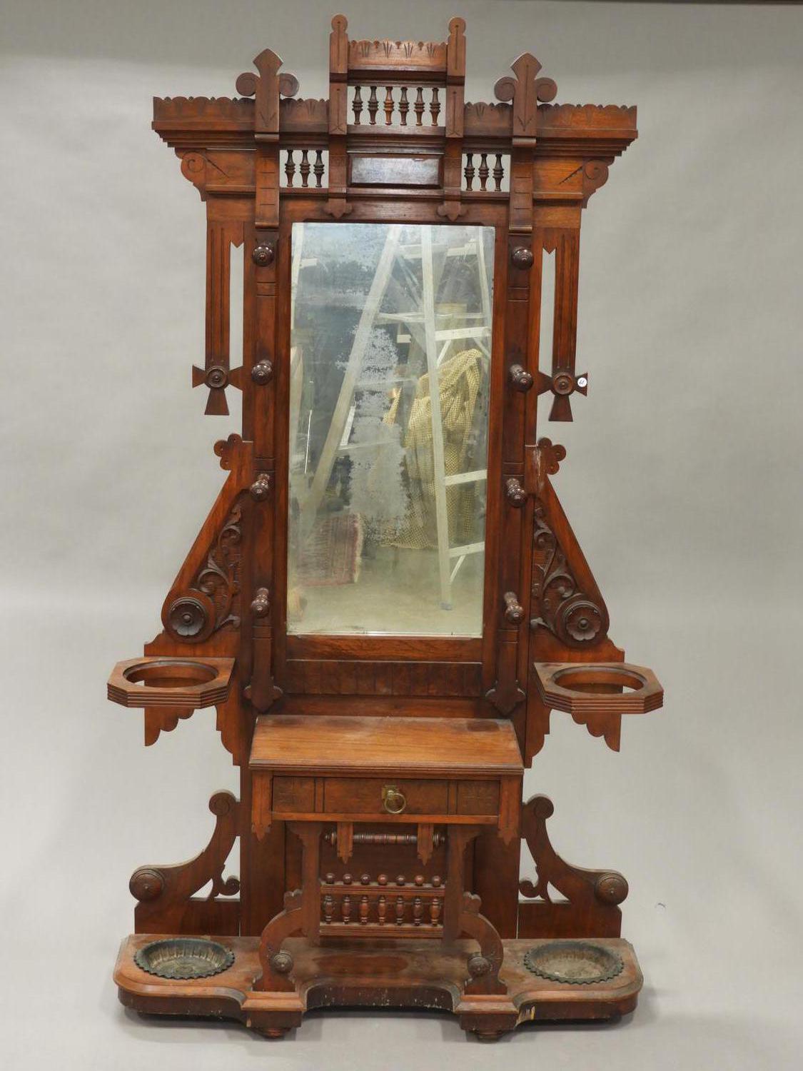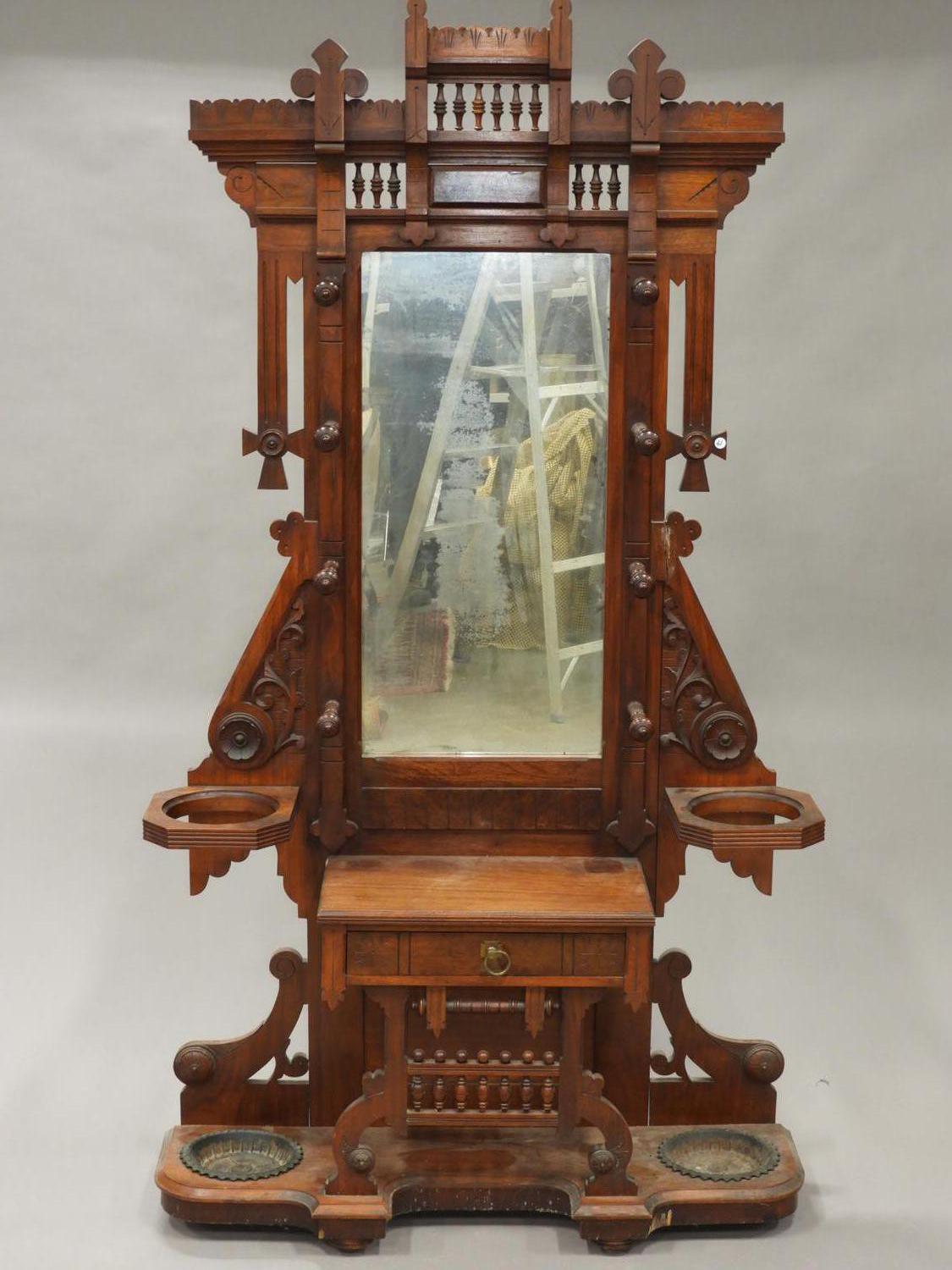 late 19th century carved walnut hall stand with inset mirror, 85" x 46" x 14"