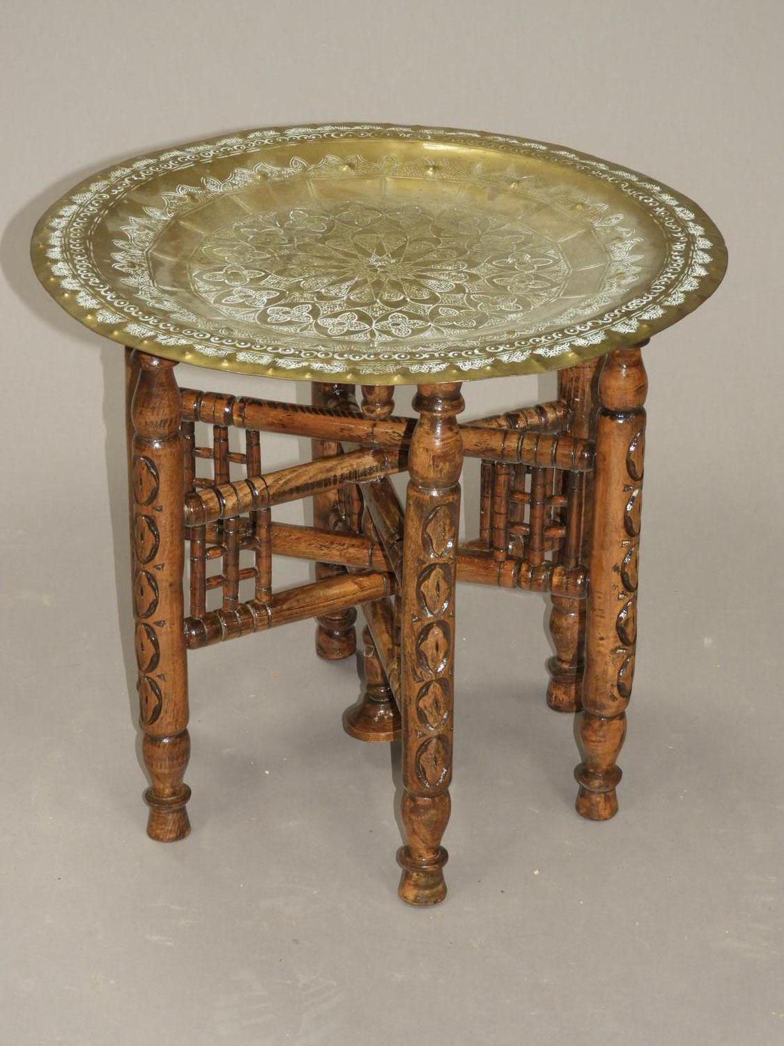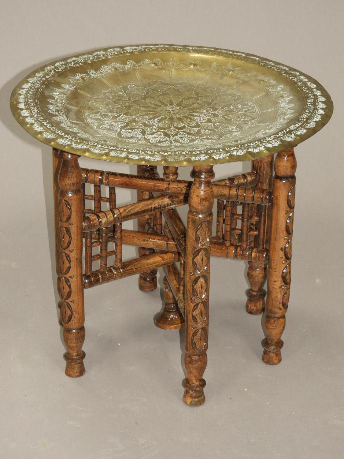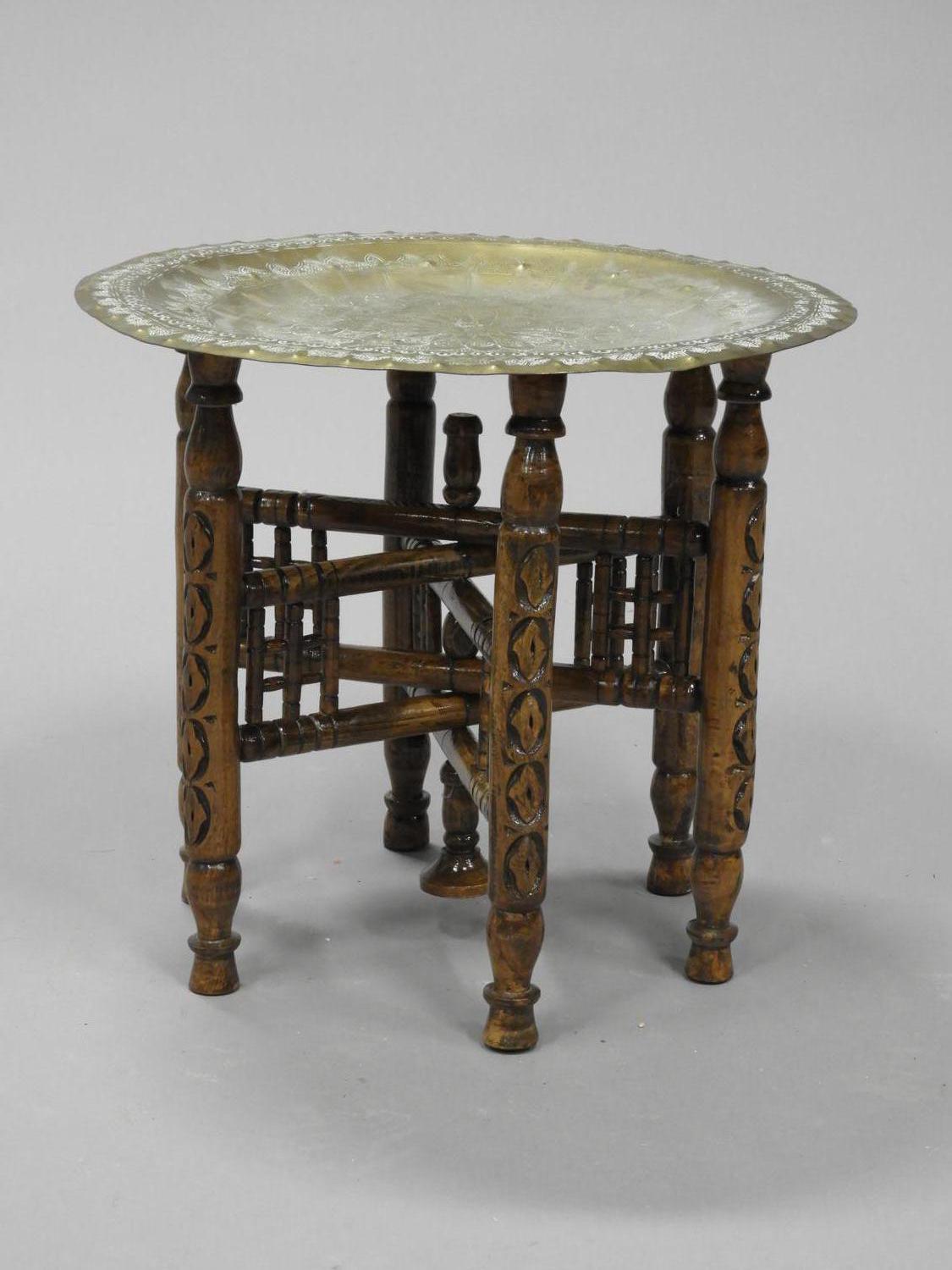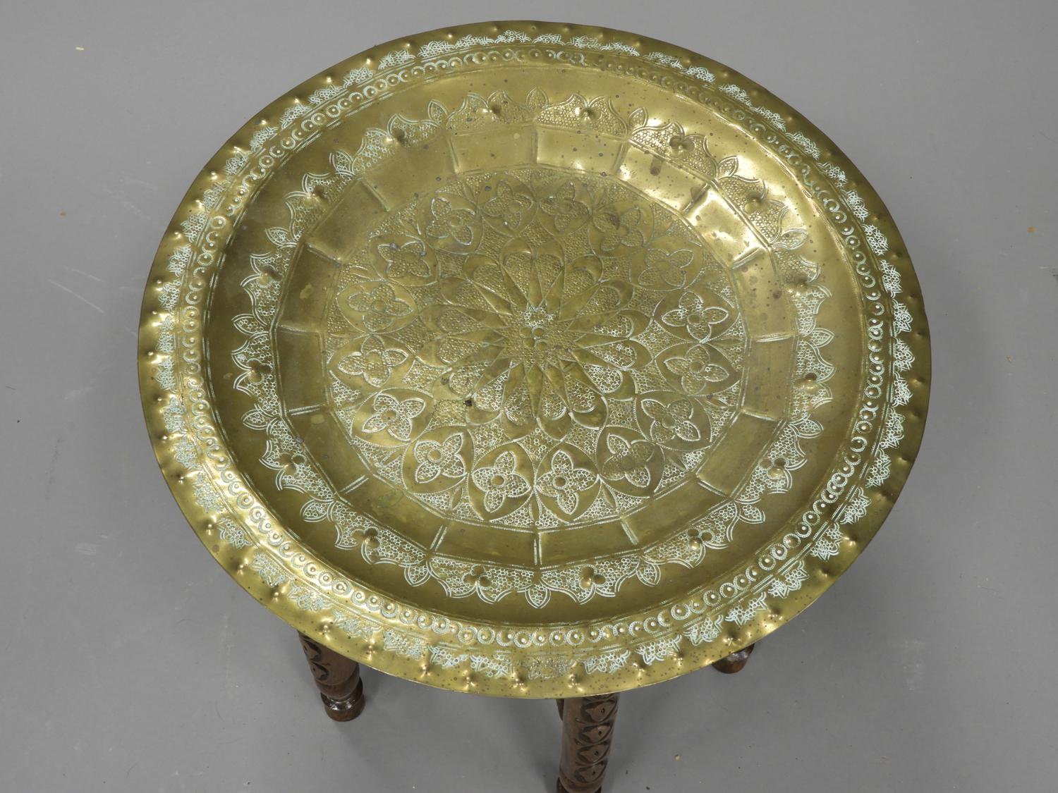 middle eastern brass tray with folding stand, early 20th century, 18" x 16"