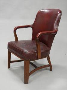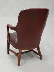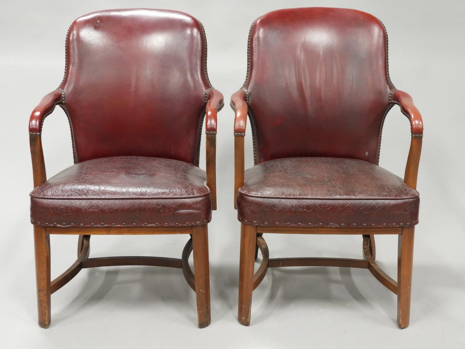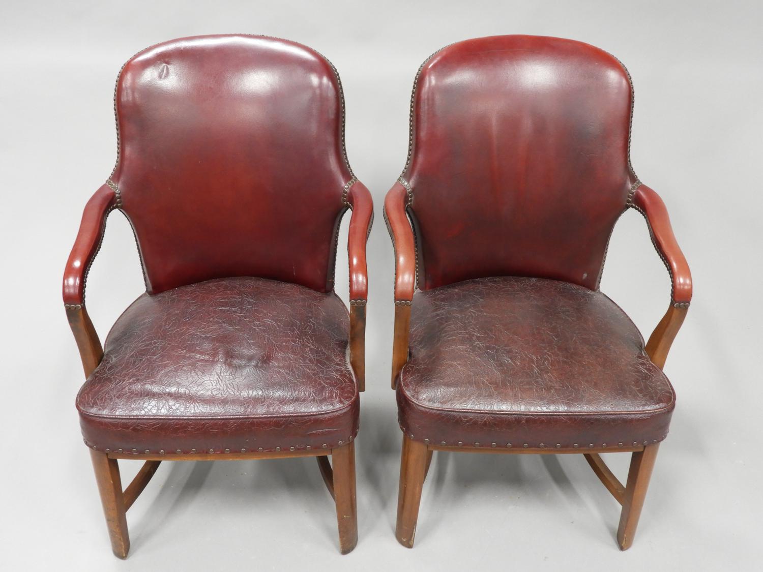 pair of close nail studded ox-blood leather upholstered armchairs, early 20th century