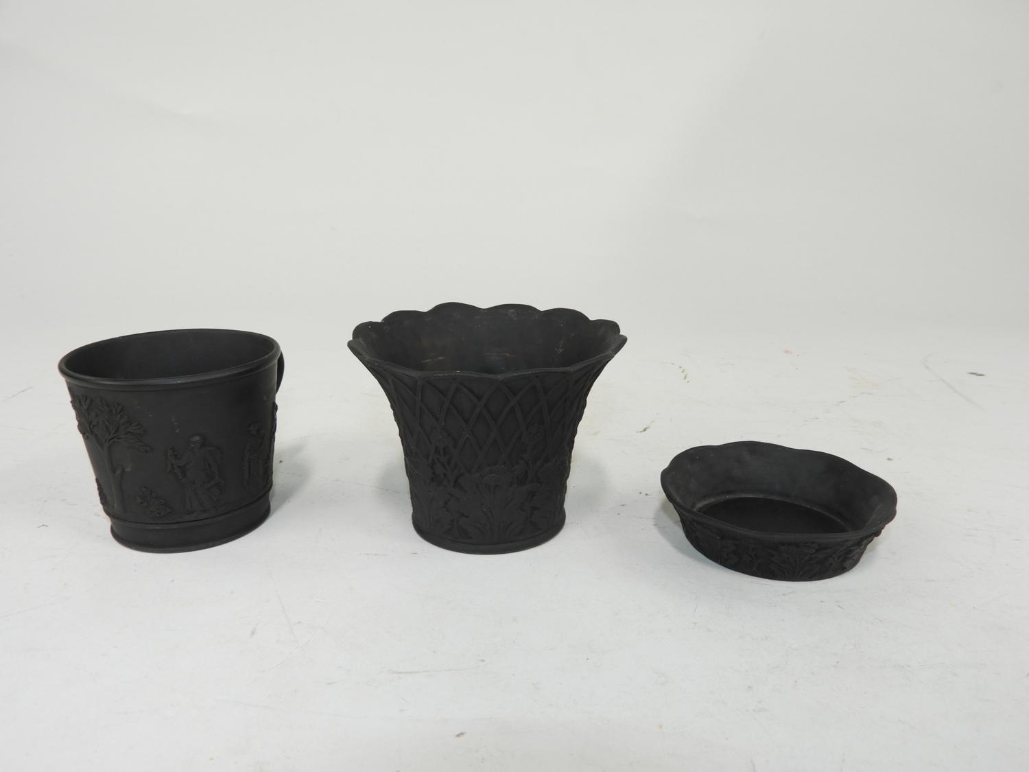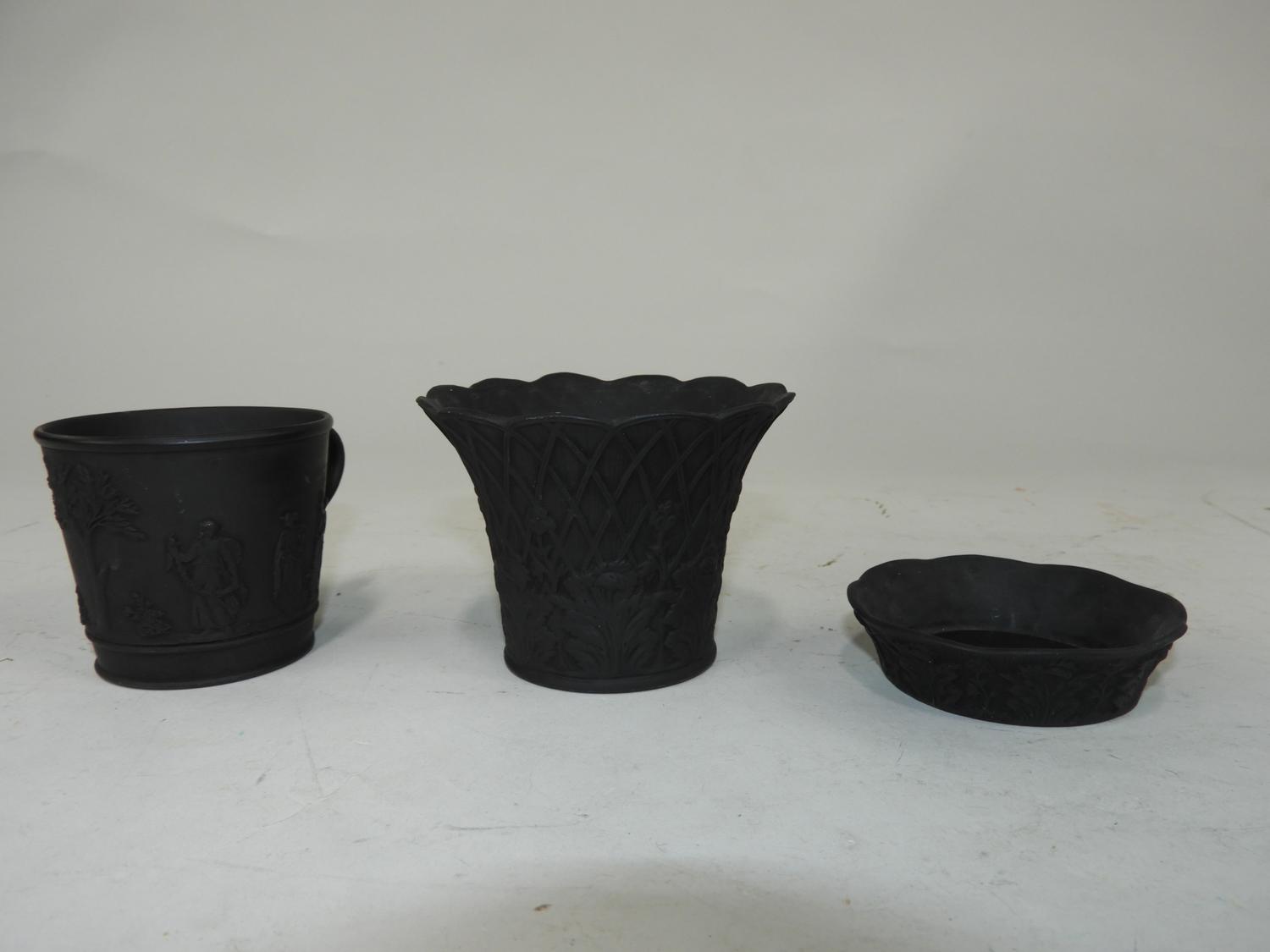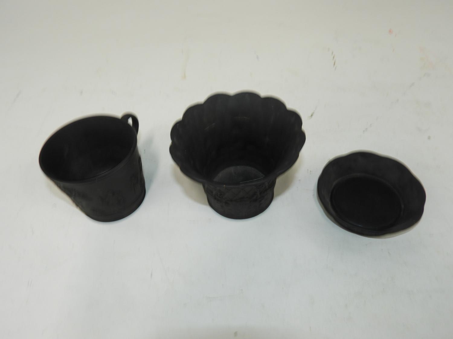 wedgewood black basalt vase, tray and cup, 3" x 4"