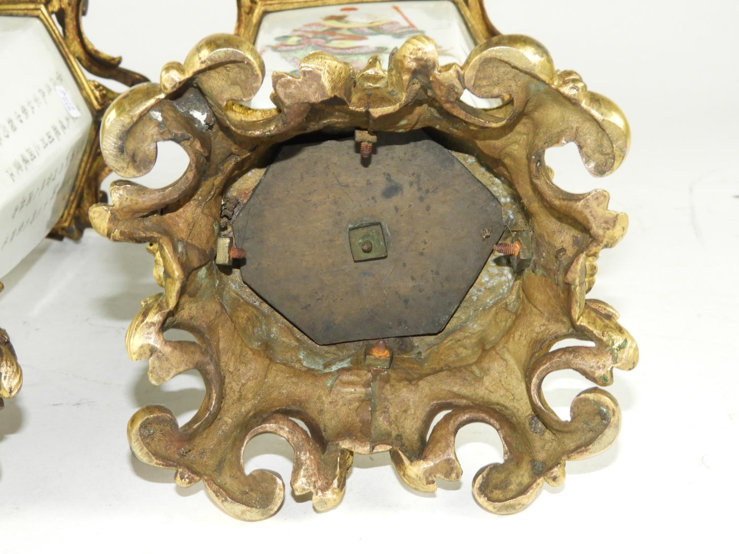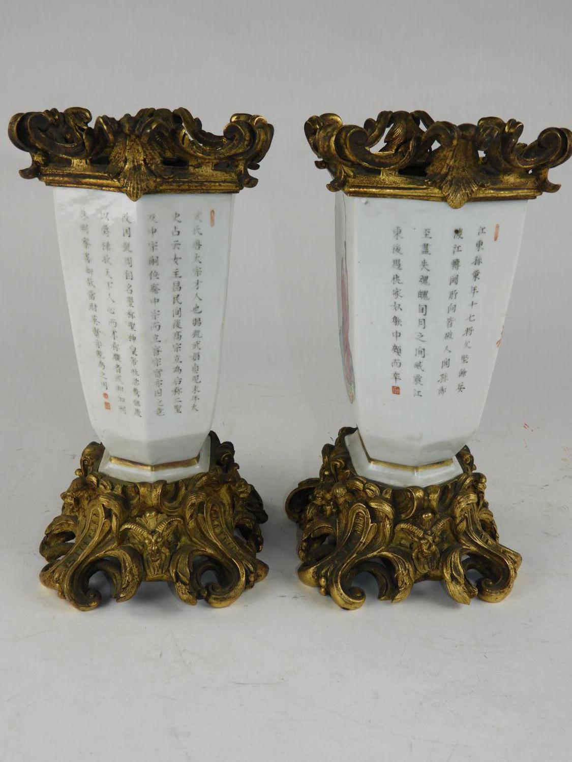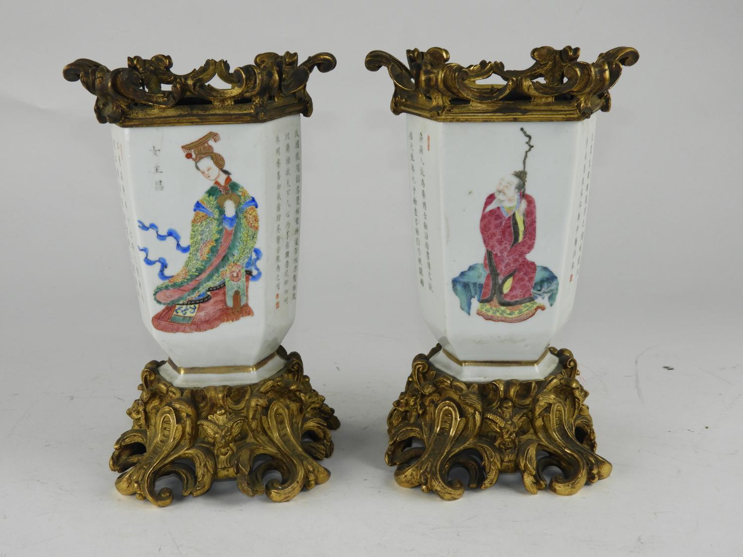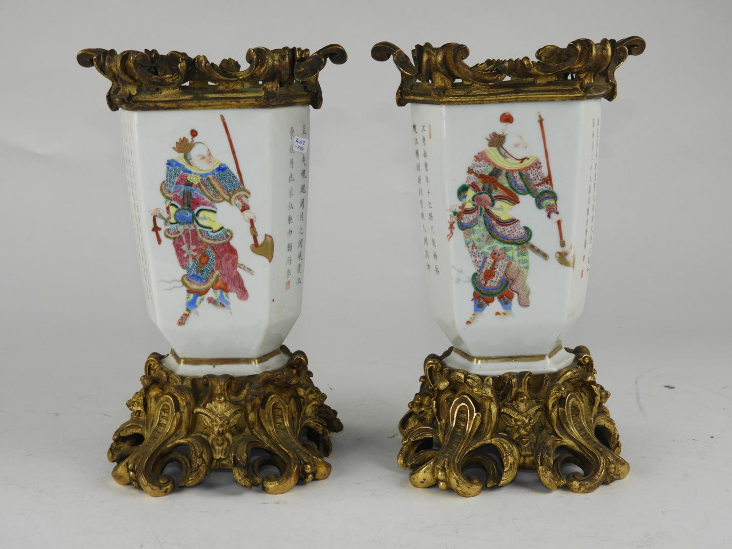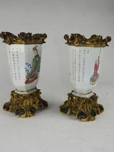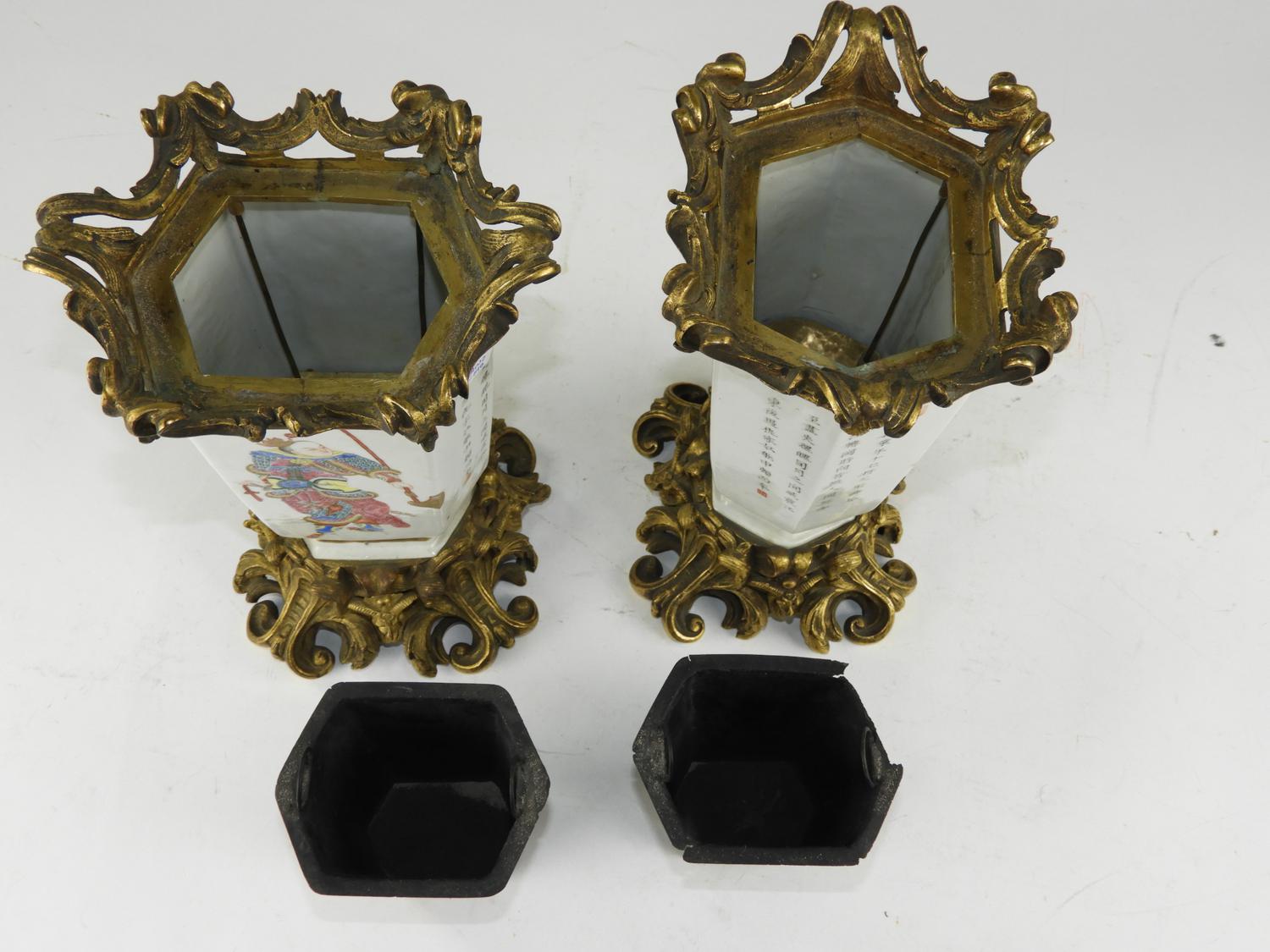 pair of ormolu mounted chinese porcelain vases with liners, ht. 11"