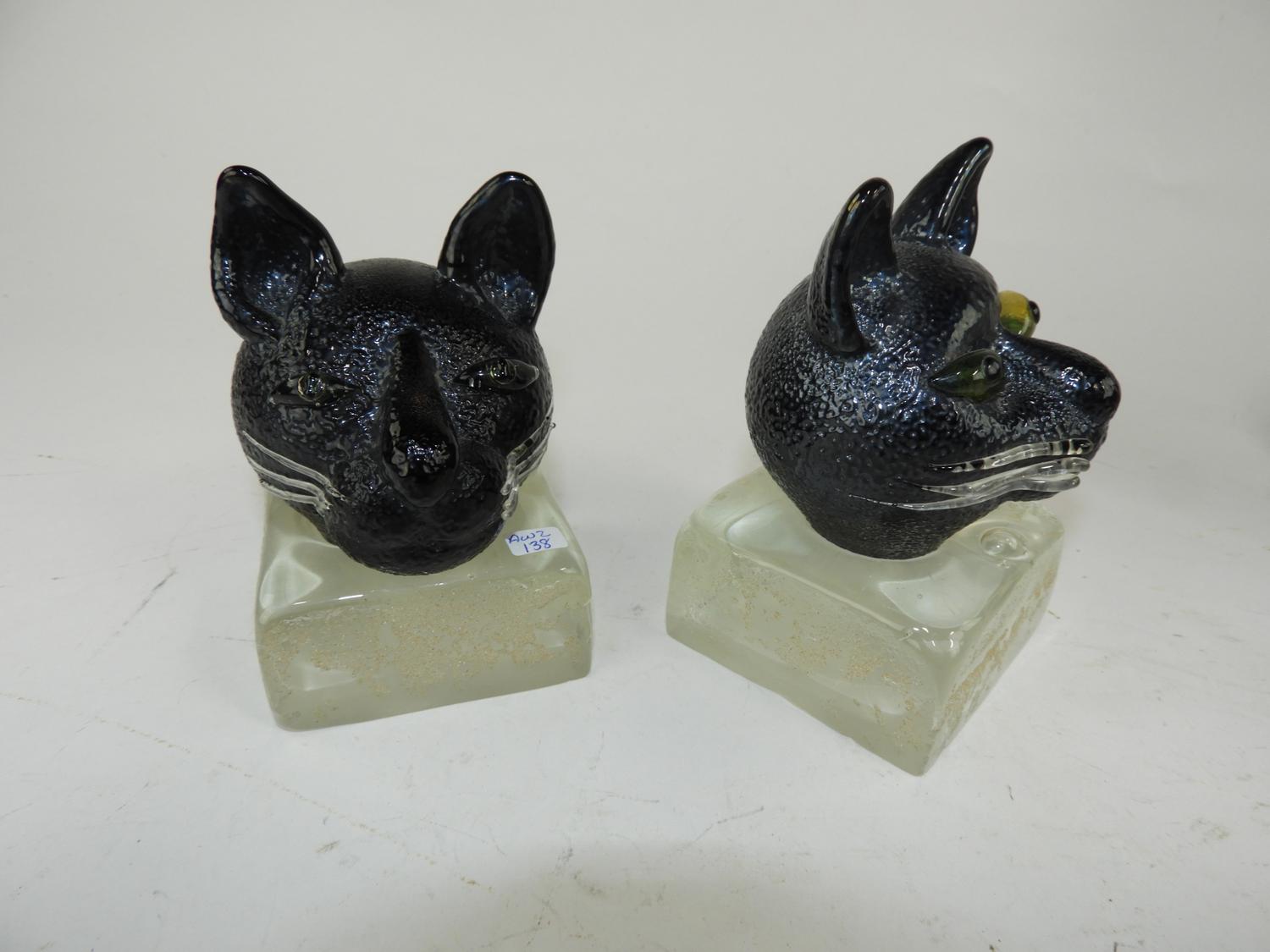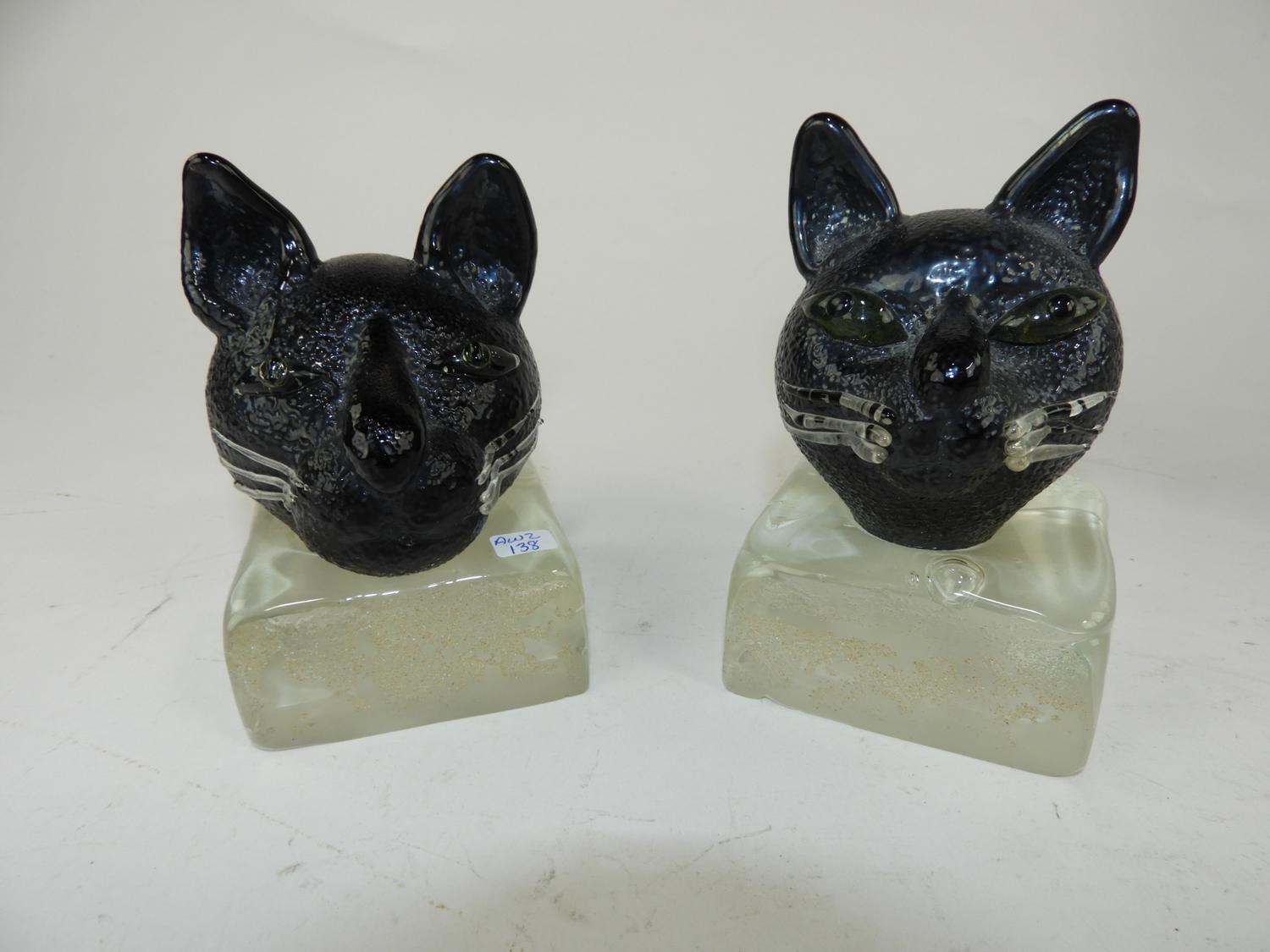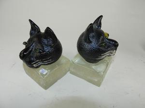 pr of art glass cat heads paperweights/ bookends, ht 5 1/2"