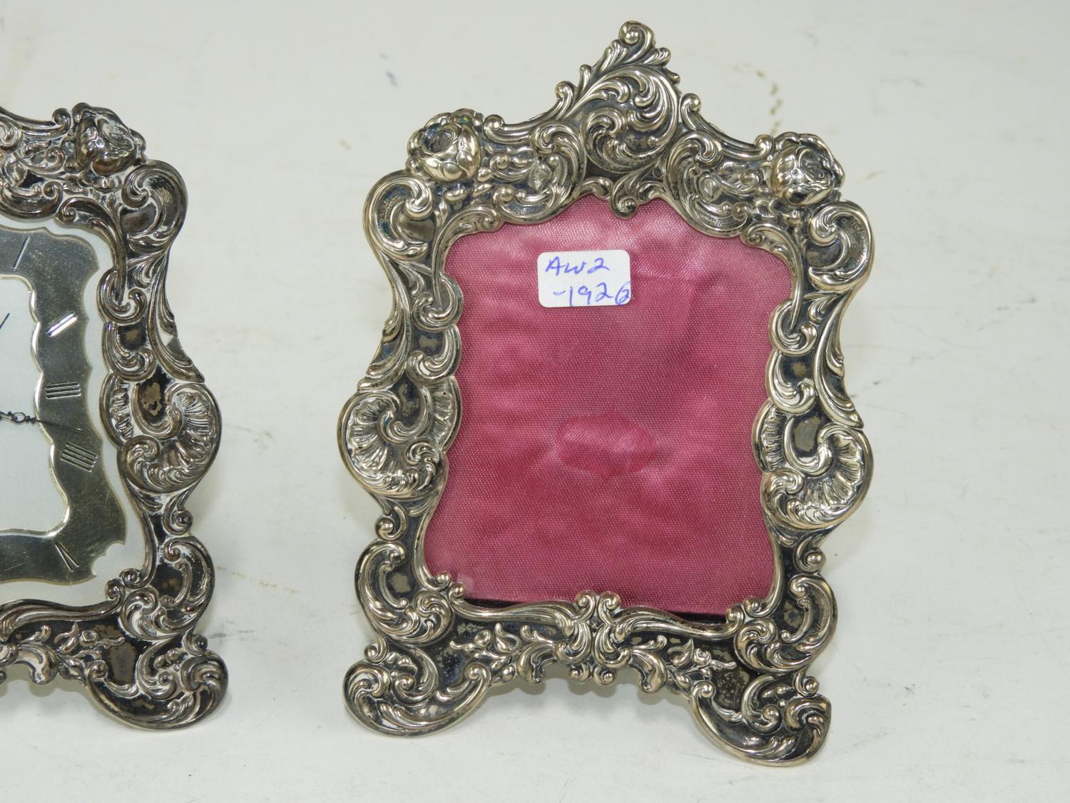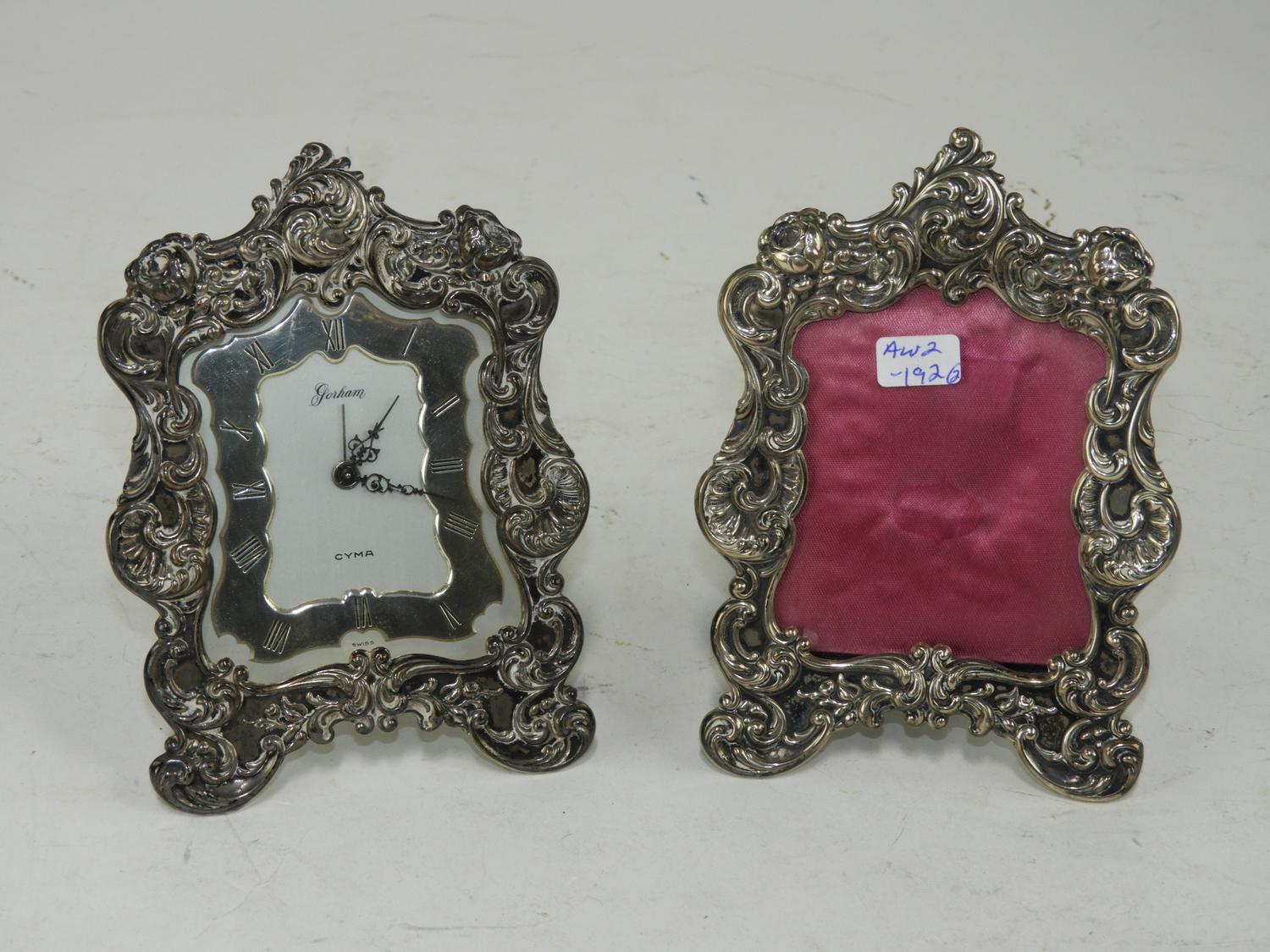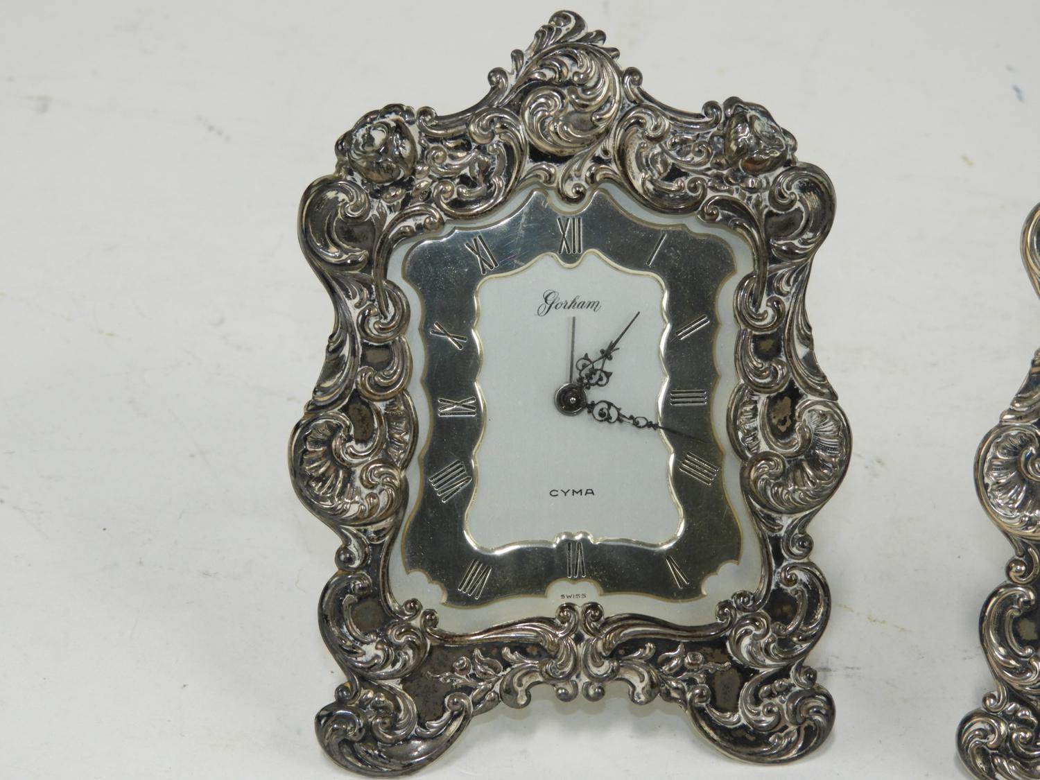gorham silver dresser clock with a cyma swiss alarm movement together with a similar dresser frame