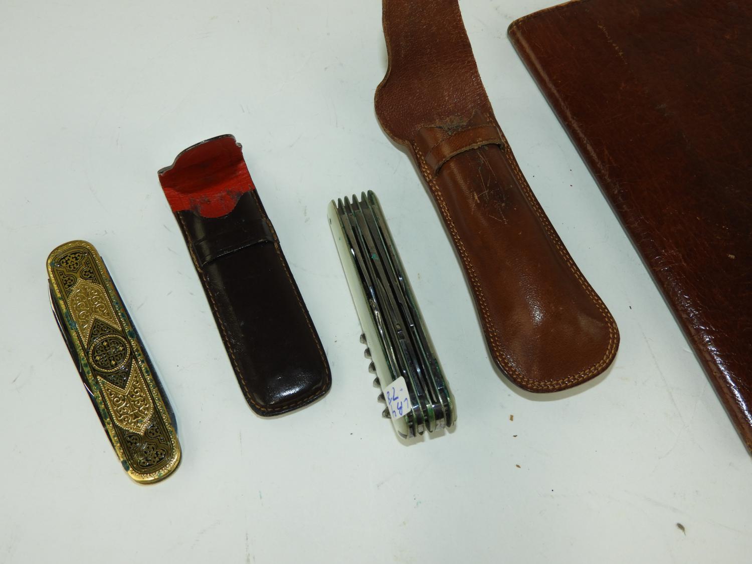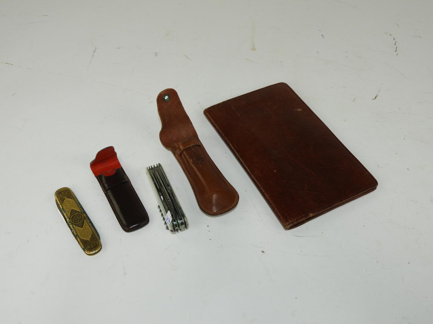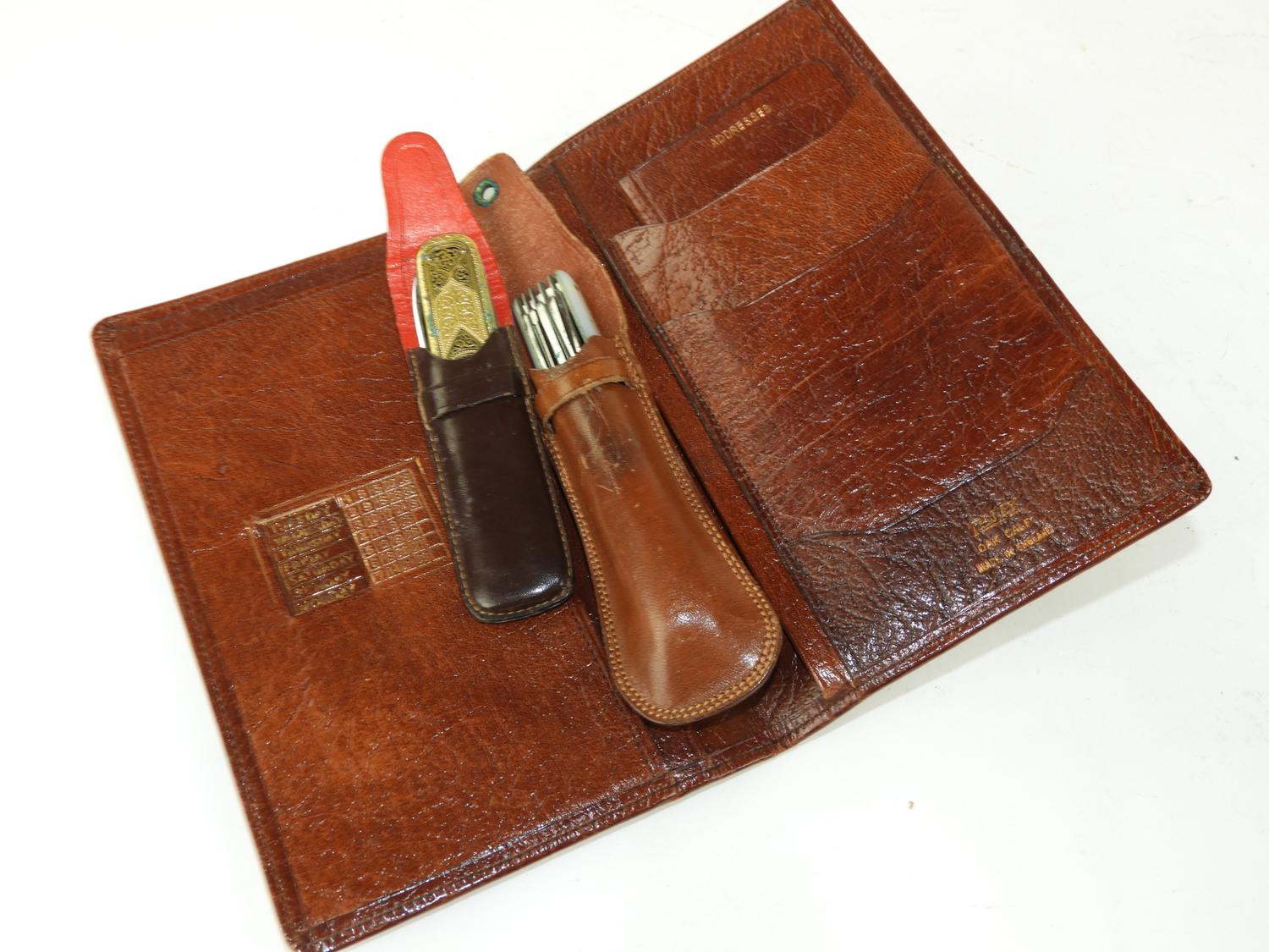 two leather cased pocket knives and a vintage tilley calf skin daytimer
