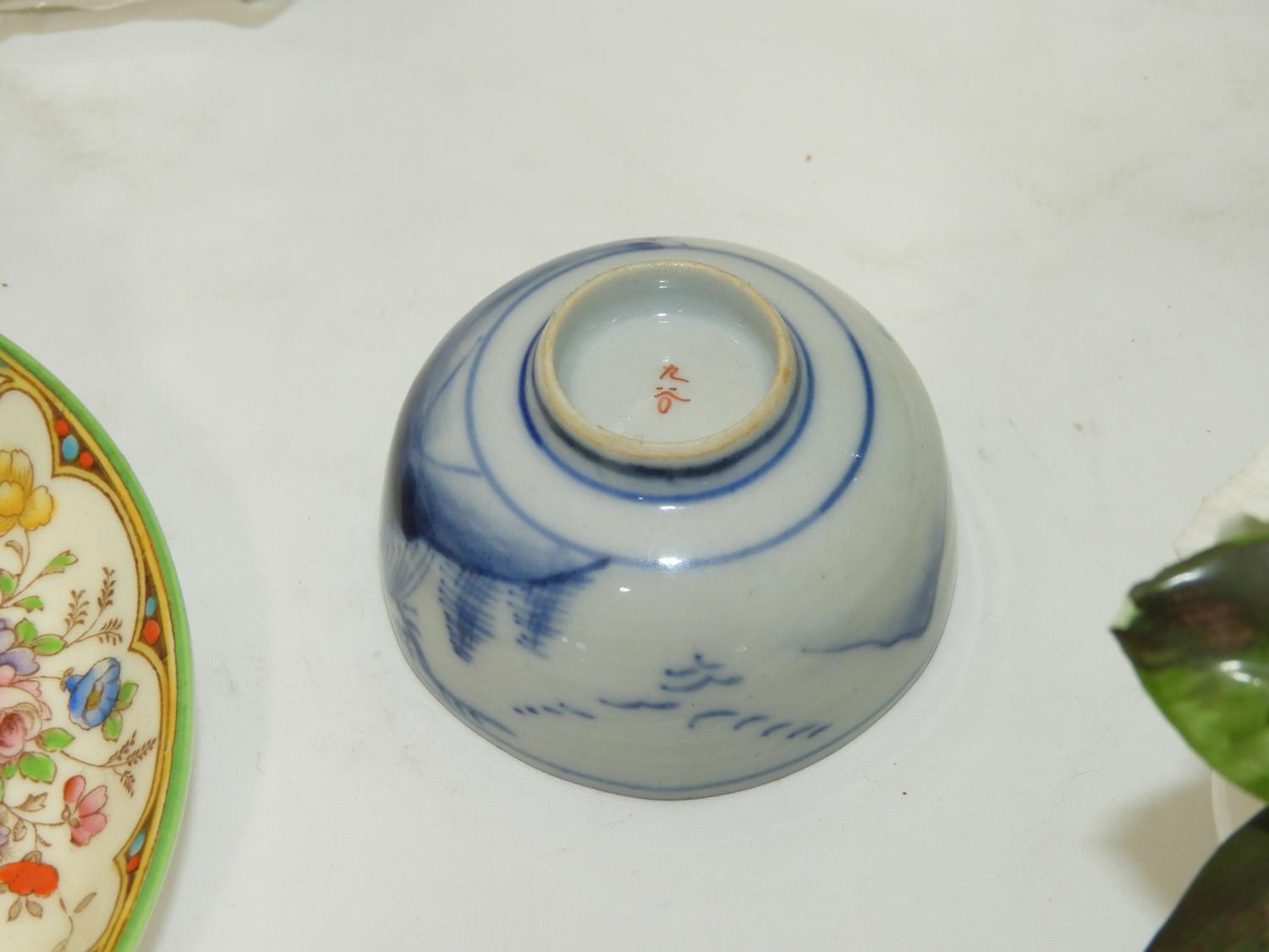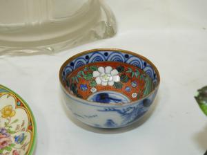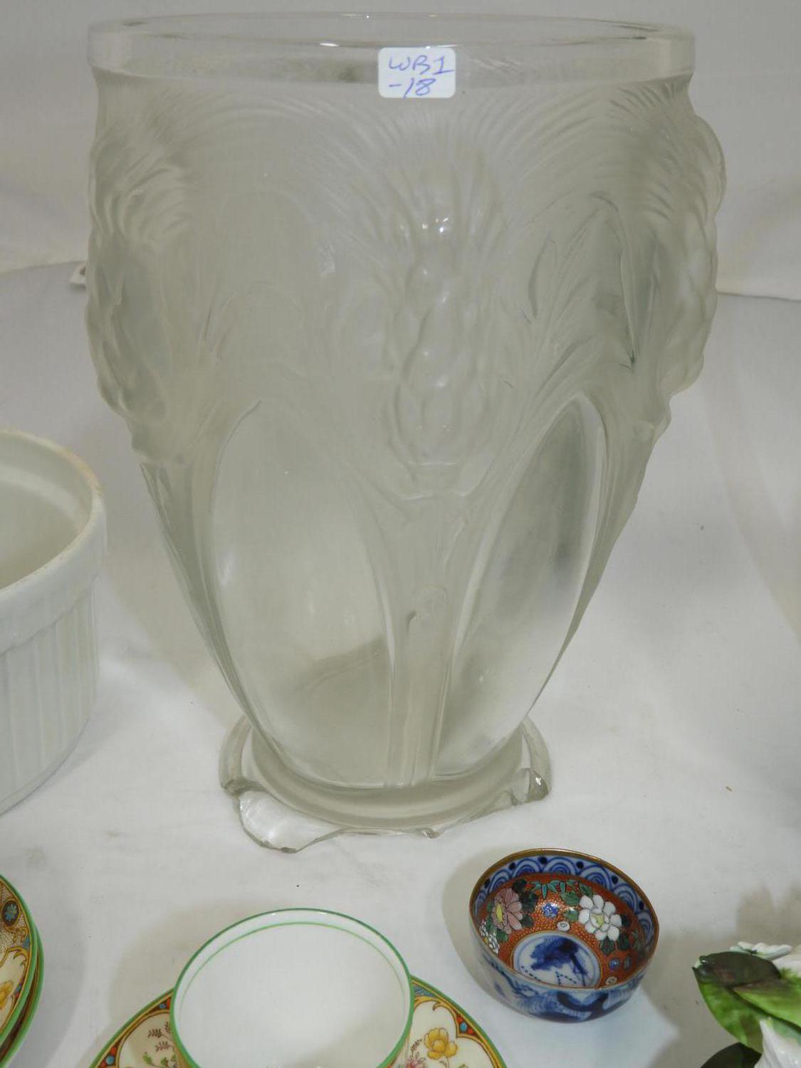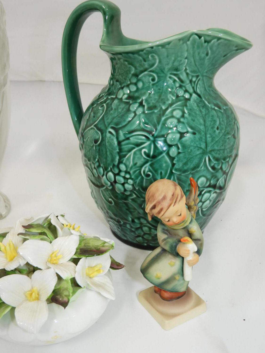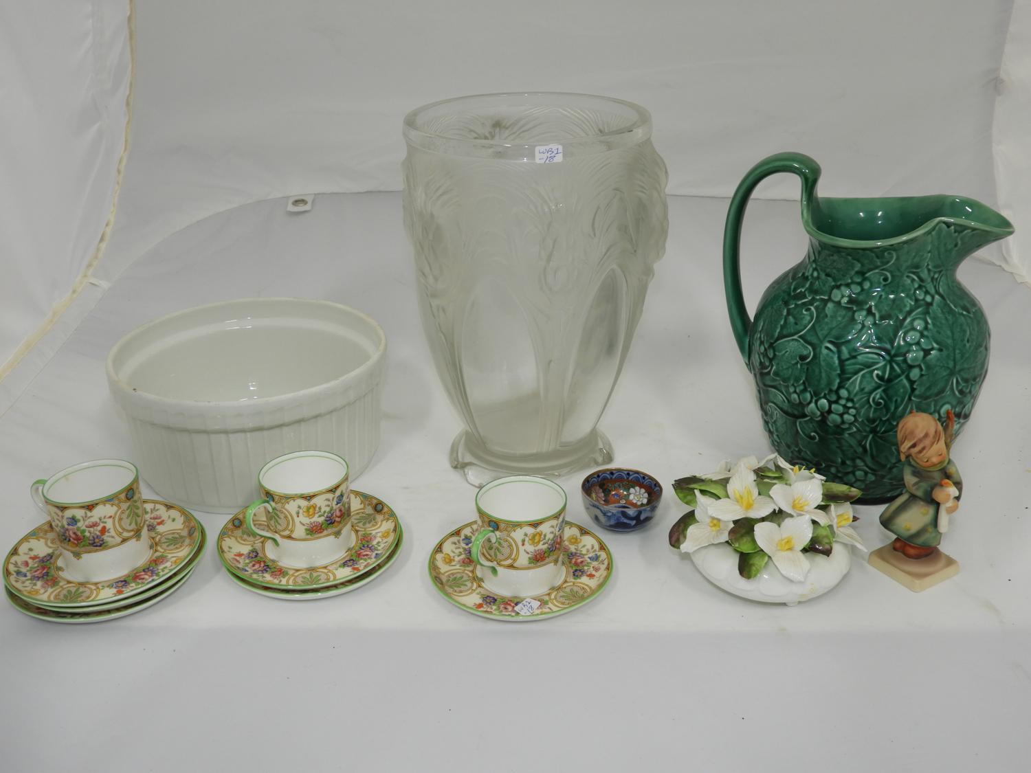 lot: verlys frosted glass vase (losses), wedgwood pitcher (chipped), aynsley demi tasse 3 cups and 6 saucers, royal addersley china floral group, chinese blue and white miniture bowl, hummel figurine and a casserole dish