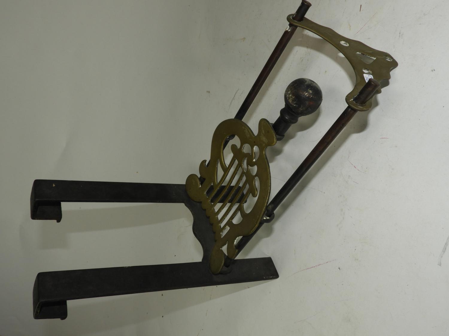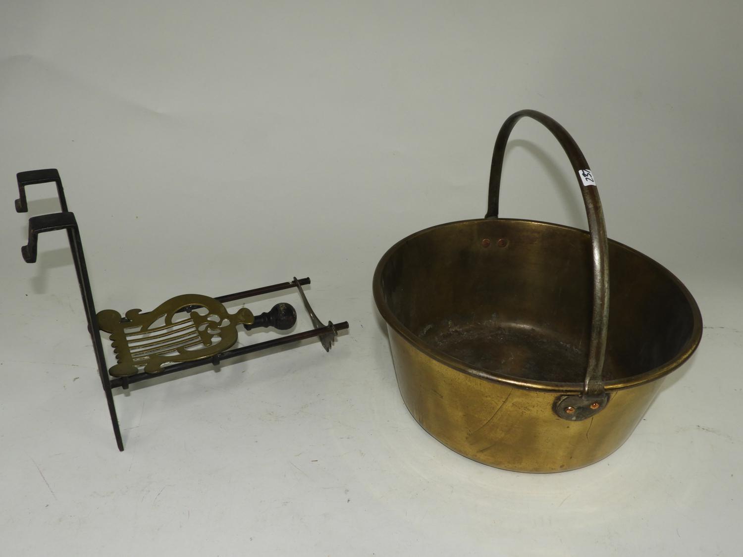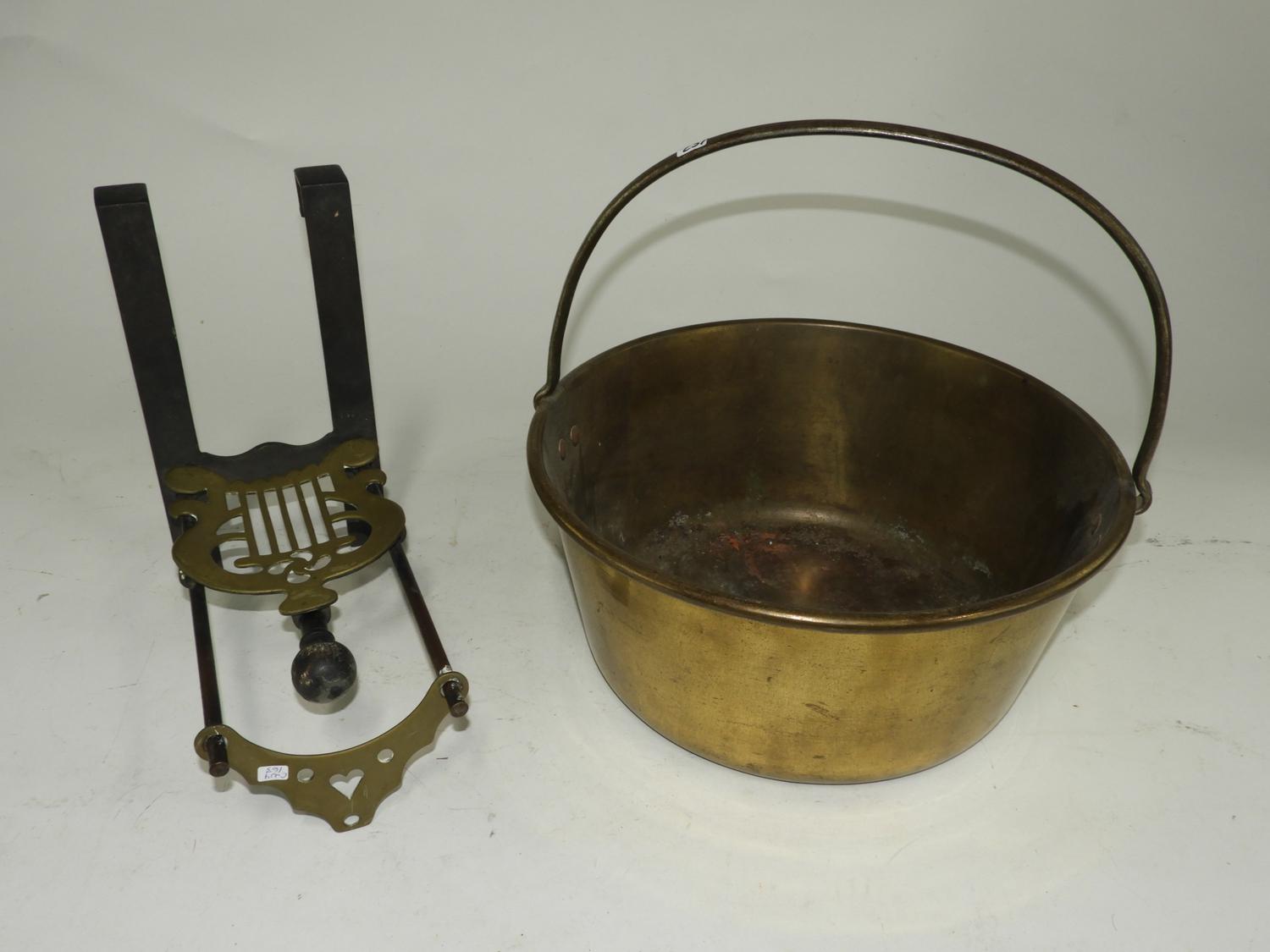 19th century brass jelly pan with a fire place bracket footman