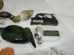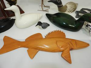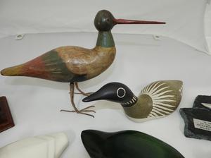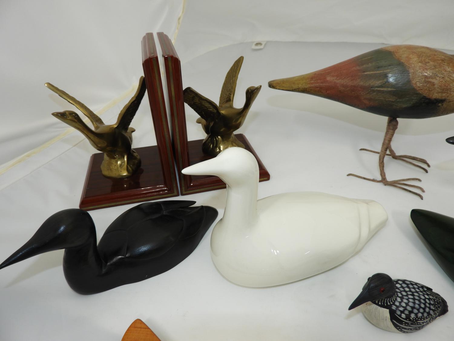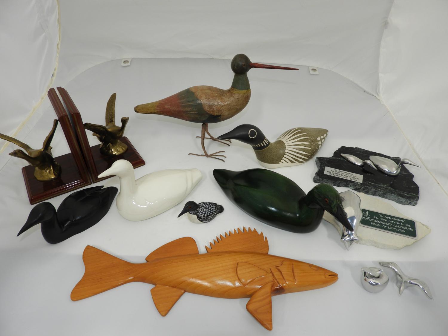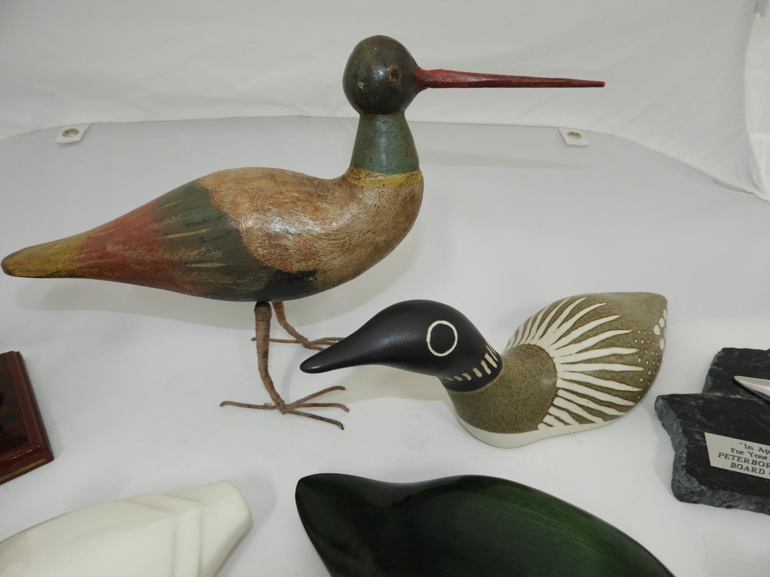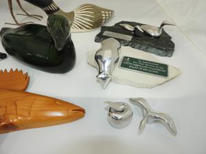 lot of duck decoys, bookends, pewter mounted presentation plaques