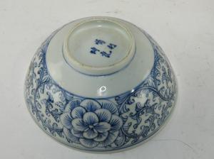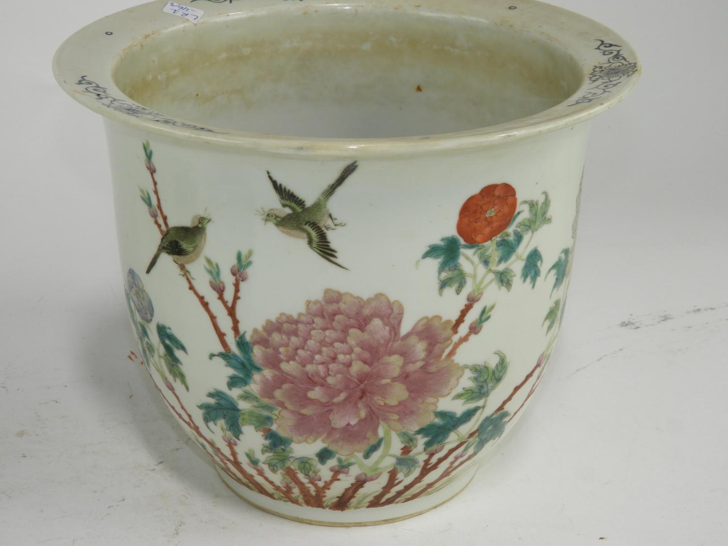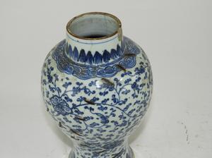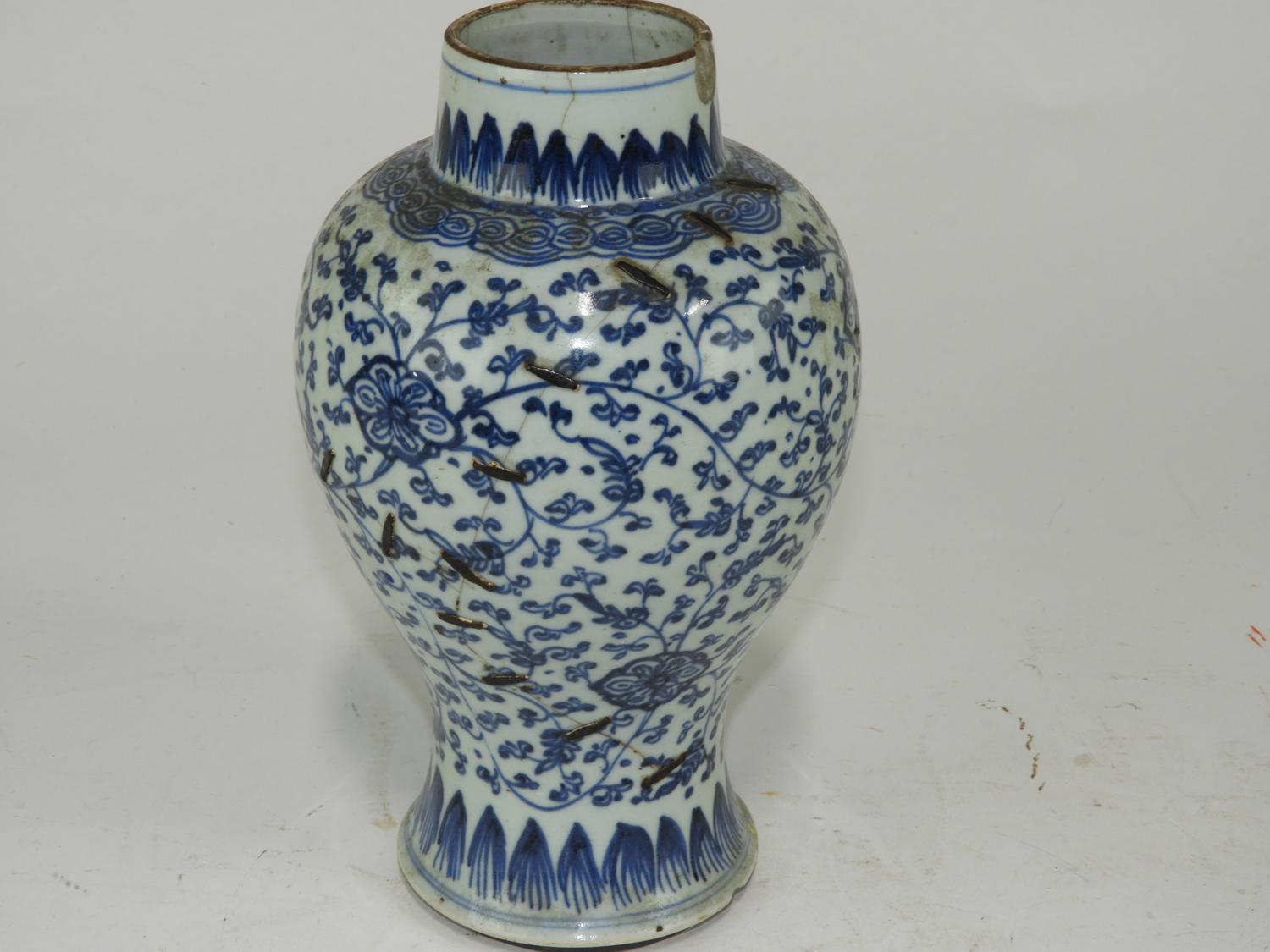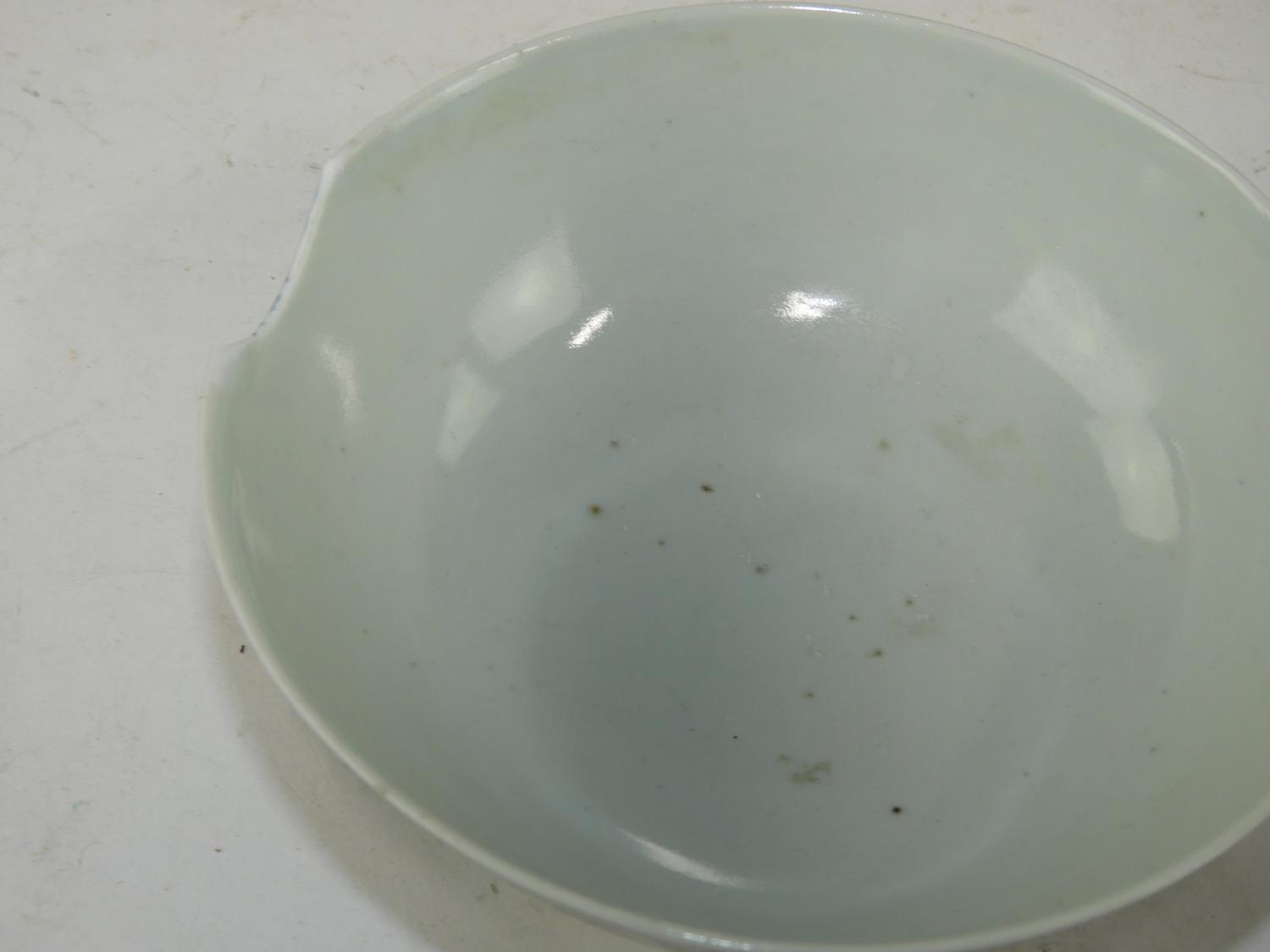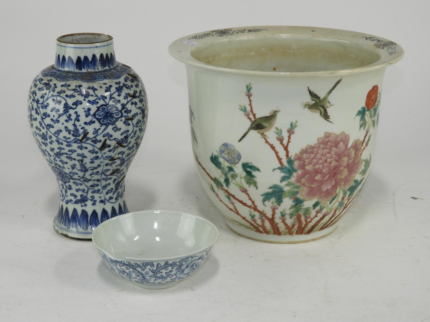 Jardinere is 8 1/2" in height, blue and white vase is 9", broken, bowl is chipped