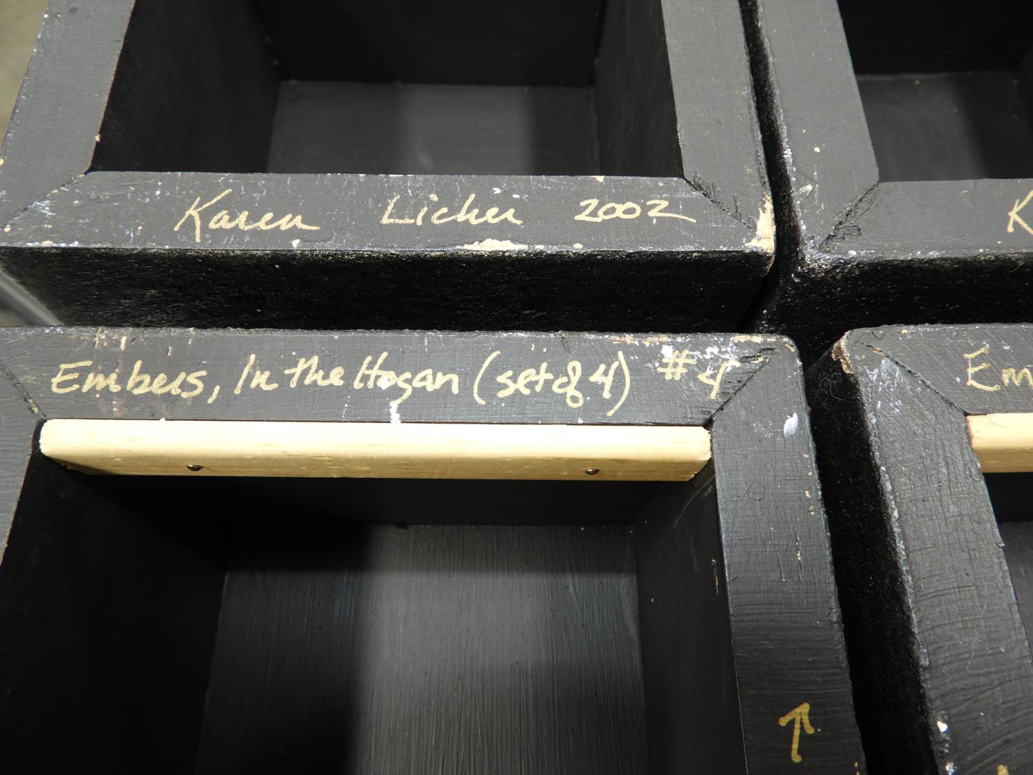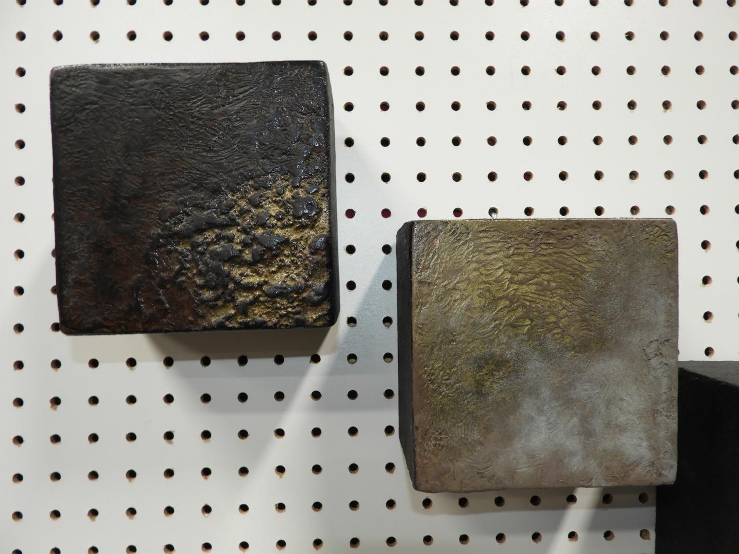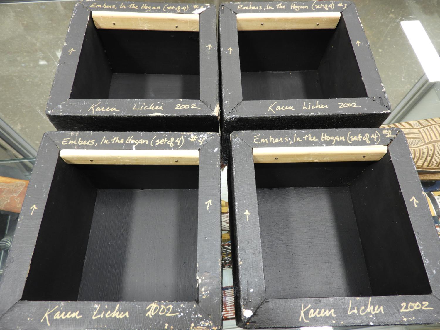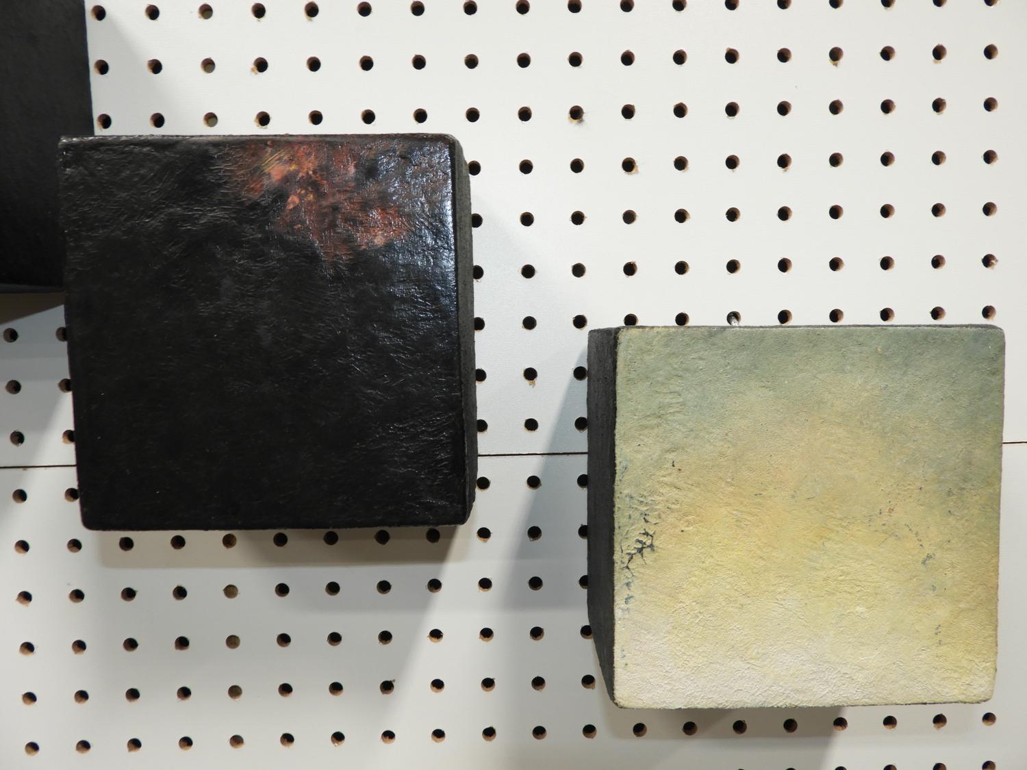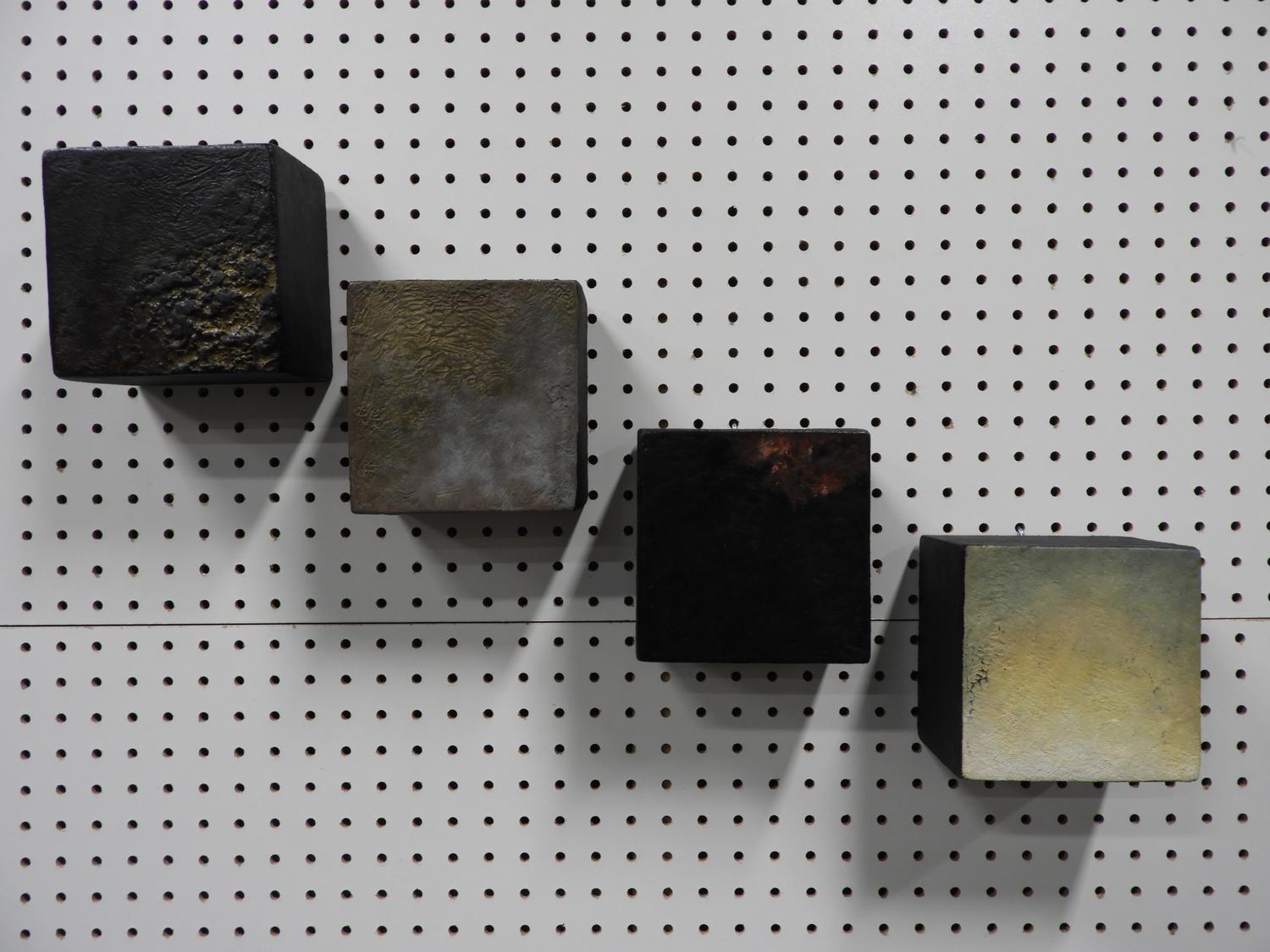 karen lichen, d. 2002, 4 oils earth on panel cubes, 5 1/2" x 5 1/2" "embers"