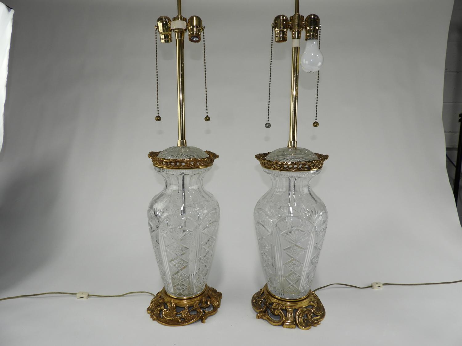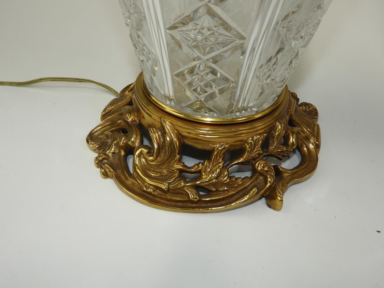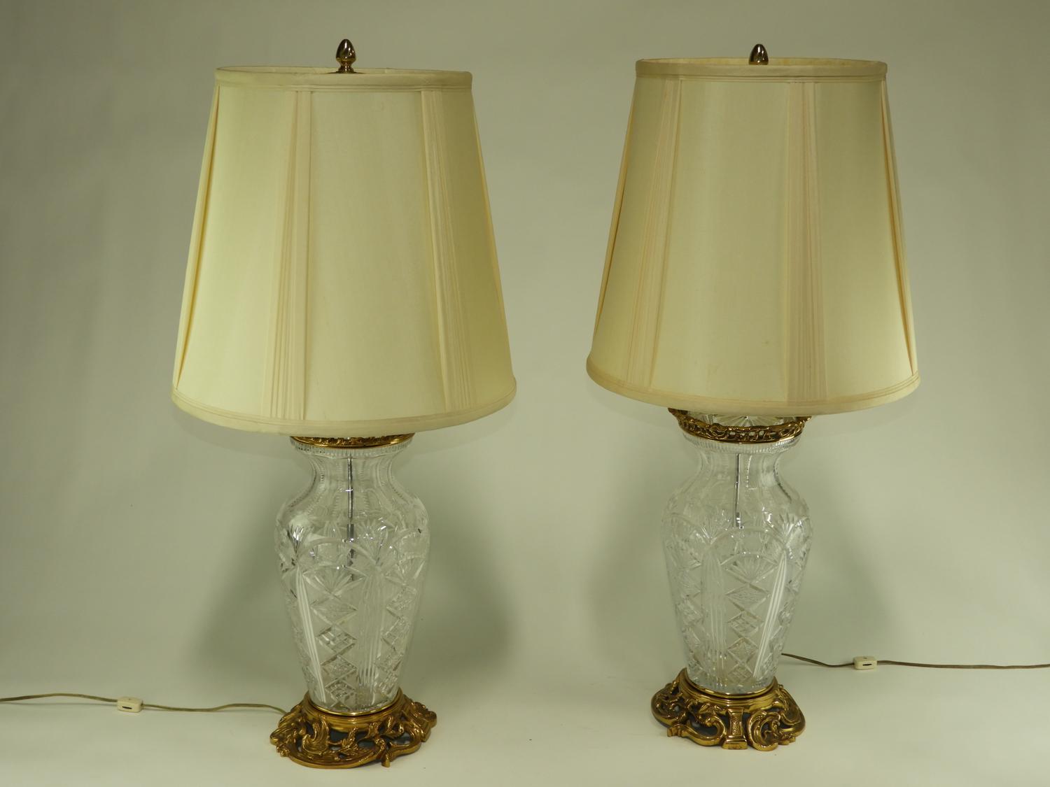 pair of cut crystal gilt metal mounted table lamps with shades, mid 20th century, ht. 37"