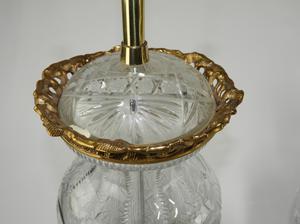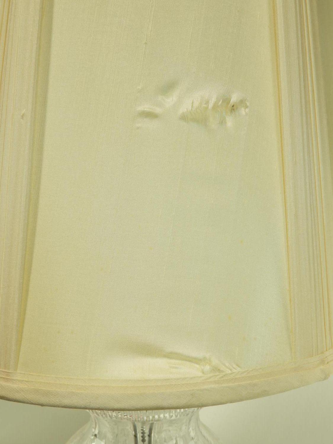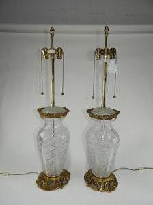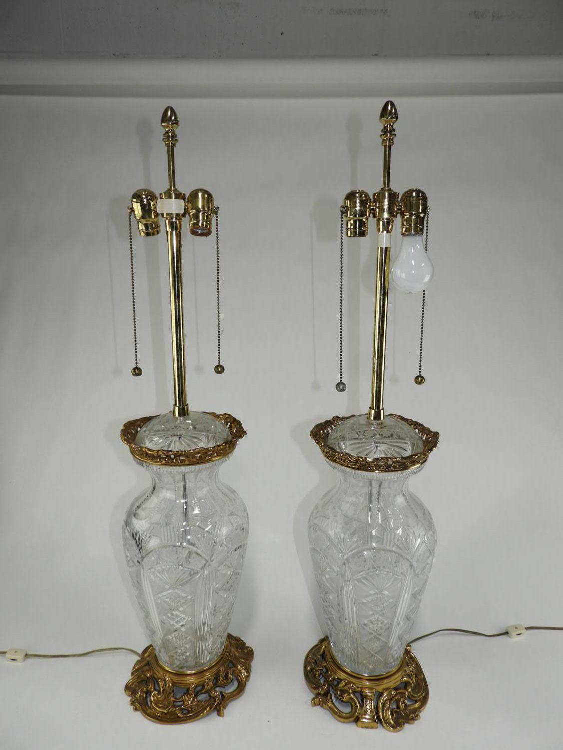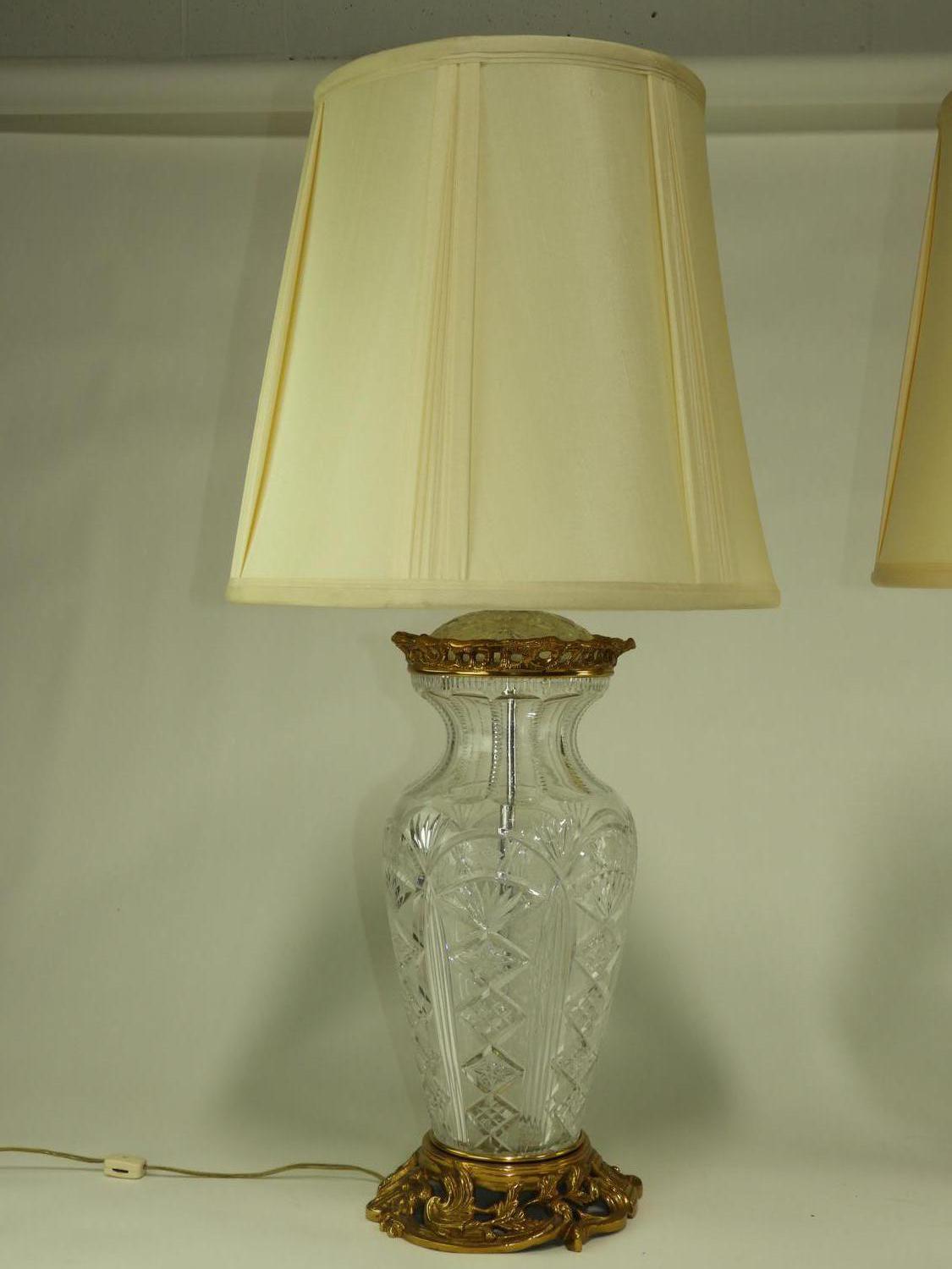 pair of cut crystal gilt metal mounted table lamps with shades, mid 20th century, ht. 37"