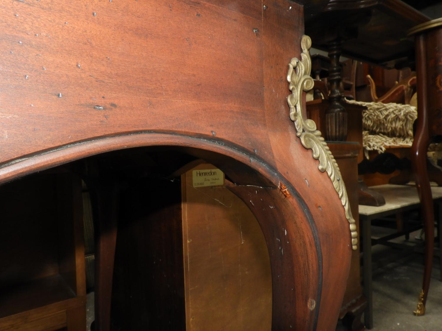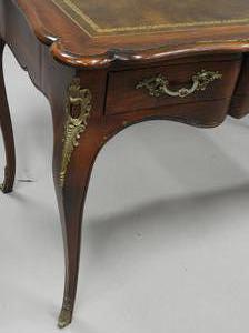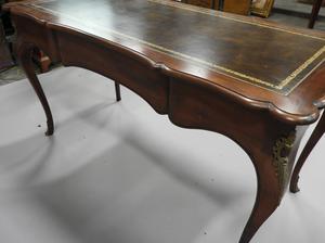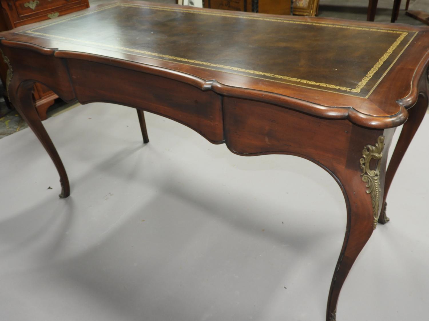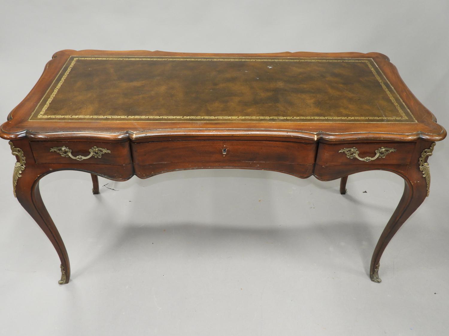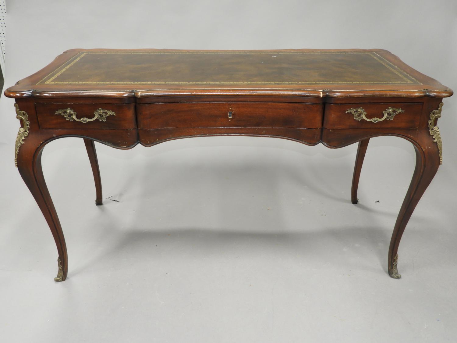 louis xv-style gilt mounted mahogany finish writing table with gilt tooled leather inset top, 29" x 54" x 26"
