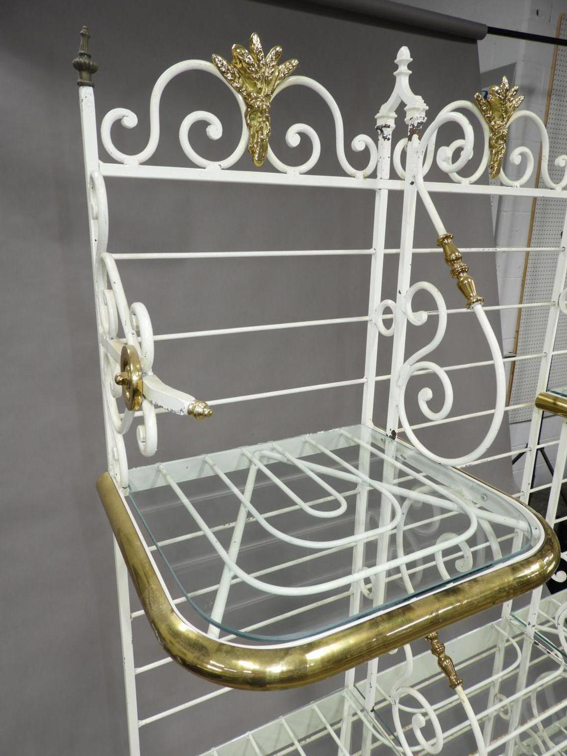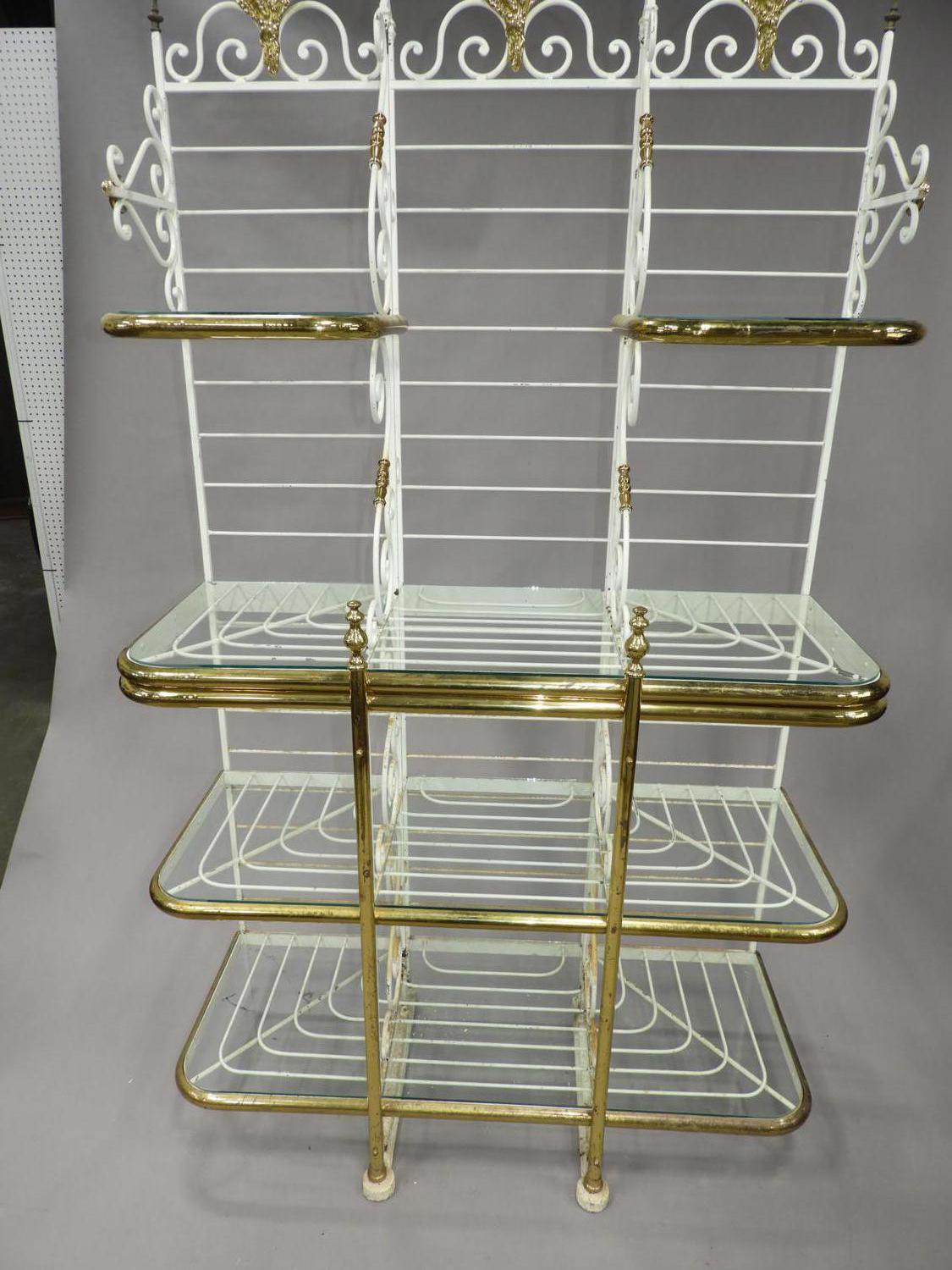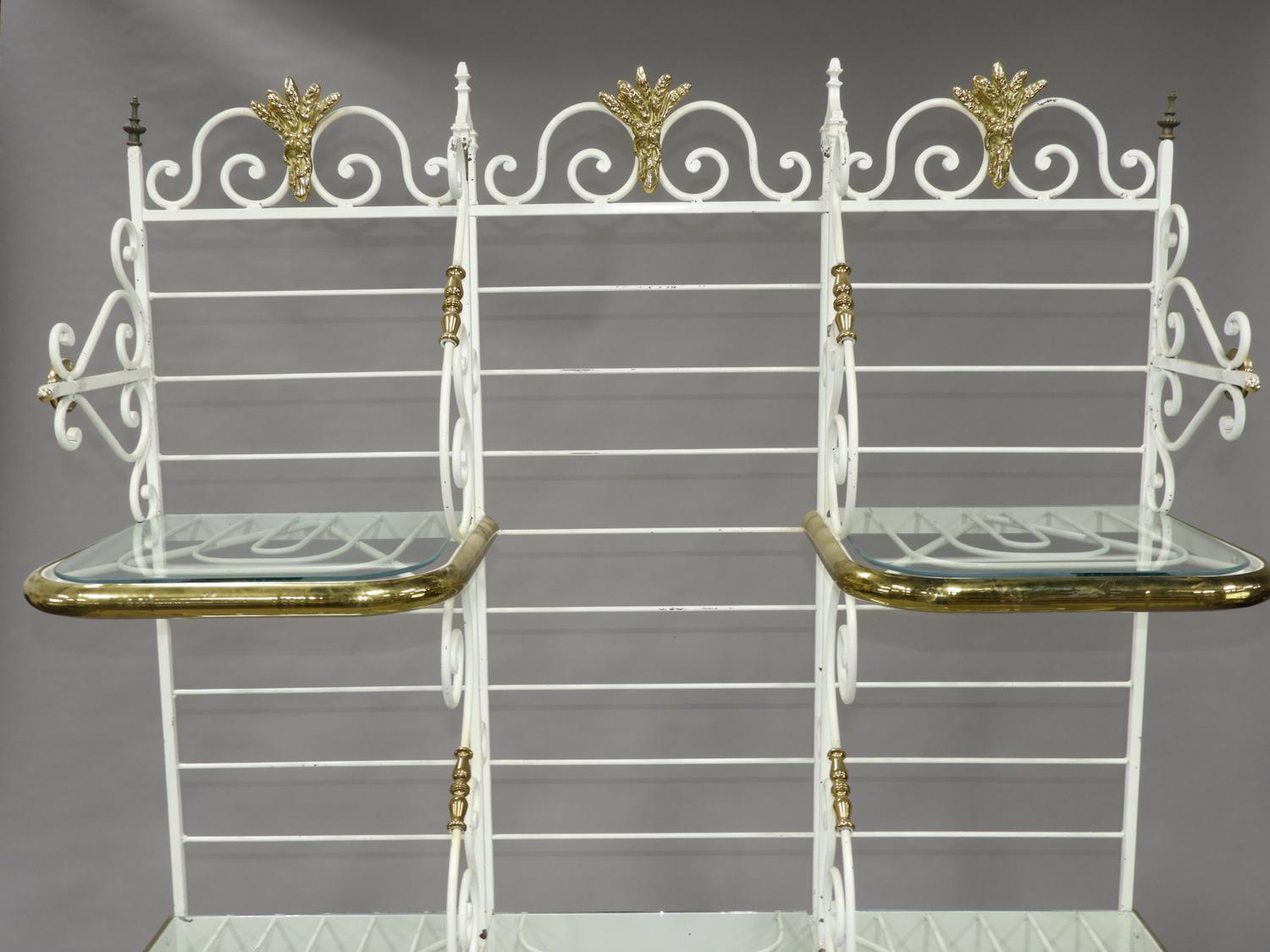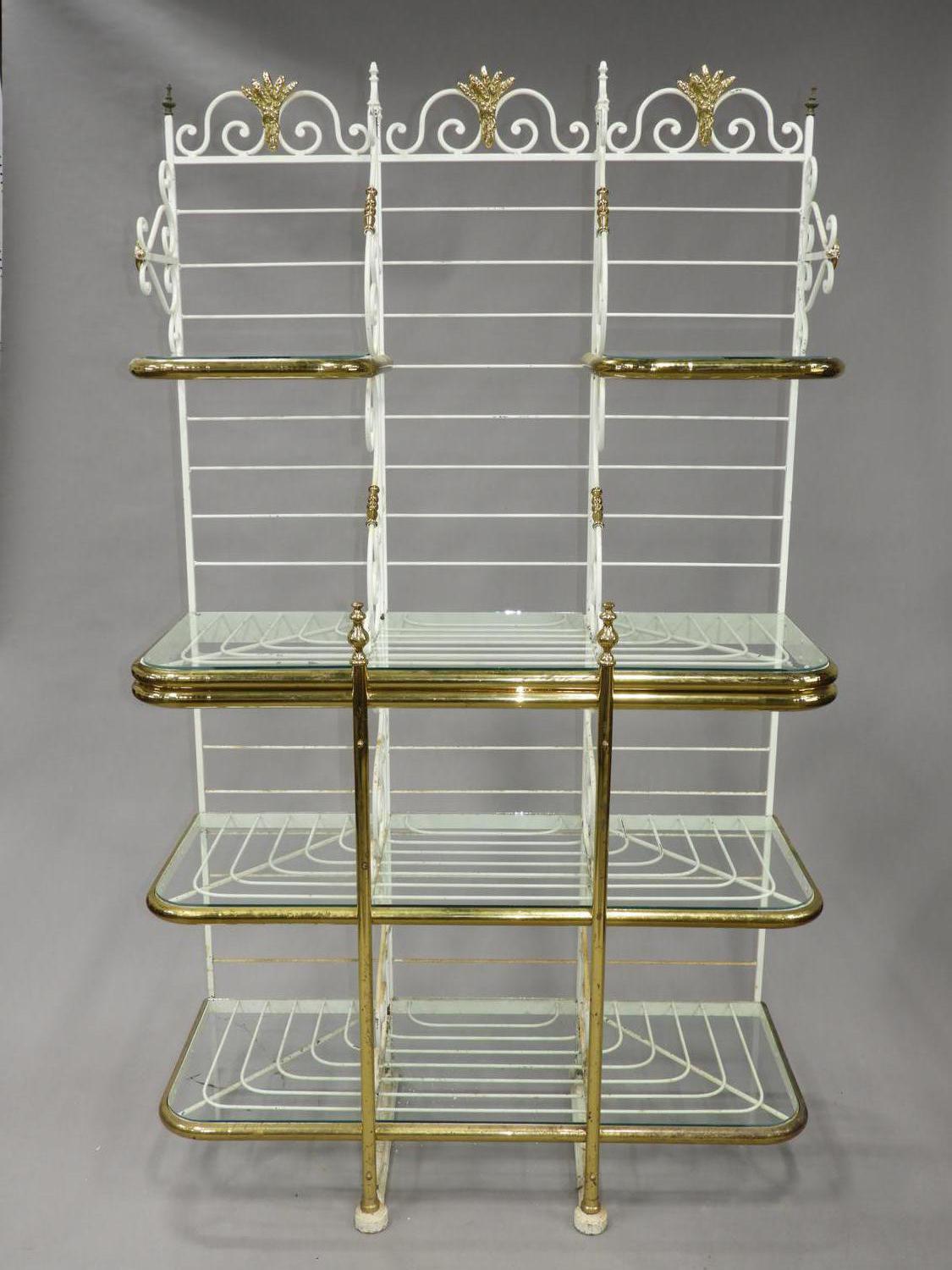 french brass and painted wrought iron bakers rack with glass shelves, stamped perfil fils ltd. paris france, 84" x 49" x 21"