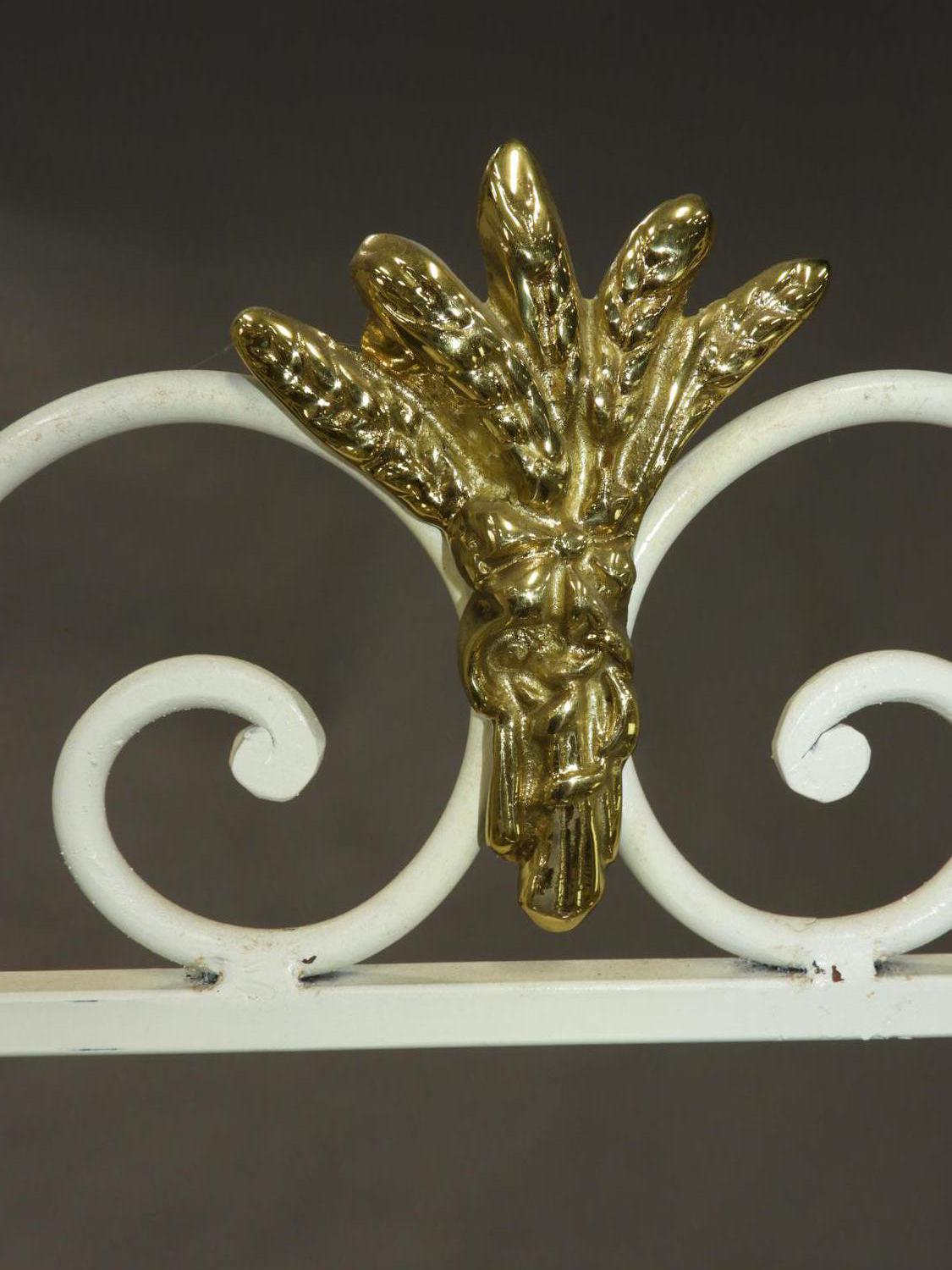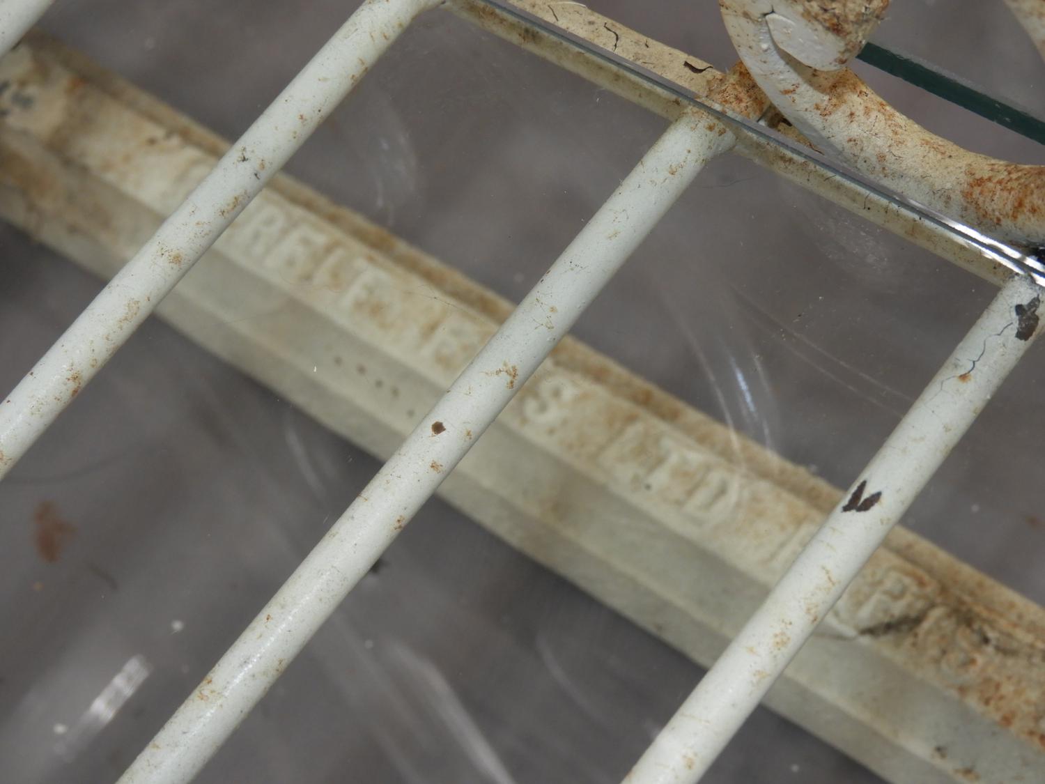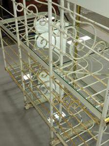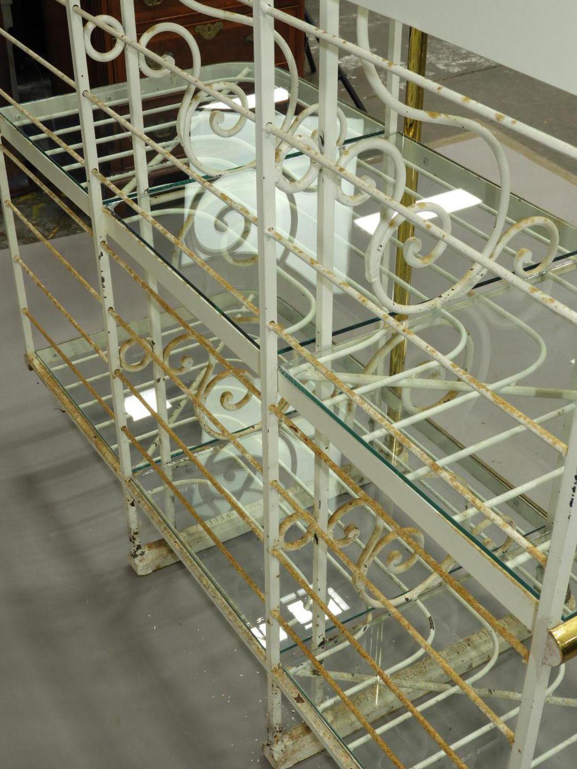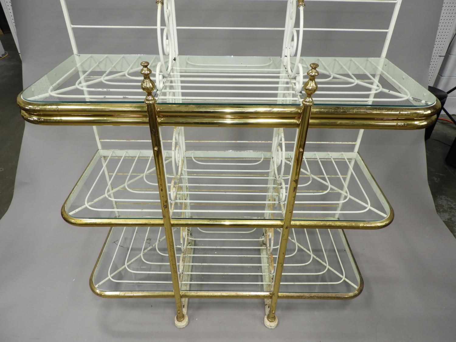 french brass and painted wrought iron bakers rack with glass shelves, stamped perfil fils ltd. paris france, 84" x 49" x 21"