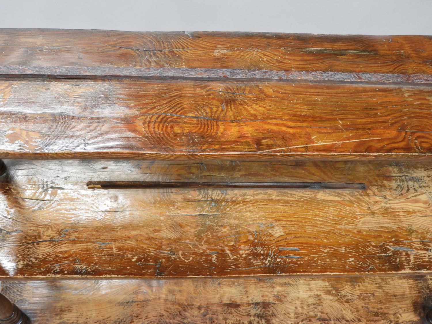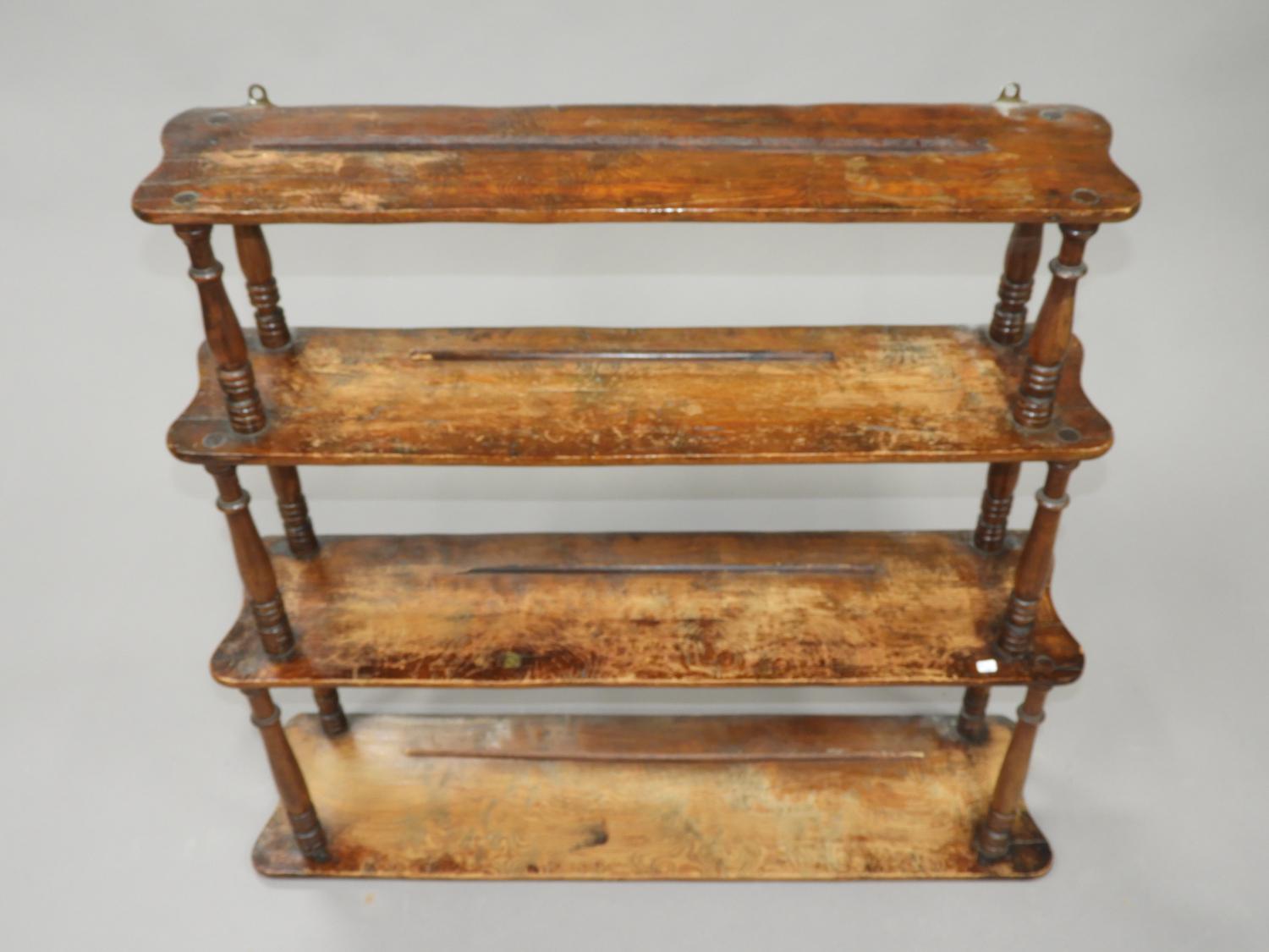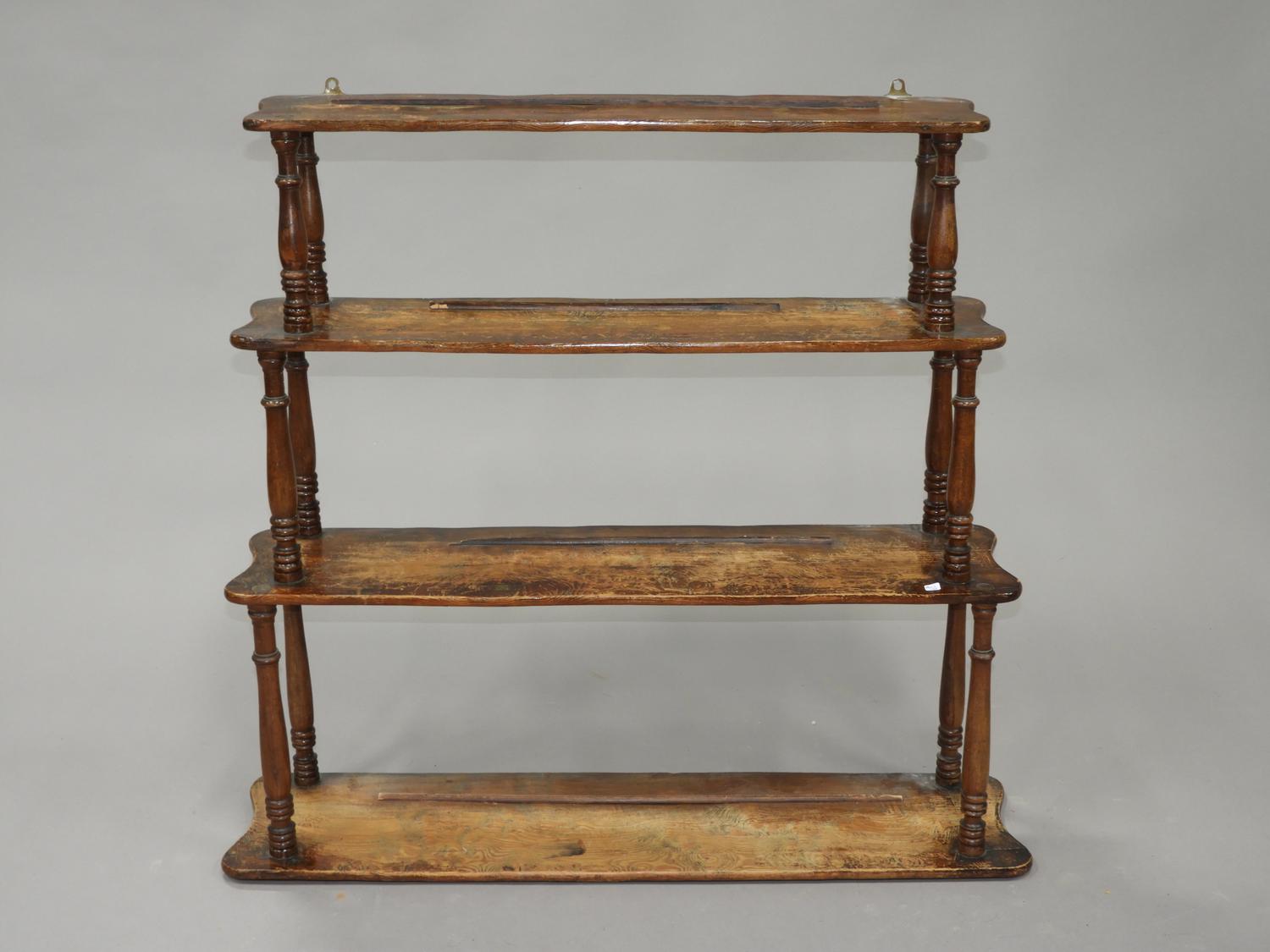 19th century four tier graduated wall shelf with turned stiles, bada sticker, 32" x 35" x 8 1/2"