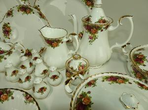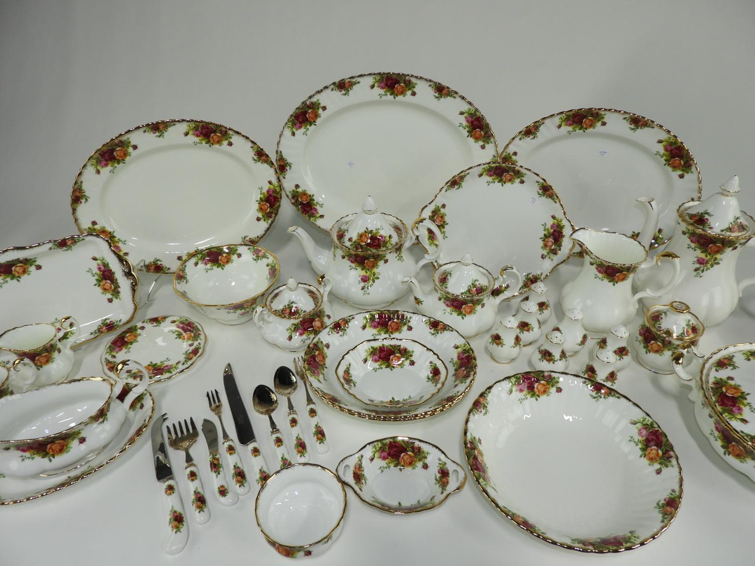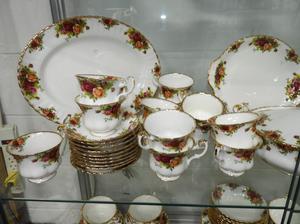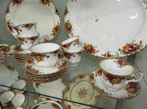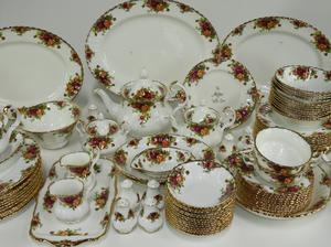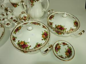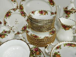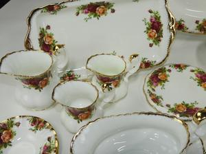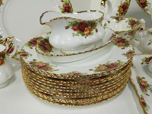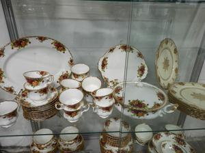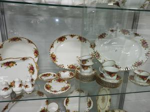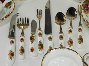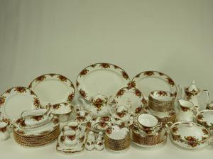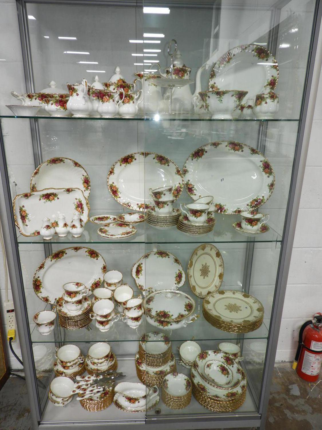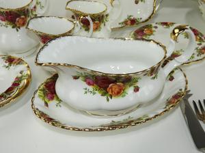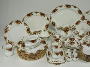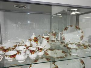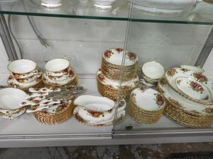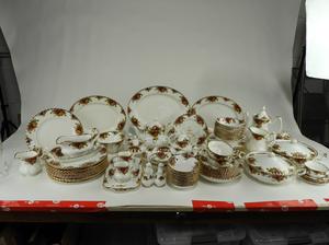 Large platter - 15" across2 medium platter, 13" across12 Dinner plates, dia 10 1/4"12 Salad plates, 8"12 Large bowls 6 1/4" diameter13 smaller bowls 5 1/2"12 Soups with plates13 Small dish, 6 1/4"2 Covered tureens with handles, 9" acrossBowl, 9 1/2"2 Oval bowls, 9 1/4"cutlery (3 cracked handles)3pc Coffee set3pc Tea set6 small dishesGravy boat with dish3 jugsI serving tier dishcoaster2 condiment bowls7 salt and pepperand20 teacups and saucersapprox 186pc