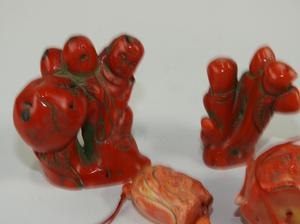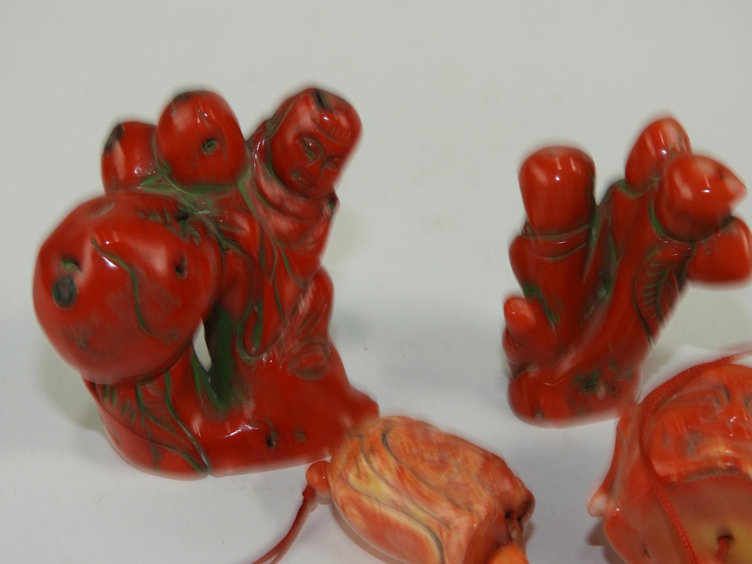 four carved 'coral'stone pendants and figures, 2 3/4" x 2 1/2" and smaller